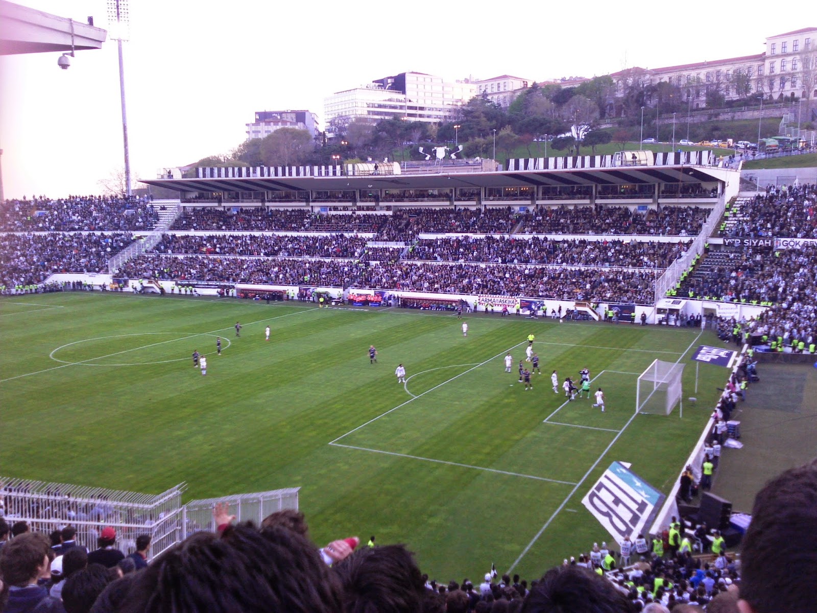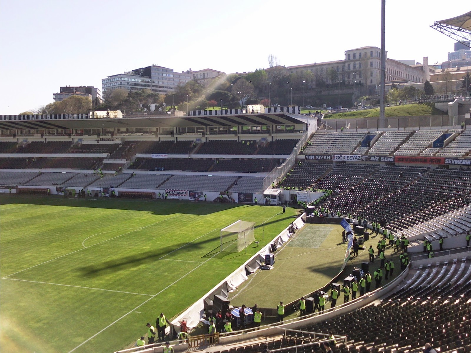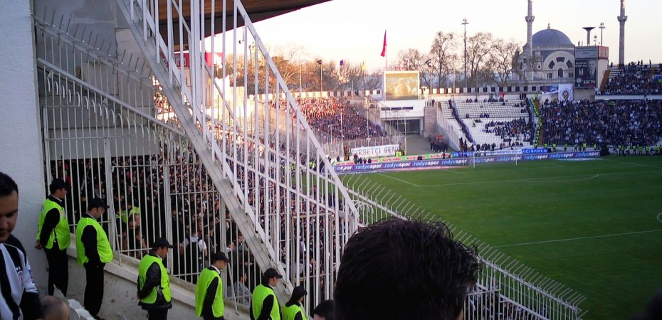 Auf der Fantribüne mit den drei Rängen kann man sich vollkommen frei bewegen, ein Großteil der Tribüne ist überdacht. Zu den Fans: Besiktas hat ja angeblich die linkesten Fans von Istanbul, was ich vom Habitus auch durchaus so sehen würde – allerdings mit dem kleinen Schönheitsfehler, dass am nächsten Tag der Eindruck bei Galatasaray nicht recht viel anders war. Irgendwie schauen sehr viele Türken und Türkinnen wie unsere BoBos aus dem 6. und 7. Bezirk aus. Einziger (augenscheinlicher) Unterschied ist, dass Besiktas einen Tick mehr Workingclass-Style hat. Problem ist halt ein bissl die Sprache – schon dumm, wenn man nicht versteht, was gesungen wird. Die Kurve macht fast neunzig Minuten durch Stimmung, sehr selten gibt es Stille. Beeindruckend sind einerseits die Wechselgesänge innerhalb der Fankurve, die echt was hergeben und andererseits auch jene mit den restlichen Tribünen, die bestens funktionieren.
