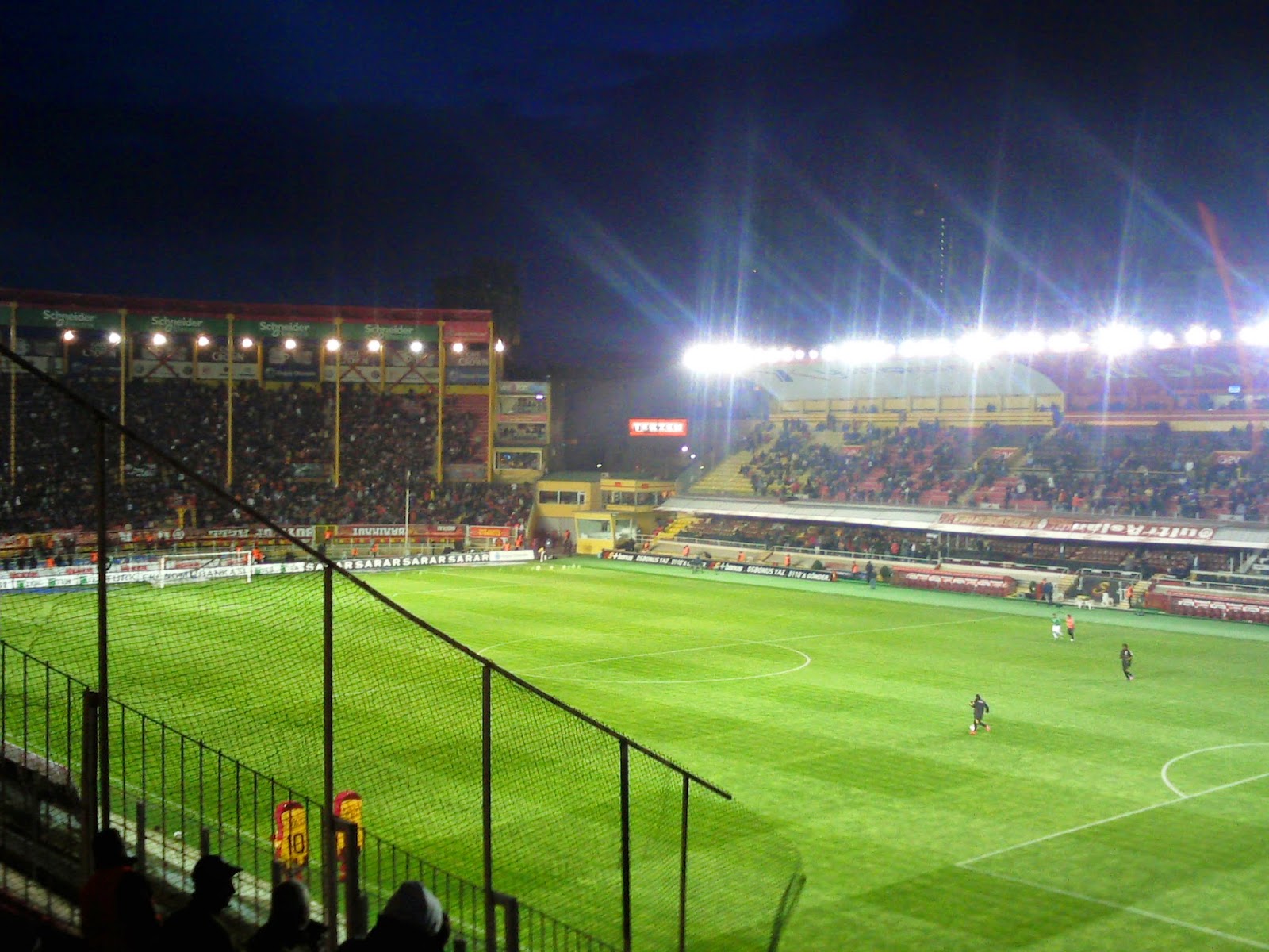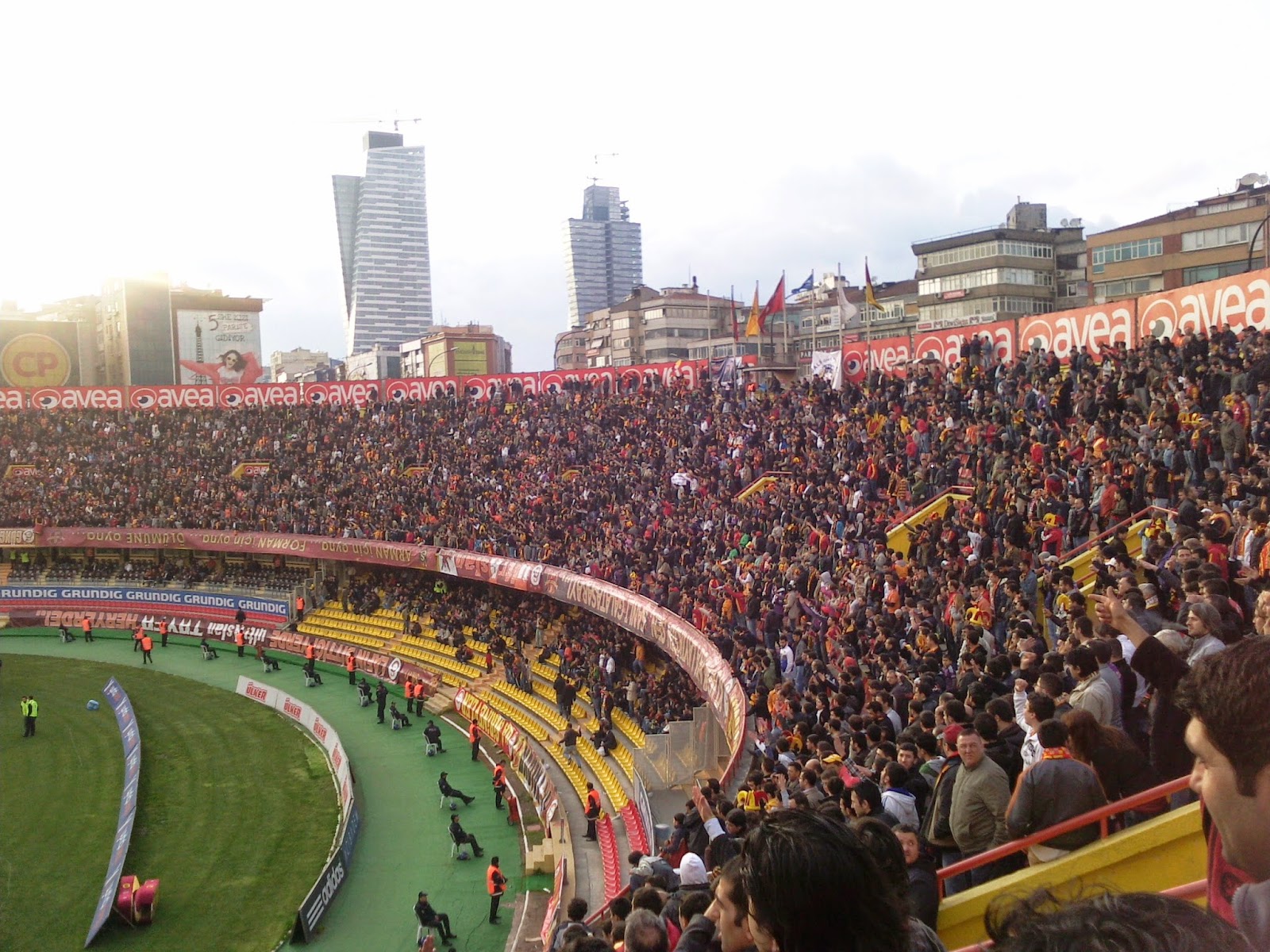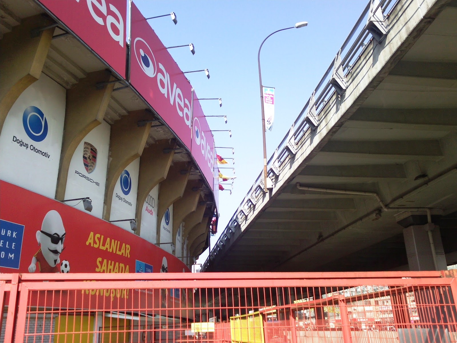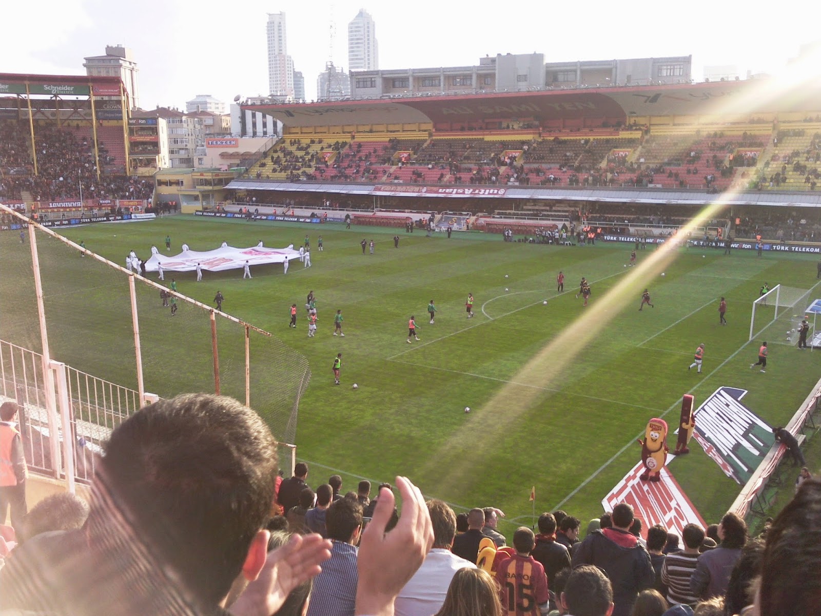 Ali Sami Yen liegt im Stadteil Sisli und ist nur zu finden, wenn man weiß, wo man suchen muss bzw. in der U-Bahn gleich den richtigen Aufgang erwischt. Es ist einerseits direkt in ein dicht besiedeltes Gebiet reingebaut, nur bei jenem Zugang, wo ich meine Karte für 18 TL (ca. 9 Euro) gekauft habe, führt eine mehrspurige Autobahn auf einer Hochtrasse vorbei. Der Eintritt ist noch ein bissl abenteuerlicher als im Inönü-Stadion, weil man vor den Drehkreuzen noch durch einen dicht an der Wand geführten Sicherheitszaun muss. Dafür sind die Sicherheitsleute um einiges freundlicher und die Durchsuchung nicht ganz so genau, wenn auch ausführlich. Mein Platz ist auf der einzigen nichtüberdachten Tribüne, scheinbar so was wie der zweite Fanblock. Der „Erste“ ist direkt gegenüber auf einer steil aufragenden überdachten Halbkurve, wo sich auch die Gästefans austoben.