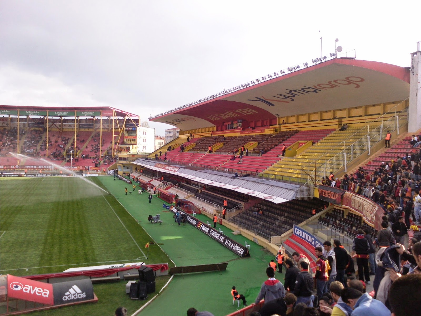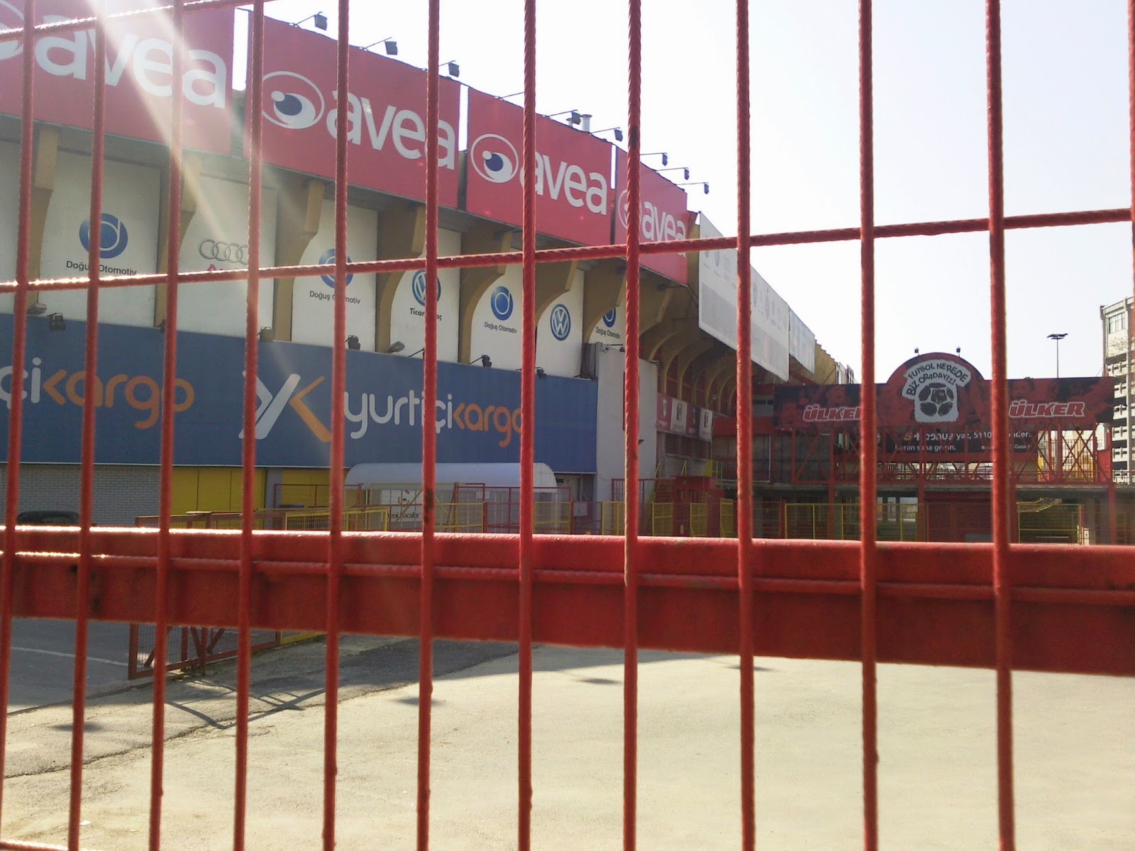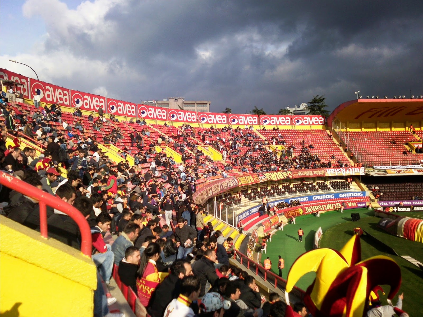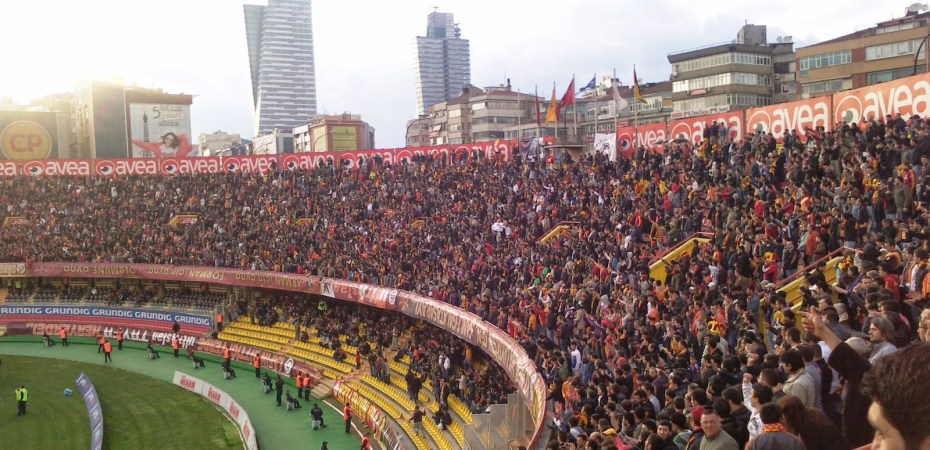 Ali Sami Yen liegt im Stadteil Sisli und ist nur zu finden, wenn man weiß, wo man suchen muss bzw. in der U-Bahn gleich den richtigen Aufgang erwischt. Es ist einerseits direkt in ein dicht besiedeltes Gebiet reingebaut, nur bei jenem Zugang, wo ich meine Karte für 18 TL (ca. 9 Euro) gekauft habe, führt eine mehrspurige Autobahn auf einer Hochtrasse vorbei. Der Eintritt ist noch ein bissl abenteuerlicher als im Inönü-Stadion, weil man vor den Drehkreuzen noch durch einen dicht an der Wand geführten Sicherheitszaun muss. Dafür sind die Sicherheitsleute um einiges freundlicher und die Durchsuchung nicht ganz so genau, wenn auch ausführlich. Mein Platz ist auf der einzigen nichtüberdachten Tribüne, scheinbar so was wie der zweite Fanblock. Der „Erste“ ist direkt gegenüber auf einer steil aufragenden überdachten Halbkurve, wo sich auch die Gästefans austoben.