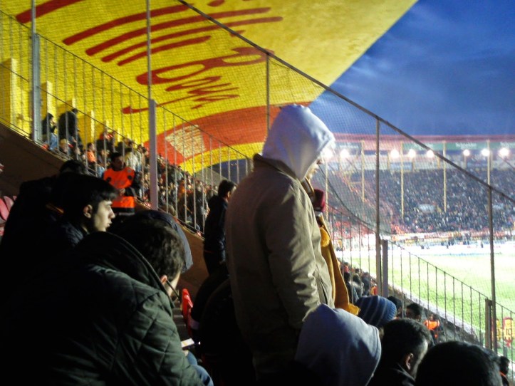 Aber wie schon bei Besiktas stehen auch hier die Fans eigentlich während des gesamten Matches, sowohl auf beiden Fankurven, als auch auf der Geraden zu meiner Linken. Das heißt, sie stehen fast die ganzen 90 Minuten: Vor dem Spiel ist schon unglaublich viel Stimmung, wobei zu meiner Verwunderung die Heimmannschaft ausgebuht und die Gästemannschaft mit frenetischem Applaus begrüßt wird. Das geht sogar soweit, dass die Gäste (immerhin die „kurdische“ Mannschaft in der Türkei) von beiden Fantribünen herbeigesungen wird. Das Angebot nehmen die aufwärmenden Spieler auch gern an und holen sich ihre Ovationen in beiden Kurven ab.