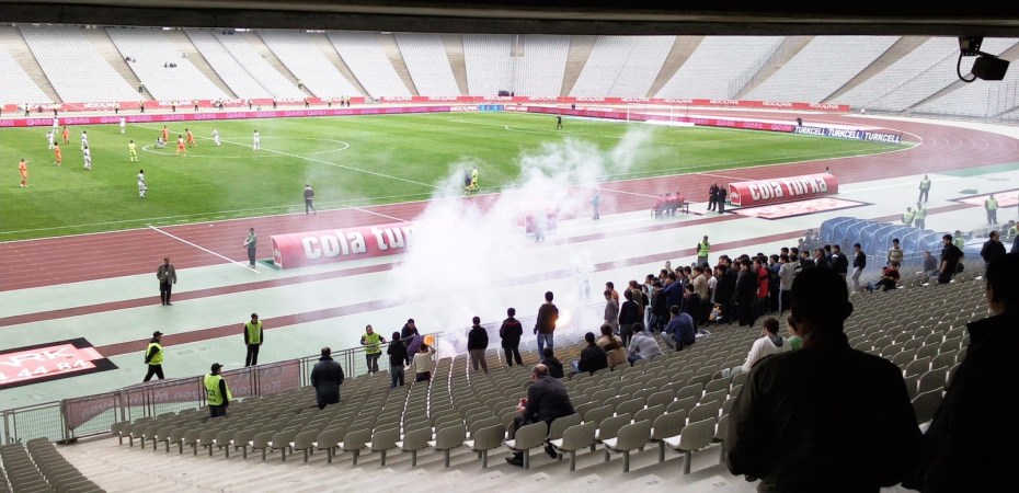 Von außen schaut es echt geil aus, so ein bissl wie das alte Münchner Olympiastadion. Erster Rang ist in die Erde reingebaut, auf beiden Geraden erhebt sich darüber ein geschwungener zweiter Rang, auf der Haupttribüne sind dazwischen noch die VIP-Logen. Andrang zum Spiel ist nicht gerade groß, das merkt man unter anderem auch an der gähnenden Leere auf den riesigen Parkplätzen vor dem Stadion. Karte kostet 20 TL (10 Euro), also doch recht geschmalzen für türkische Verhältnisse. Rund eineinhalb Stunden vor Anpfiff teile ich mir das Stadion mit vielleicht 20 anderen Menschen, wenn man mal von den Ordnern (mit Schlagstöcken!) und Polizisten, die doch in großer Anzahl vorhanden sind, absieht. Bis zum Beginn des Spiels finden sich (gezählte) 20 Auswärtsfans auf der Gegengeraden und geschätzte 120 Heimzuschauer ein – ich bereite mich auf ein Spiel ohne Stimmung vor.