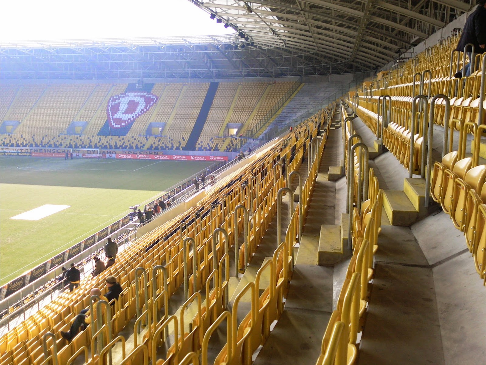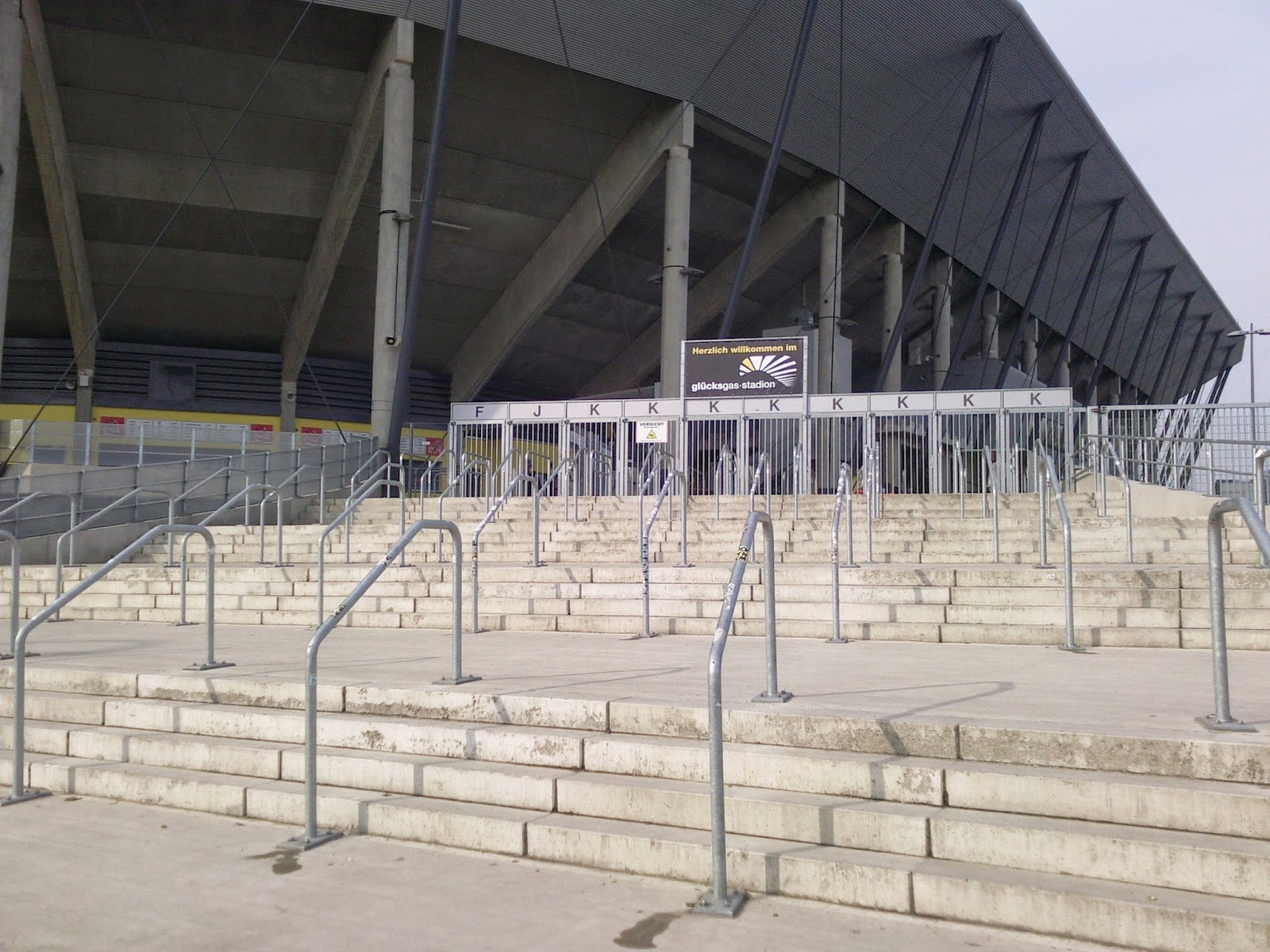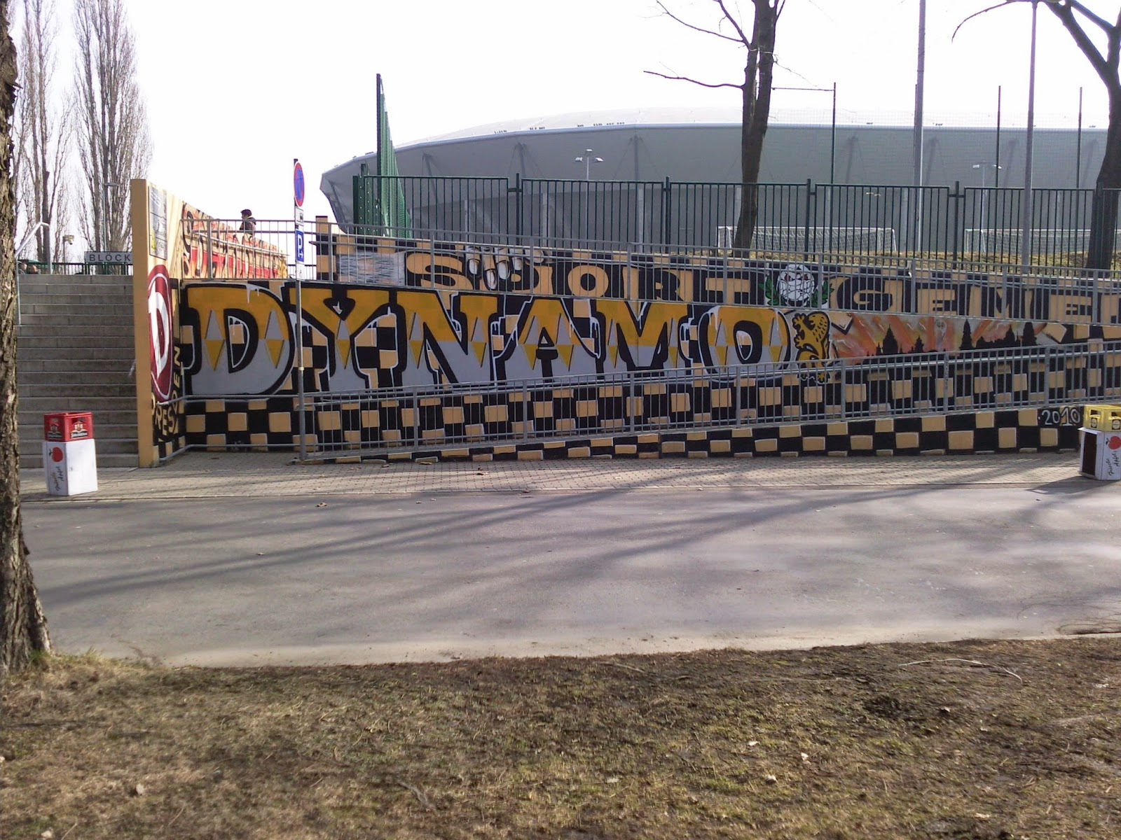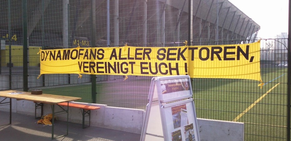 Praktischerweise liegt das Rudolf-Harbig-Stadion („Für immer und ewig“, wie auf dem Bild mit den „Dynamo“-Sitzen auf dem Transpi steht), das ja nun Glücksgas-Stadion heißt, direkt neben dem Museum, so dass es von der Hand Gottes zu den Niederungen der dritten Liga nur ein Katzensprung ist. Von außen sieht das Stadion jedenfalls – schon zuvor befürchtet – wie aus dem üblichen „Ich bau mir dann ein Stadion“-Baukasten entsprungenes kleineres Ungetüm aus und erinnert in der Form ein bissl an das Kärntner „Ufo“.