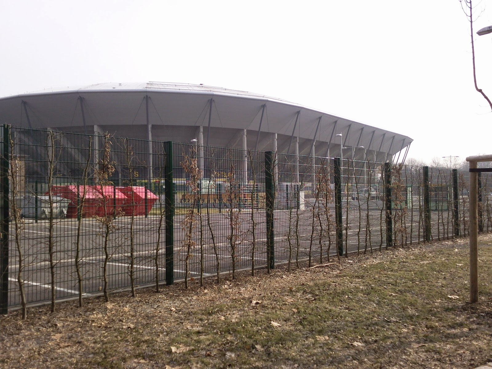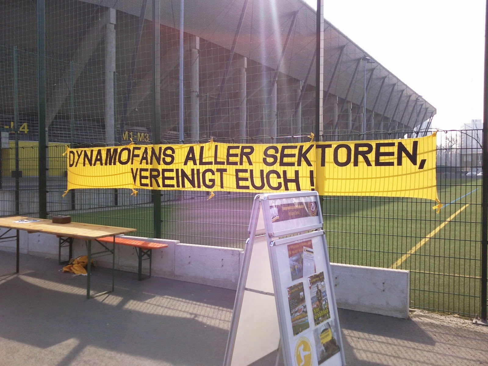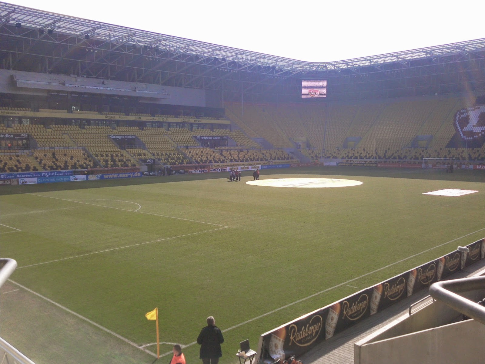 Praktischerweise liegt das Rudolf-Harbig-Stadion („Für immer und ewig“, wie auf dem Bild mit den „Dynamo“-Sitzen auf dem Transpi steht), das ja nun Glücksgas-Stadion heißt, direkt neben dem Museum, so dass es von der Hand Gottes zu den Niederungen der dritten Liga nur ein Katzensprung ist. Von außen sieht das Stadion jedenfalls – schon zuvor befürchtet – wie aus dem üblichen „Ich bau mir dann ein Stadion“-Baukasten entsprungenes kleineres Ungetüm aus und erinnert in der Form ein bissl an das Kärntner „Ufo“.