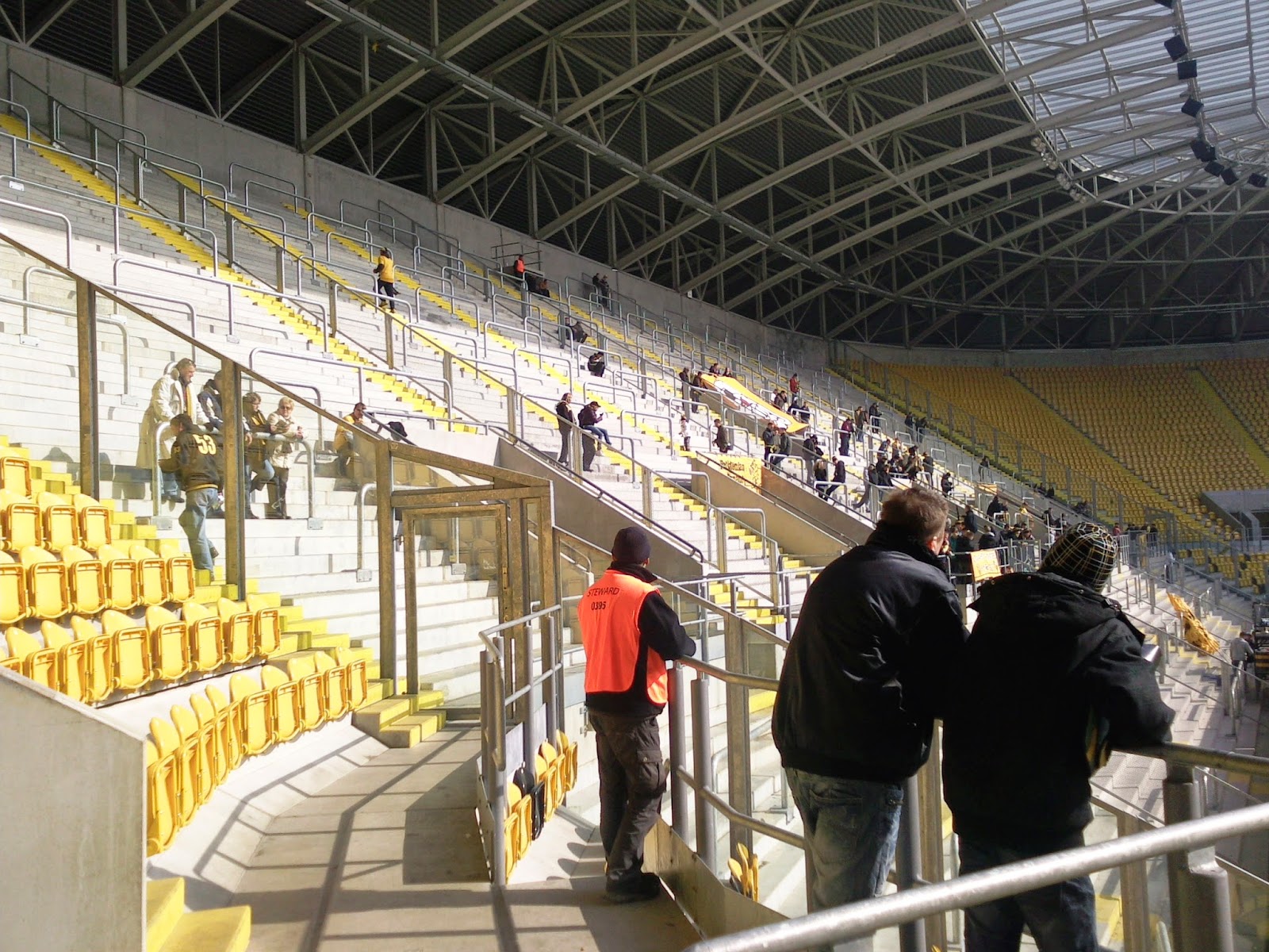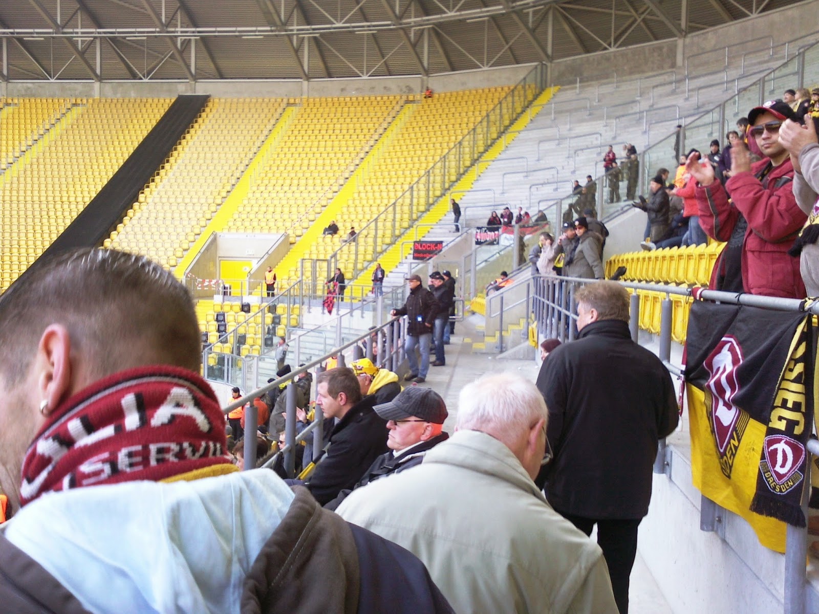 Zum Spiel: Von den Fangesängen lässt sich leider wenig begeistertes sagen, denn eigentlich haben die Dynamo-Fans nichts wirklich Herausragendes zu bieten. Ist halt die übliche, Ultra-dominierte Gesangspalette, die es in abgewandelter Form auch in vielen anderen Stadien zu hören gibt. Einzig die Dynamo-Wechselgesänge und das Vereinslied sind wirklich nett. Besonders ist wohl aber die Ausstattung eines durchschnittlichen Haupttribünen-Besuchers, wo wirklich nur ein verschwindend kleiner Teil nicht irgendeine Dynamo-Devotionalie auf dem Kopf oder Leib hat – ist ganz auf Dresscode Fantribüne.
