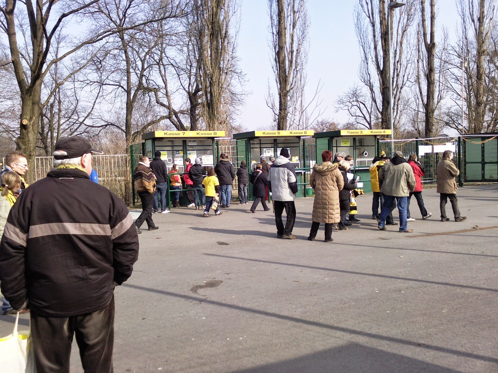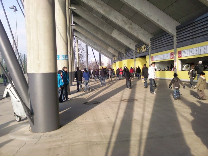 Dennoch hat die Architektur schon seinen Reiz, vor allem die Innenausstattung ist find ich echt gelungen: Die große, steile Stehplatztribüne (Block K) für 9.000 Dynamo-Fans kommt schon mächtig rüber. Einzig über die Pausengestaltung der Fans von der Haupttribüne (auf der ich meine Karte habe), scheinen sich die Gestalter eher weniger Gedanken gemacht haben. Nur zwei Klos führen jedenfalls dazu, dass ich den Großteil der 15 Minuten in der Schlange zum Pissoir verbringe. Dafür darf ich dann das nächste Getränk mit der obligatorischen „Dynamo-Card“ bargeldlos beziehen – juhuuu!