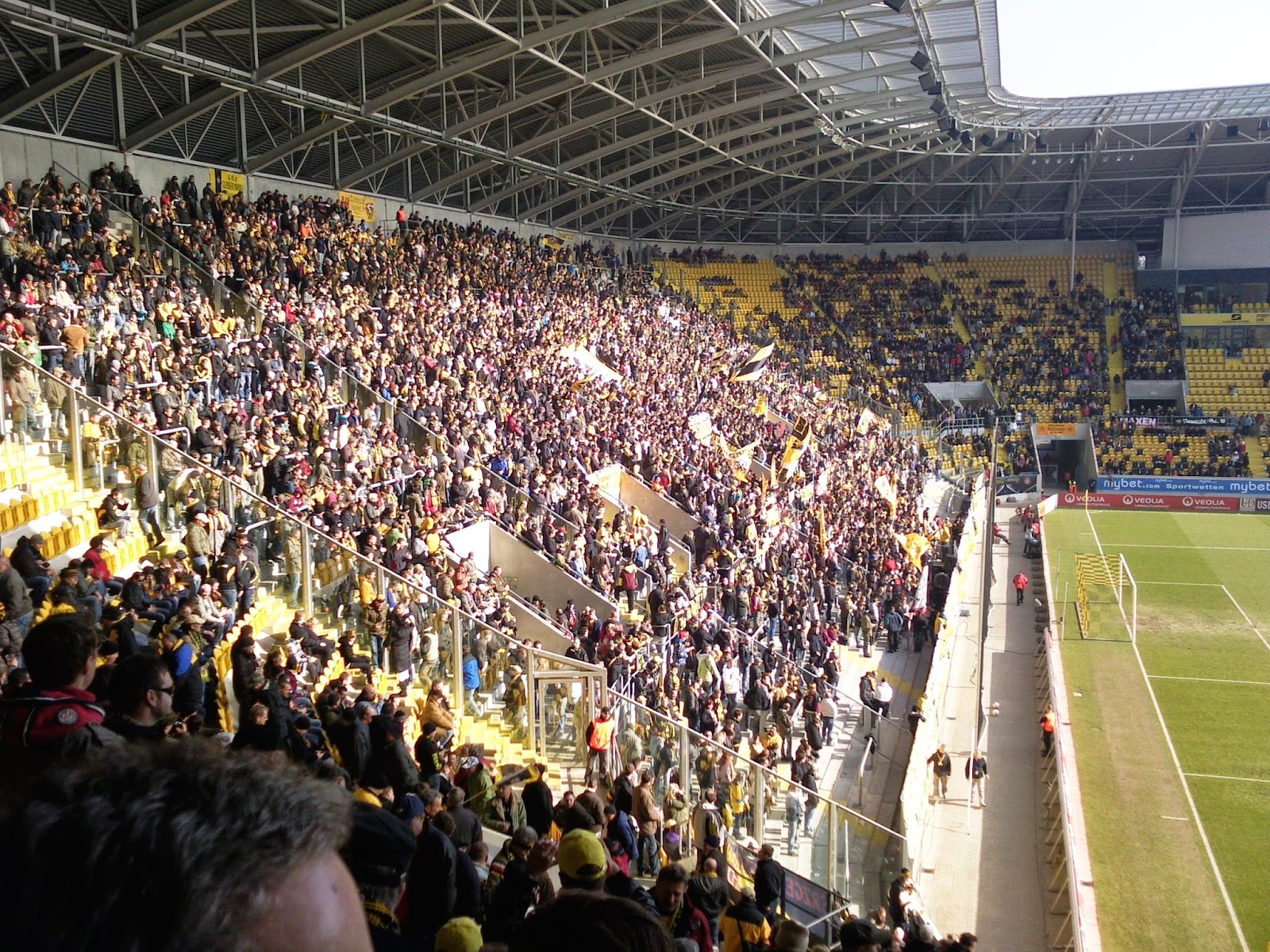 Diese starke Verbundenheit zeigt sich dann auch positiv bei den, schon erwähnten, Wechselgesängen – wo die ganze Haupttribüne mitgeht- und generell bei der Sangesfreude der Sitzer. Vielleicht würden die noch 16.000 (auf ein ausverkauftes Haus) fehlenden Besucher dann echt eine Gänsehautstimmung verursachen. Kleines Detail am Rande: Der Sachse schimpft am Fußballplatz wie der gelernte Wiener und hört sich überraschenderweise dabei auch ziemlich ähnlich an – hab mich jedenfalls mehrmals an die Osttribüne bei der Austria erinnert gefühlt.