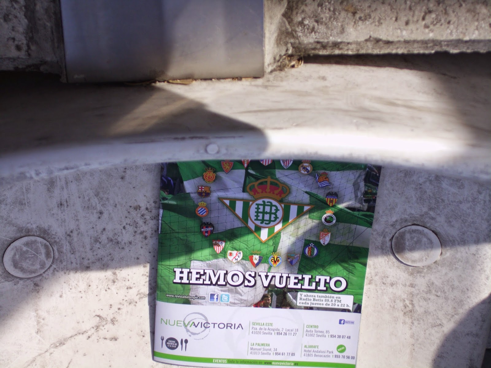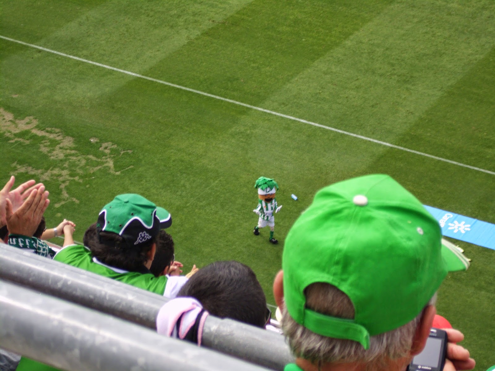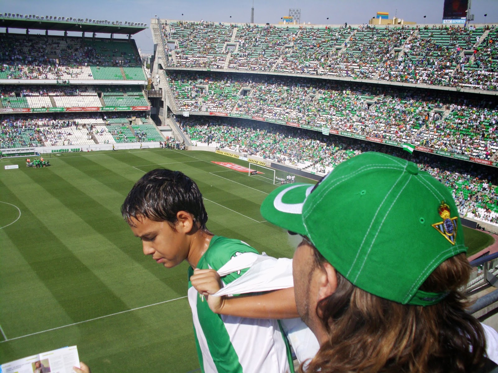 Da der spanische Fußballverband das Match in einer der heißesten Städte Europas um 12 Uhr angesetzt hat, schaffe ich es noch vor meinem Abflug, die zweite erstklassige Mannschaft Sevillas zu sehen – und das noch dazu bei der ersten Heimpartie nach dem erfolgreichen Wiederaufstieg. Das Motto des Stadionheftes ist dementsprechend auch „Wir sind wieder zurück!“. Jedenfalls ist ein Anpfiff um 12 Uhr bei herunterknallender Sonne und 29 Grad (wie eine Anzeige vor dem Stadion bestätigt) hochkriminell – ich halte es gerade einmal 25 Minuten auf meinem Sitz aus, dann brauch ich mal eine Abkühlung auf dem WC, wo ich dann auch einen (ziemlich sicher ob der Sonne) ins Urinal kotzenden Fan treffe.
