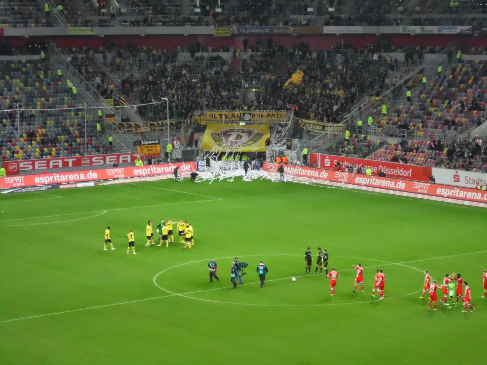 Die Mannschaft zahlt den Fans die Bombenstimmung auch dementsprechend zurück, indem sie bereits in der 21. Minute in Führung geht. Kurz vor der Pause fällt dann aber in einem Spiel auf sehr hohem Niveau das 1:1 für Dresden. Der Druck der Fortuna wird zwar in der zweiten Halbzeit immer stärker, aber der Sieg will bis lange in die Nachspielzeit nicht gelingen. Als dann in der 92. Minute (bei zwei angezeigten Nachspielminuten) mit der letzten Chance das 2:1 fällt, explodiert die Stimmung noch einmal – mindestens 15 Minuten lang wird die Mannschaft nach dem Spiel noch frenetisch gefeiert. Wochenendauftakt, was willst du mehr!!!!