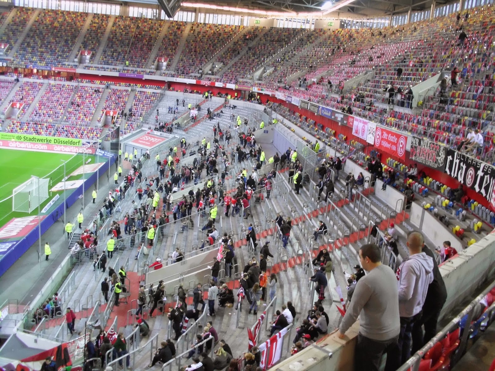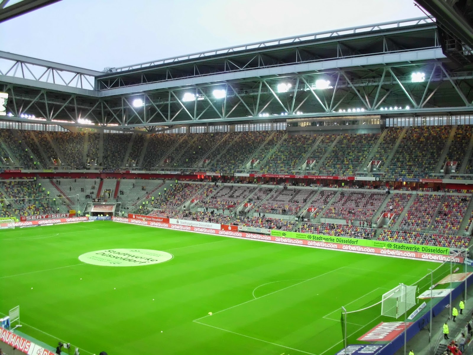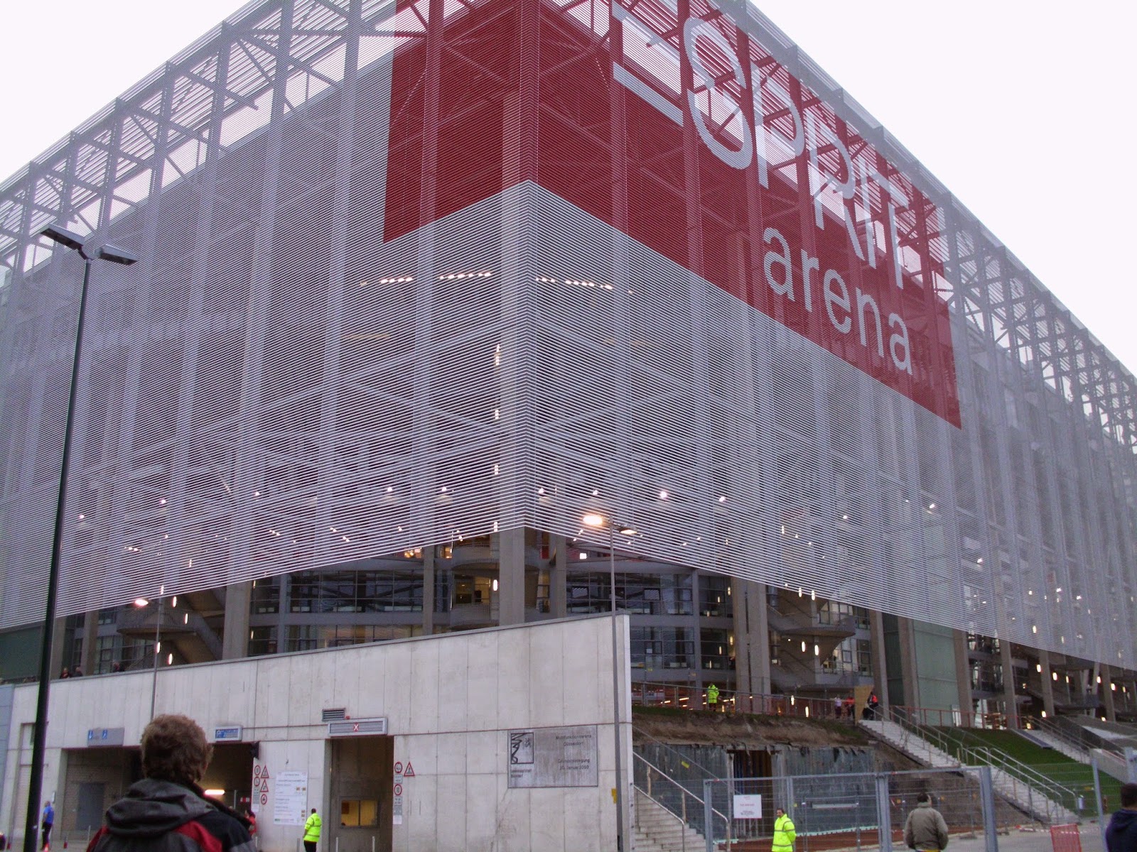 Die Arena zu Düsseldorf verstrahlt mal sicher alles andere als ihren Namen – nämlich „Esprit“. Von weitem kaum auszumachen, sieht sie, wenn man davor steht, wie ein grässlicher Block aus, der nur dazu geschaffen wurde, um Werbung für die namensgebende Firma zu machen. Auch beim Eintritt wird der Eindruck nicht besser, es fühlt sich an, als ob man in ein riesiges Kinozentrum gehen würde anstatt in ein Stadion. Durch die „Verhüllung“ sind alle Merkmale die einem Stadion von außen eigen sind (Hinteransicht der Tribünen, aber auch die Lichtmasten) eliminiert – und innen wird die sterile Stimmung leider fortgesetzt. Zum Glück ist aber das Dach offen, wodurch man wenigstens nicht das Gefühl hat, einfach nur in einer großen Mehrzweckhalle zu sitzen.