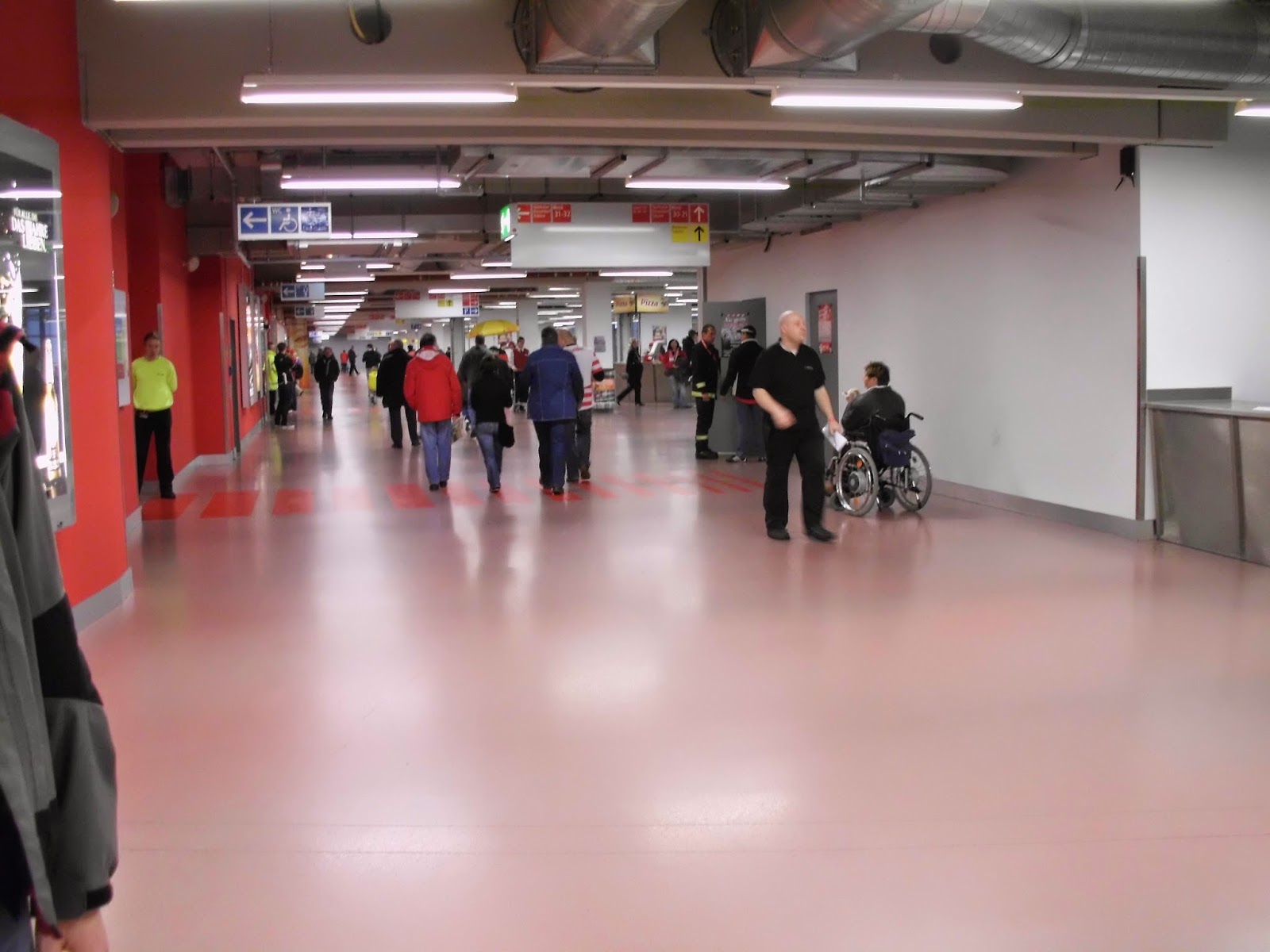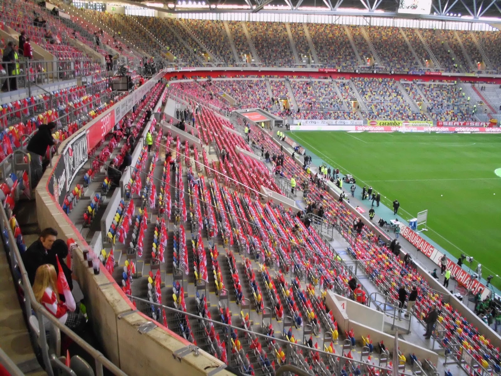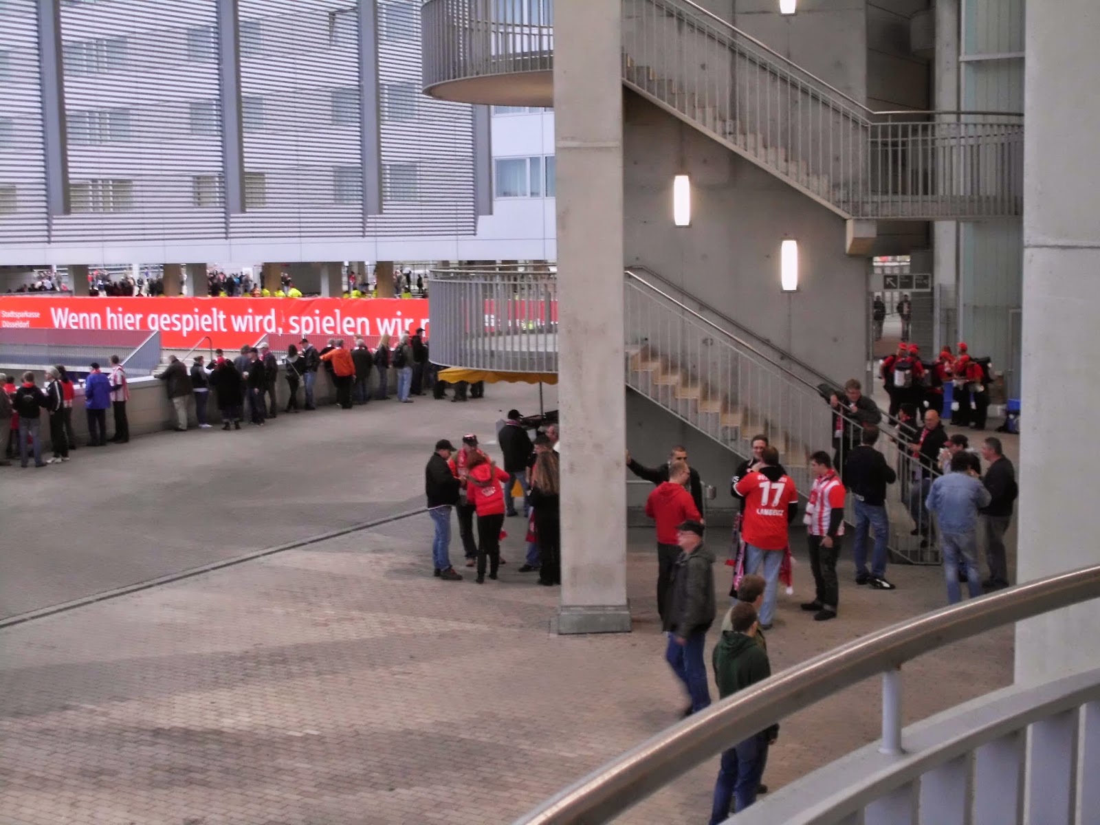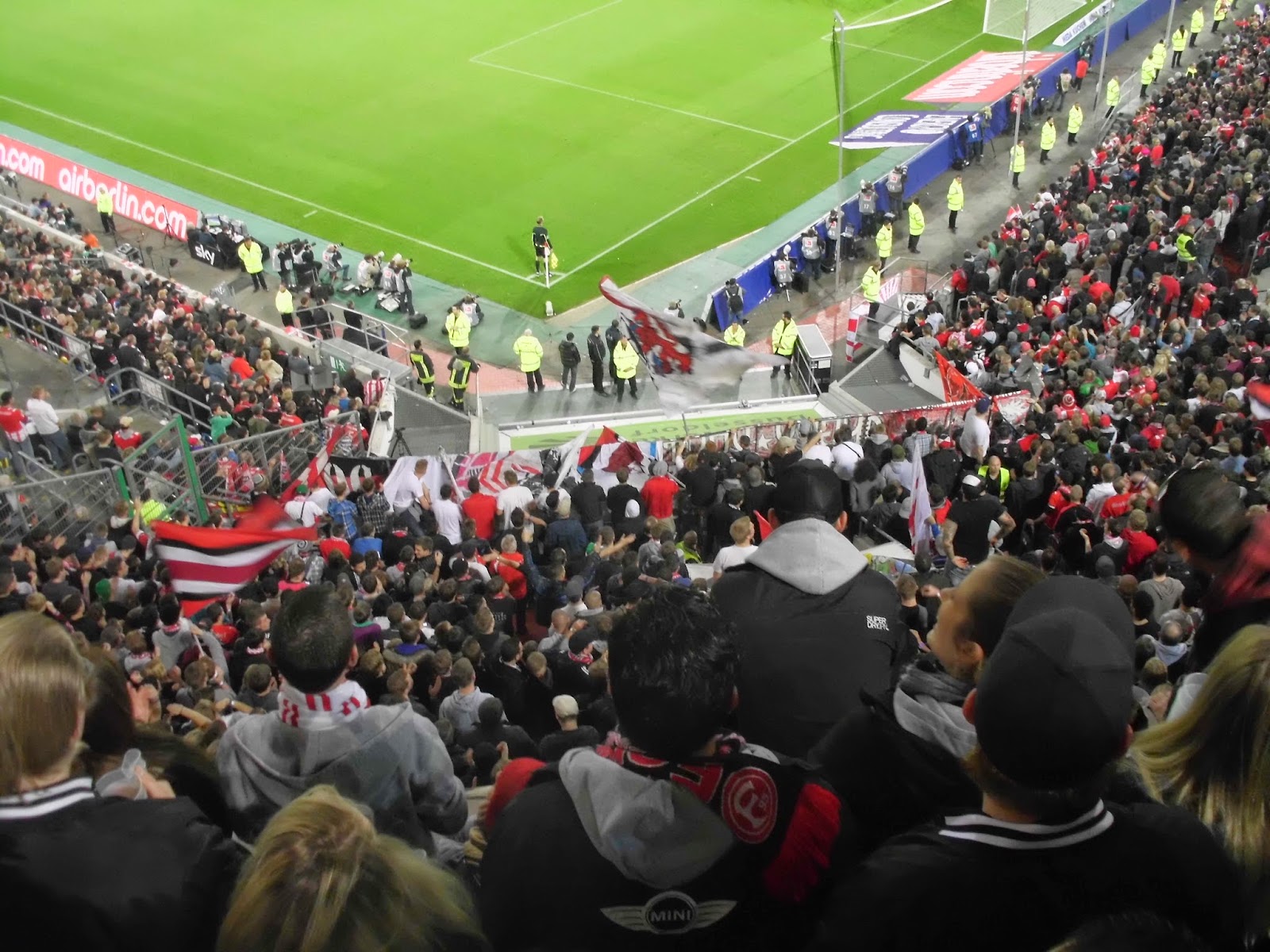 Die Arena zu Düsseldorf verstrahlt mal sicher alles andere als ihren Namen – nämlich „Esprit“. Von weitem kaum auszumachen, sieht sie, wenn man davor steht, wie ein grässlicher Block aus, der nur dazu geschaffen wurde, um Werbung für die namensgebende Firma zu machen. Auch beim Eintritt wird der Eindruck nicht besser, es fühlt sich an, als ob man in ein riesiges Kinozentrum gehen würde anstatt in ein Stadion. Durch die „Verhüllung“ sind alle Merkmale die einem Stadion von außen eigen sind (Hinteransicht der Tribünen, aber auch die Lichtmasten) eliminiert – und innen wird die sterile Stimmung leider fortgesetzt. Zum Glück ist aber das Dach offen, wodurch man wenigstens nicht das Gefühl hat, einfach nur in einer großen Mehrzweckhalle zu sitzen.
