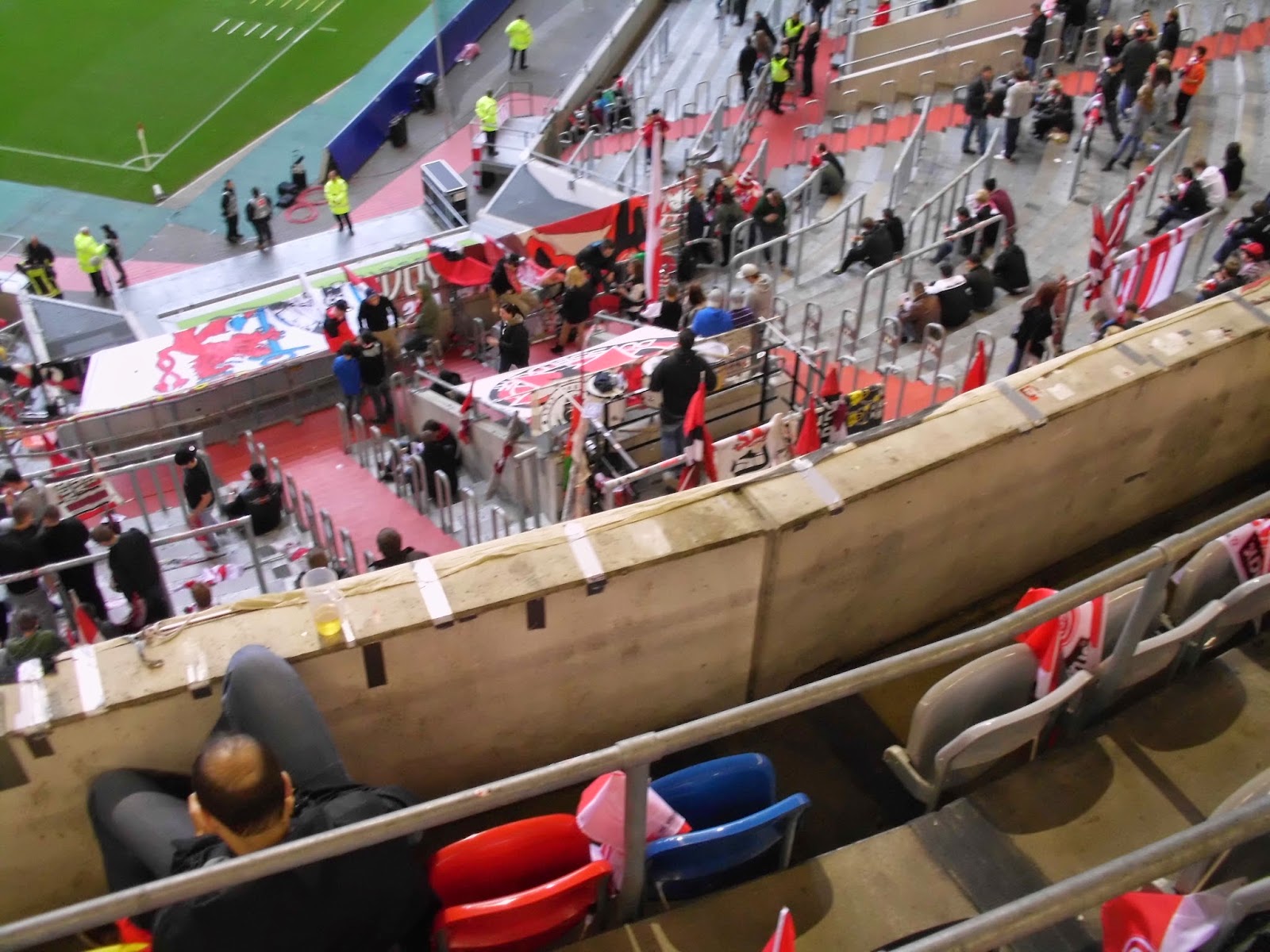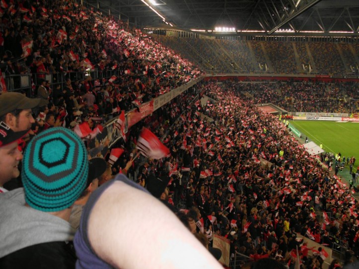 Nun aber genug des Negativen: Abgesehen vom fragwürdigen Stadion hat sich der Besuch des Spiels mal hundertprozentig ausgezahlt. Die 32.300 Fans (darunter wohl leider nur so 900 aus Dresden – wobei da nicht klar war, ob wirklich alle angereisten auch ins Stadion durften) machen von Beginn an wirklich sehr gute Stimmung, die sich dann teilweise auf fantastisch (und fanatisch) steigert. Abwechslungsreiche und kreative Gesänge lassen immer wieder Stimmung aufkommen – am geilsten wird das ganze aber, als die Fans in der Südkurve zum Zählen beginnen: „50 oleee, 51 oleee, 52 oleeee – oleee, oleee – 53 oleeee, 54 oleeee, 55 oleee usw.“ bei dem immer mehr Zuschauer auf den anderen Rängen aufstehen, mitklatschen und –singen, um dann bei „88 oleee, 89 oleee“ das ganze Stadion auf den Beinen zu haben.