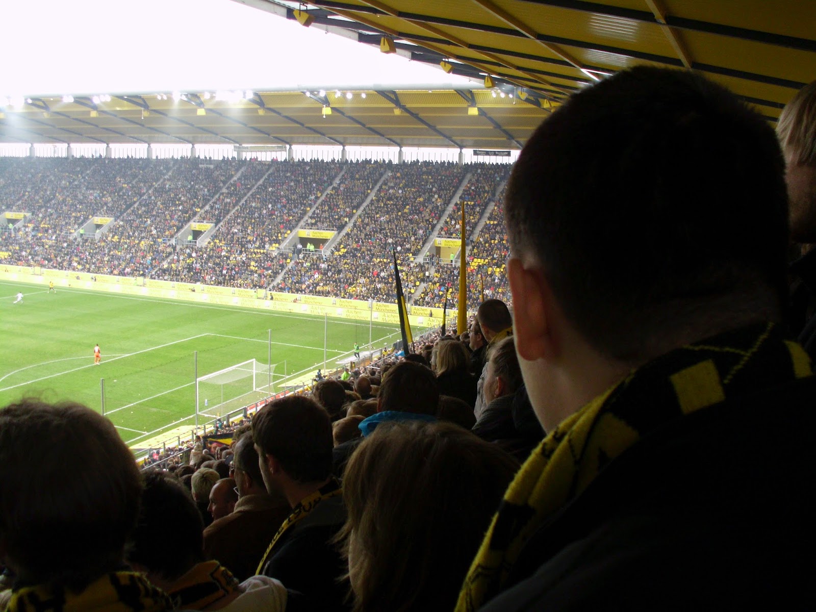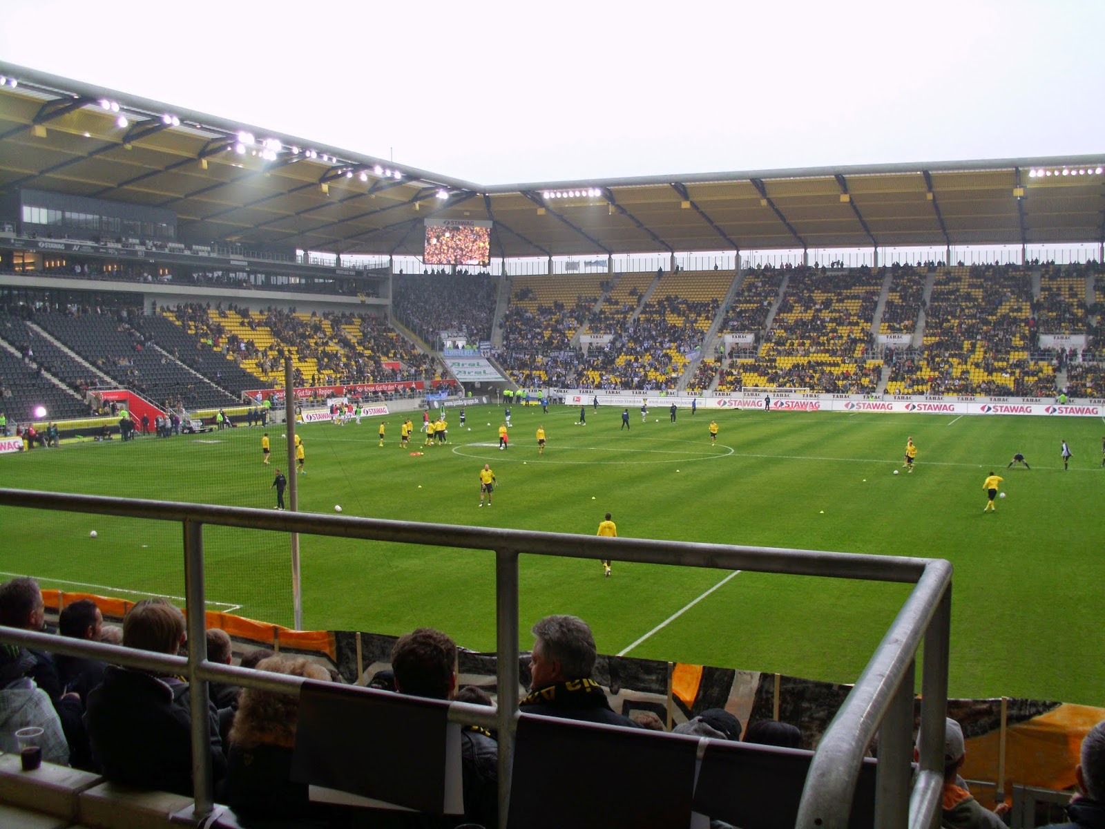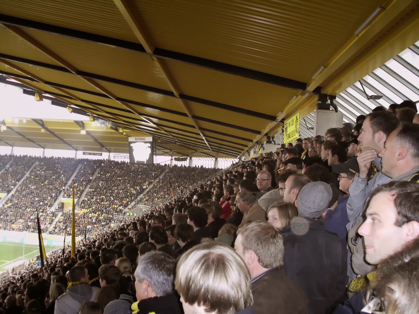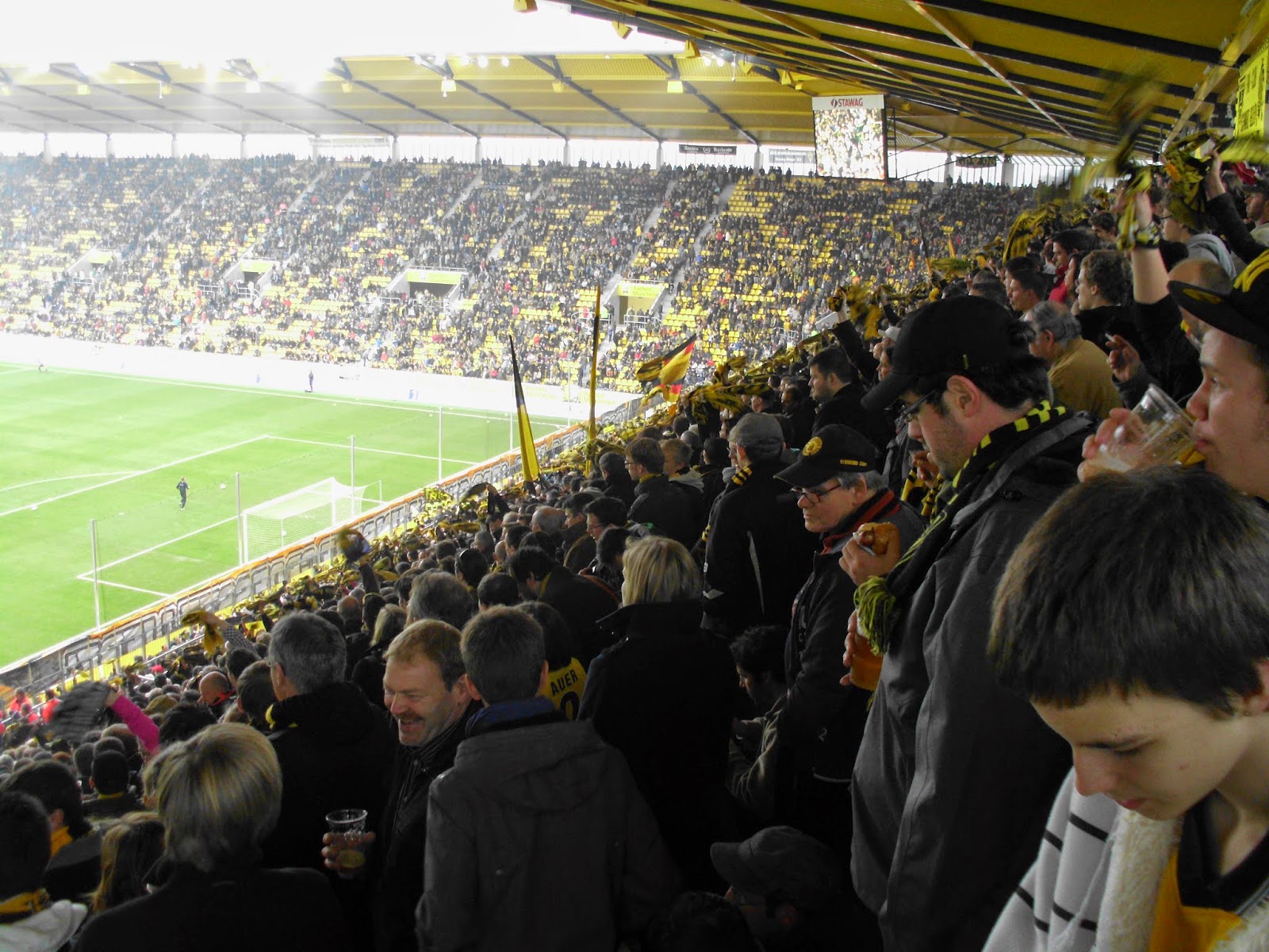 Durch ein kleines Missverständnis beim Anmarsch kommen wir erst ziemlich kurz vor Anpfiff ins Stadion, dass mit 30.180 Zuschauern – darunter wohl 4.000 Fans aus Duisburg – ausverkauft ist. Das führt auf der Stehplatz-Tribüne – dem „Bitburger Wall“, der gegenüber der „Tobaco Land Tribüne“ liegt – zwar nicht zu besten Sichtverhältnissen, aber die Stimmung, die anfangs echt bombastisch ist, kriegt man freilich dennoch mit. Das ganze Stadion singt, klatscht und springt zu echt gut ausgewählten Gassenhauern wie „Sweet Caroline“ etc. In Minute fünf folgt zudem auch noch das 1:0 für die Schwarz-Gelben, was ja eigentlich die Stimmung zum Überkochen bringen müsste – dem ist aber leider nicht so. Nach und nach passt sich die Atmosphäre nämlich dem Spiel an: mau wie der Abstiegskampf pur.