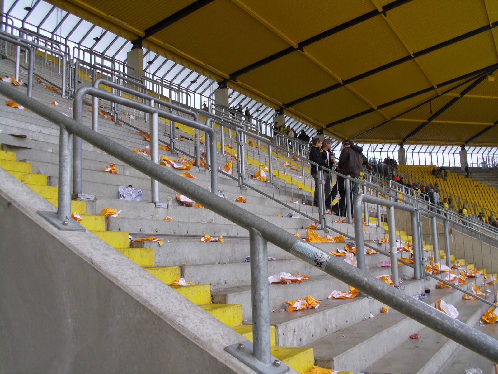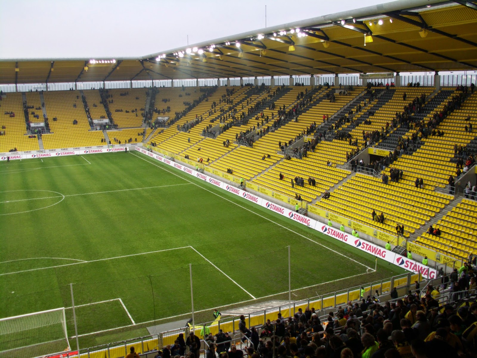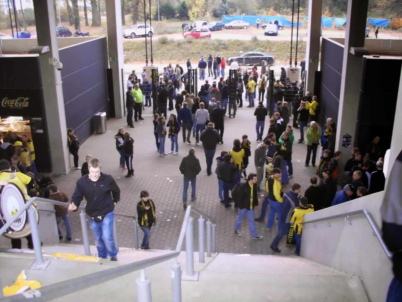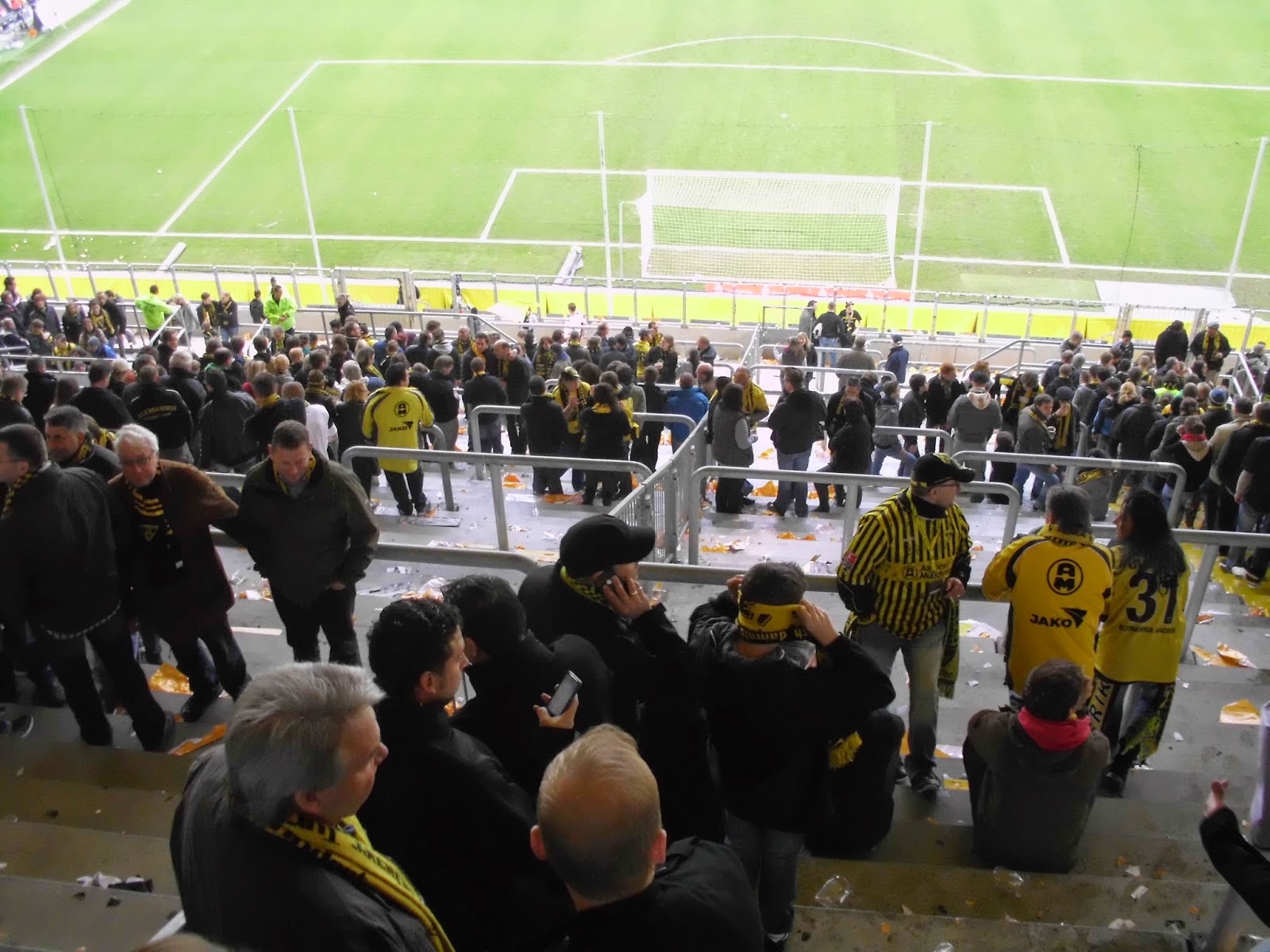 Durch ein kleines Missverständnis beim Anmarsch kommen wir erst ziemlich kurz vor Anpfiff ins Stadion, dass mit 30.180 Zuschauern – darunter wohl 4.000 Fans aus Duisburg – ausverkauft ist. Das führt auf der Stehplatz-Tribüne – dem „Bitburger Wall“, der gegenüber der „Tobaco Land Tribüne“ liegt – zwar nicht zu besten Sichtverhältnissen, aber die Stimmung, die anfangs echt bombastisch ist, kriegt man freilich dennoch mit. Das ganze Stadion singt, klatscht und springt zu echt gut ausgewählten Gassenhauern wie „Sweet Caroline“ etc. In Minute fünf folgt zudem auch noch das 1:0 für die Schwarz-Gelben, was ja eigentlich die Stimmung zum Überkochen bringen müsste – dem ist aber leider nicht so. Nach und nach passt sich die Atmosphäre nämlich dem Spiel an: mau wie der Abstiegskampf pur.