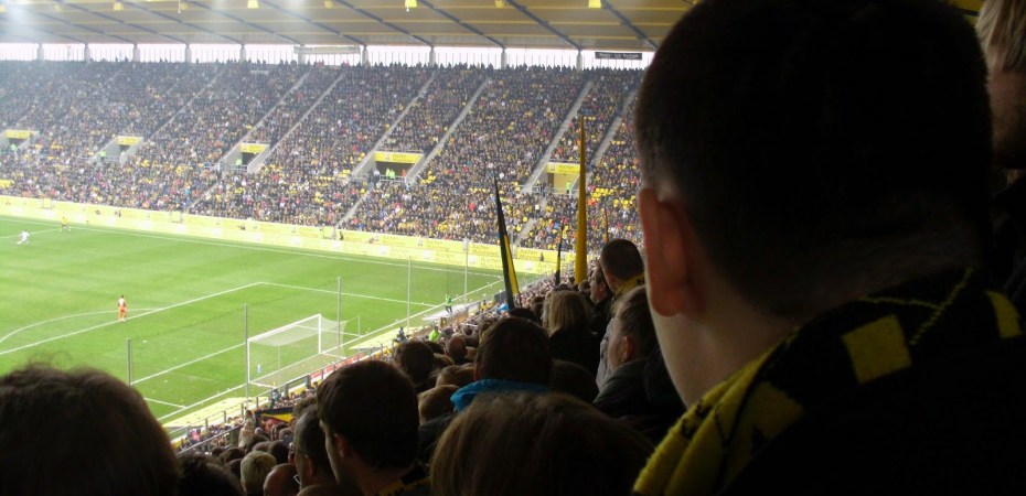 Durch ein kleines Missverständnis beim Anmarsch kommen wir erst ziemlich kurz vor Anpfiff ins Stadion, dass mit 30.180 Zuschauern – darunter wohl 4.000 Fans aus Duisburg – ausverkauft ist. Das führt auf der Stehplatz-Tribüne – dem „Bitburger Wall“, der gegenüber der „Tobaco Land Tribüne“ liegt – zwar nicht zu besten Sichtverhältnissen, aber die Stimmung, die anfangs echt bombastisch ist, kriegt man freilich dennoch mit. Das ganze Stadion singt, klatscht und springt zu echt gut ausgewählten Gassenhauern wie „Sweet Caroline“ etc. In Minute fünf folgt zudem auch noch das 1:0 für die Schwarz-Gelben, was ja eigentlich die Stimmung zum Überkochen bringen müsste – dem ist aber leider nicht so. Nach und nach passt sich die Atmosphäre nämlich dem Spiel an: mau wie der Abstiegskampf pur.