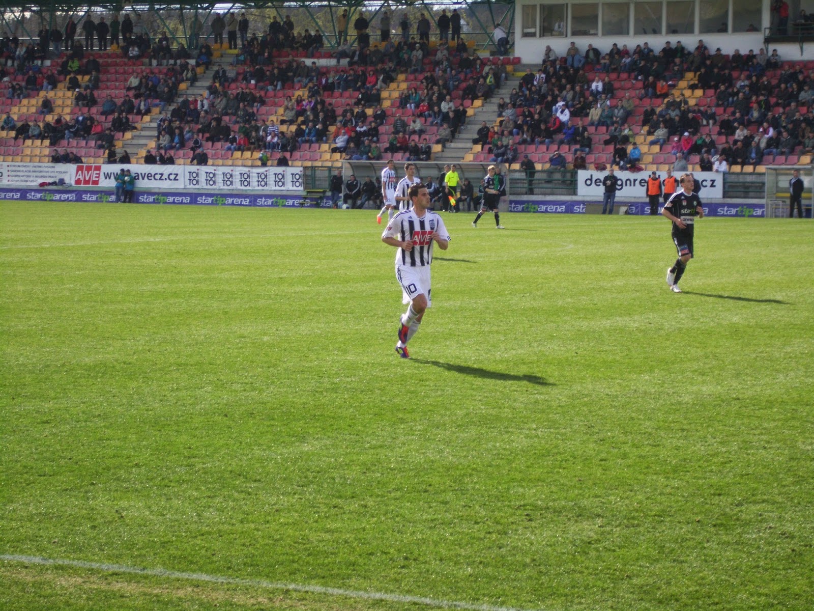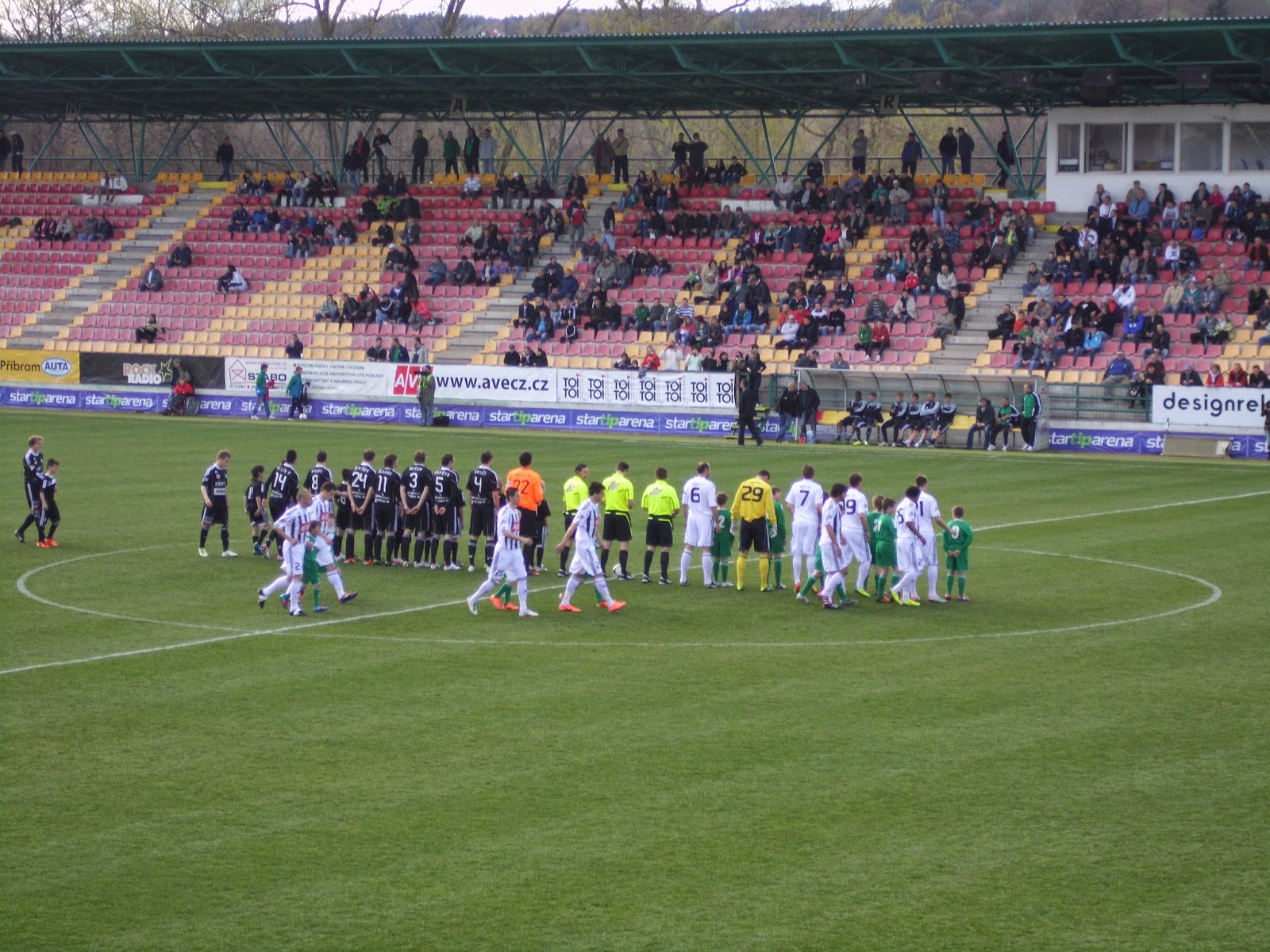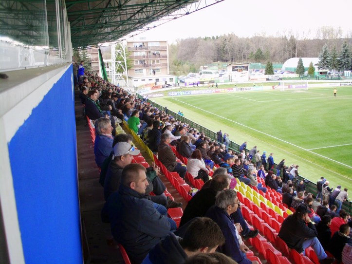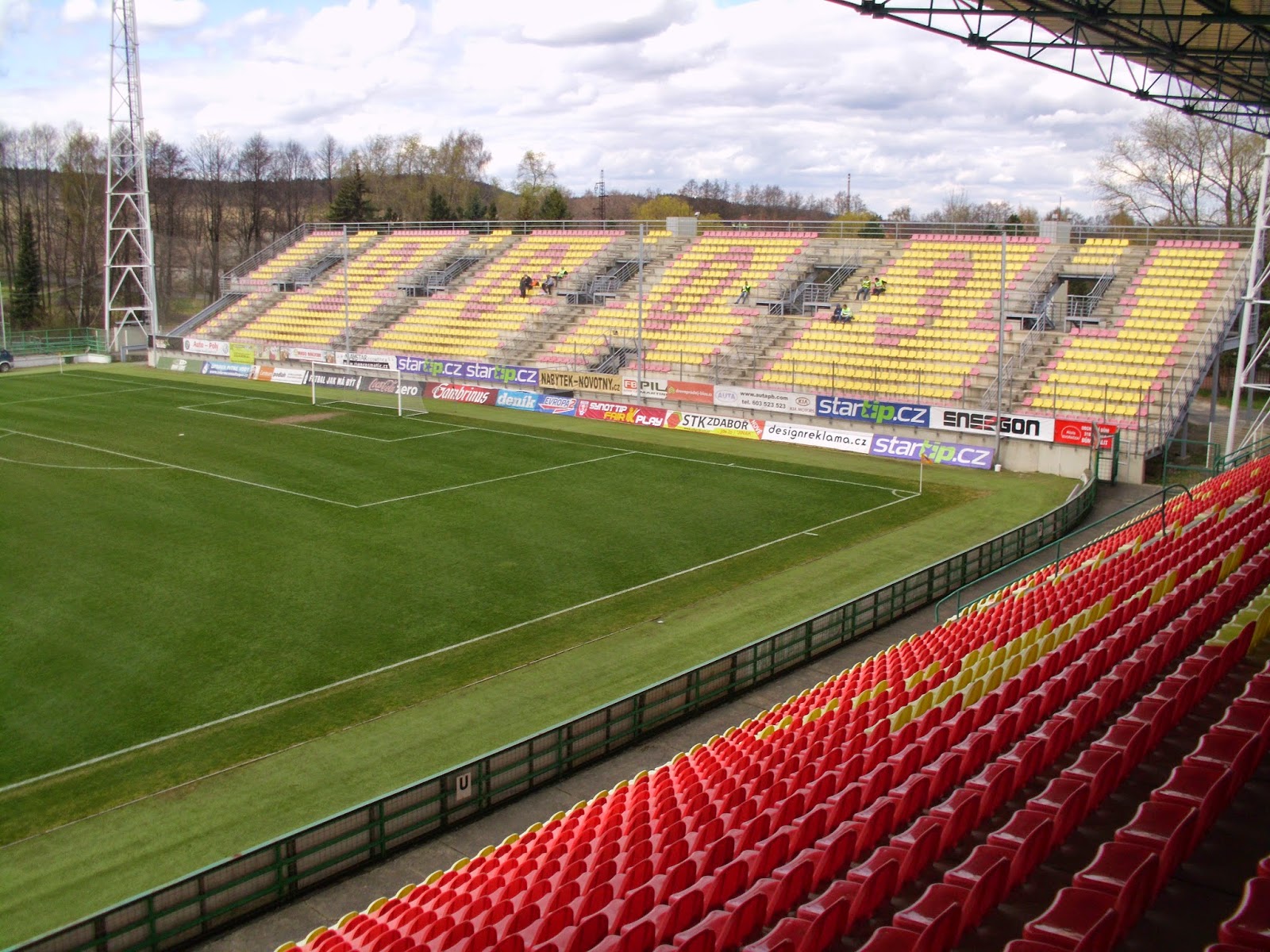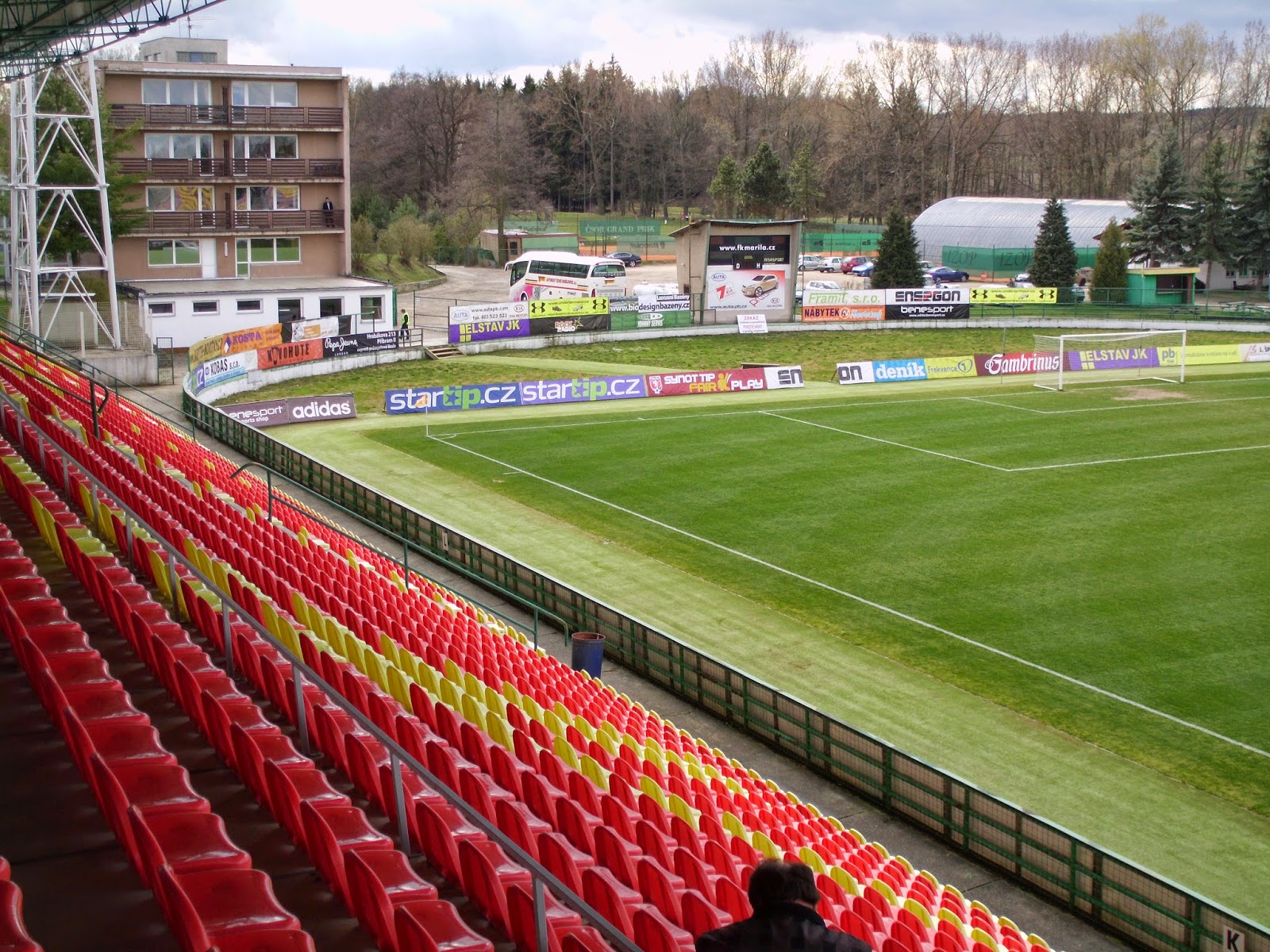 Das Stadion – die „startip arena“ – befindet sich etwas abseits der Stadt mitten in einer Schrebergartensiedlung und kündigt sich bereits durch die Flutlichtmasten an. Es besteht aus drei Tribünen, wobei die Haupttribüne – wie am Vortag bei Dukla – in einen Hügel hineingebaut wurde, hat aber bei weitem nicht die gigantischen Dimensionen aus Prag.