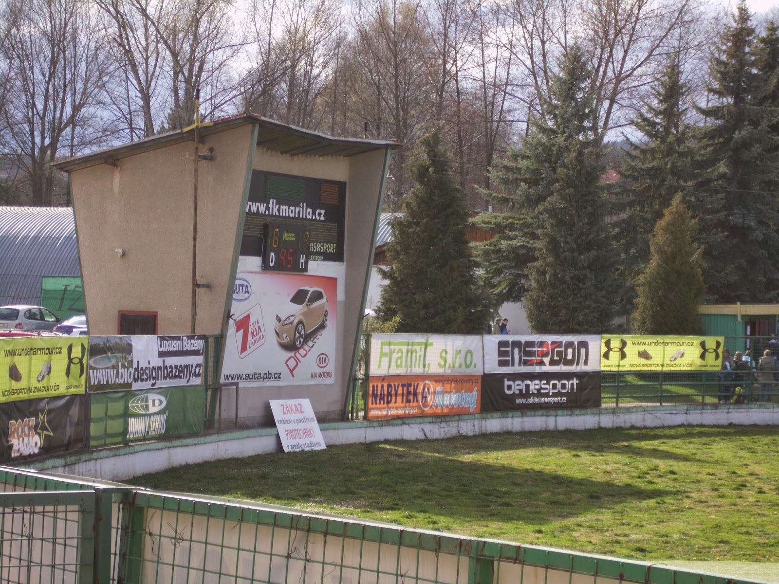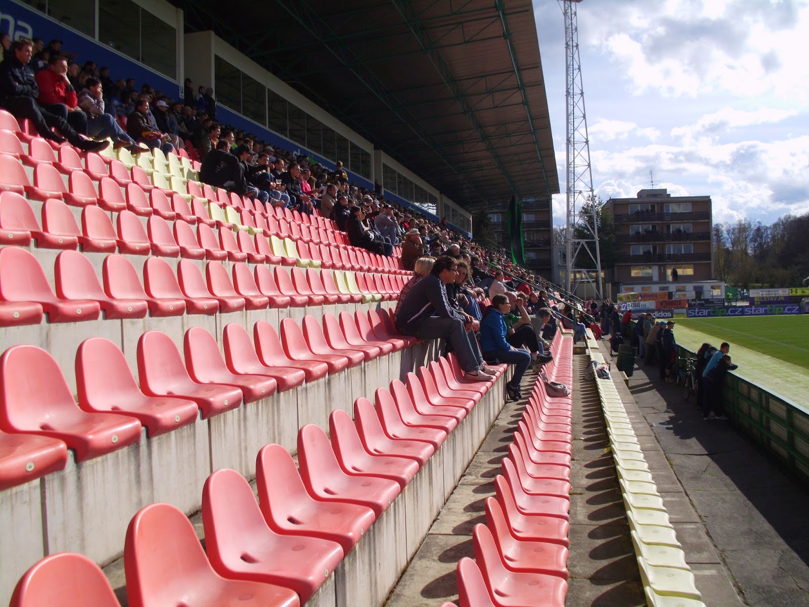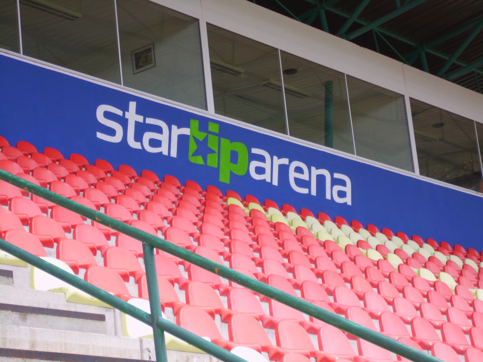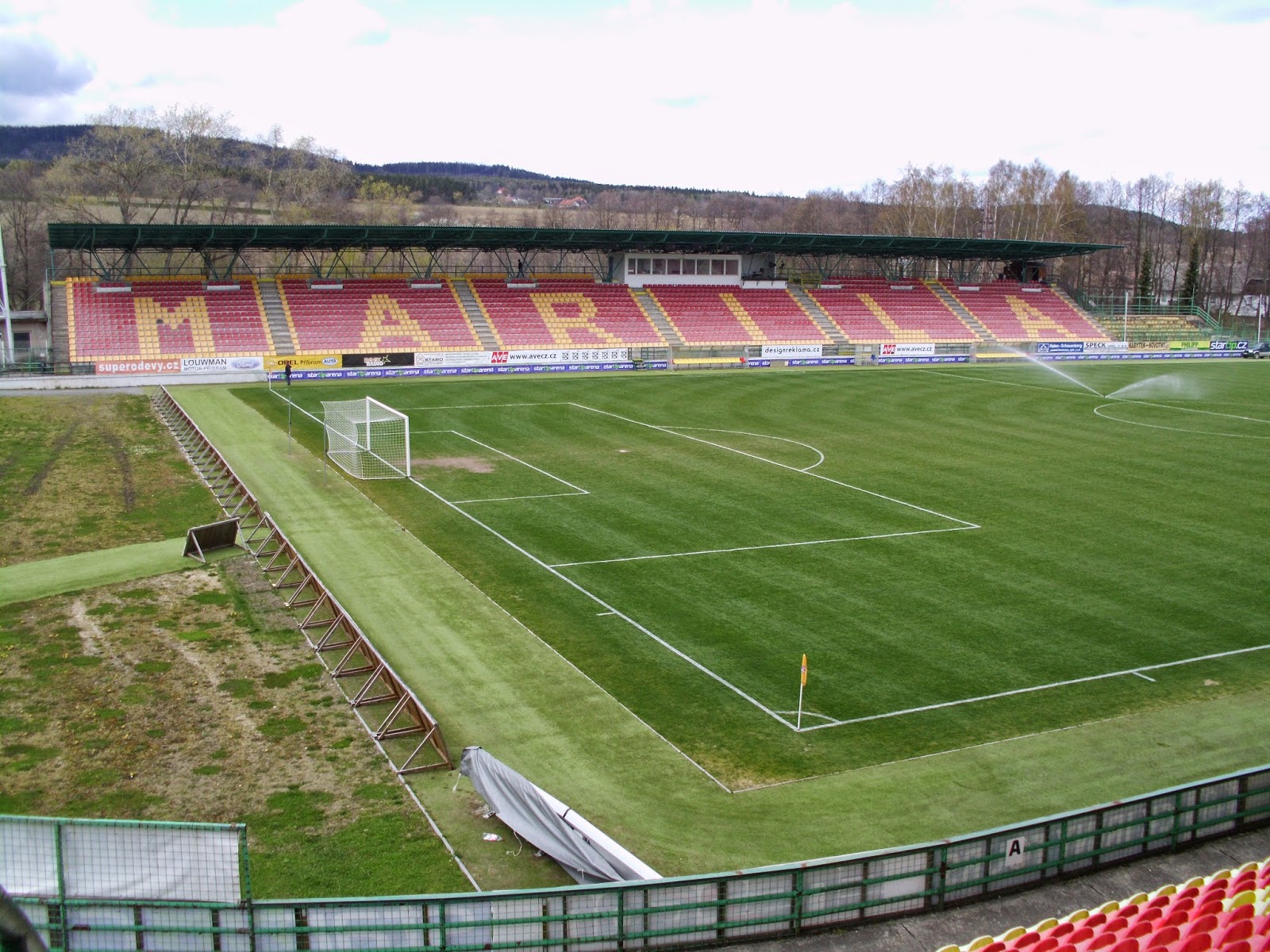 Das Stadion – die „startip arena“ – befindet sich etwas abseits der Stadt mitten in einer Schrebergartensiedlung und kündigt sich bereits durch die Flutlichtmasten an. Es besteht aus drei Tribünen, wobei die Haupttribüne – wie am Vortag bei Dukla – in einen Hügel hineingebaut wurde, hat aber bei weitem nicht die gigantischen Dimensionen aus Prag.