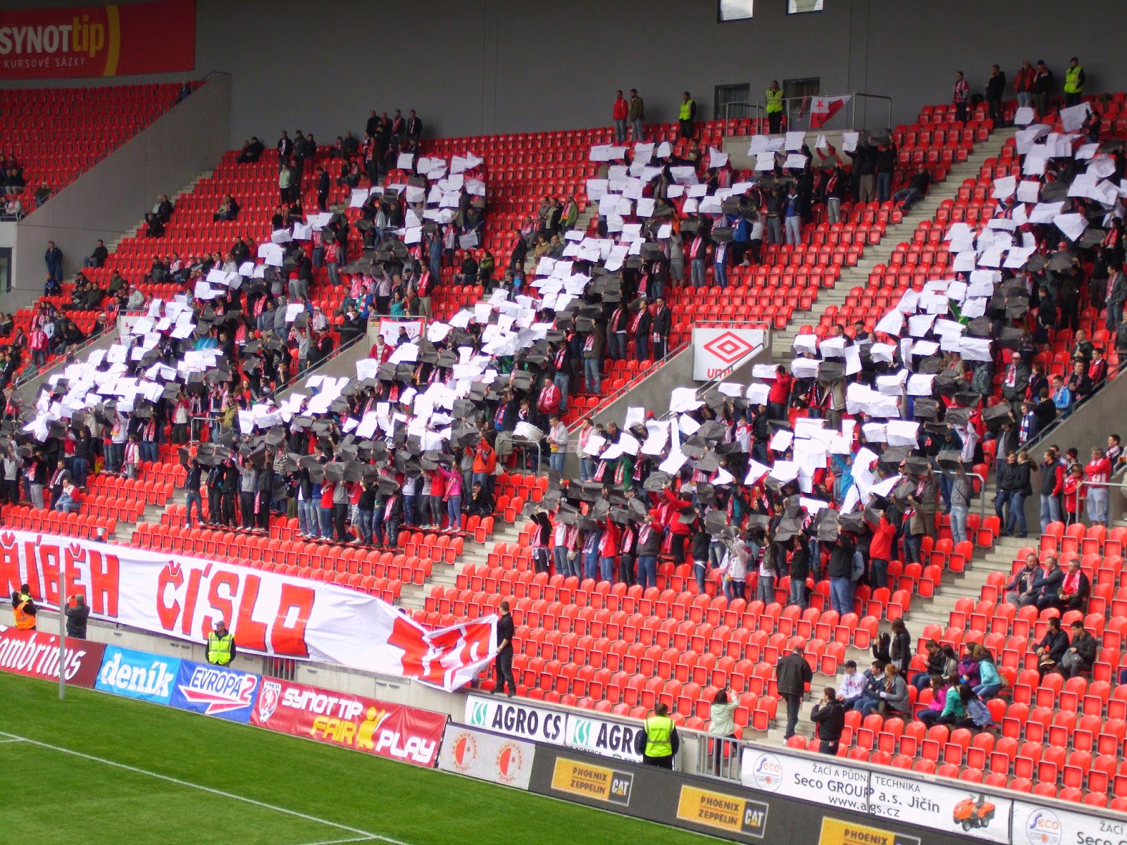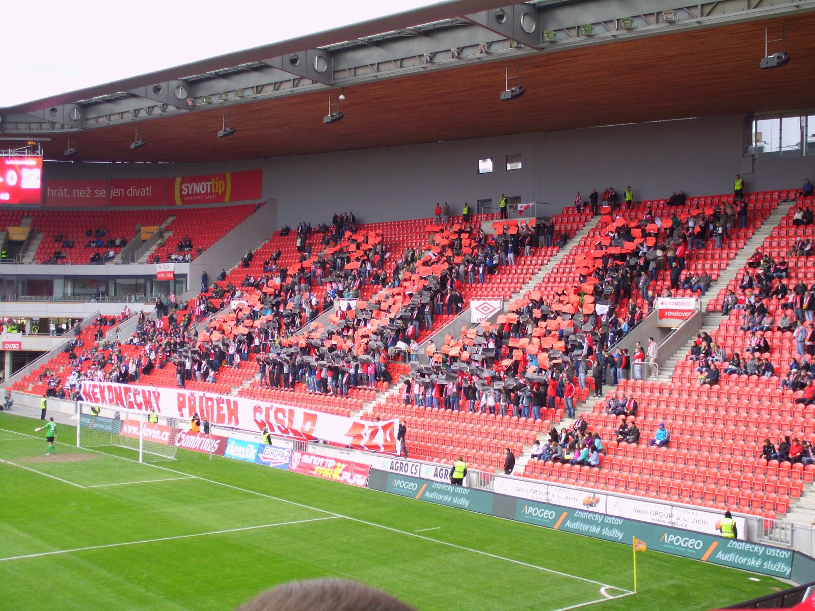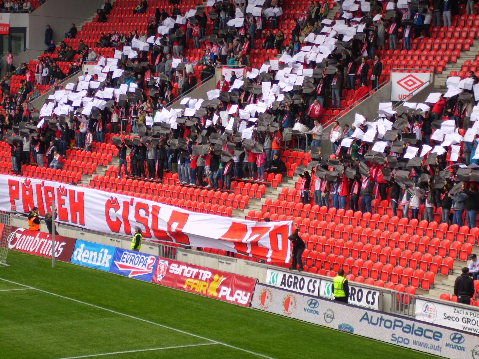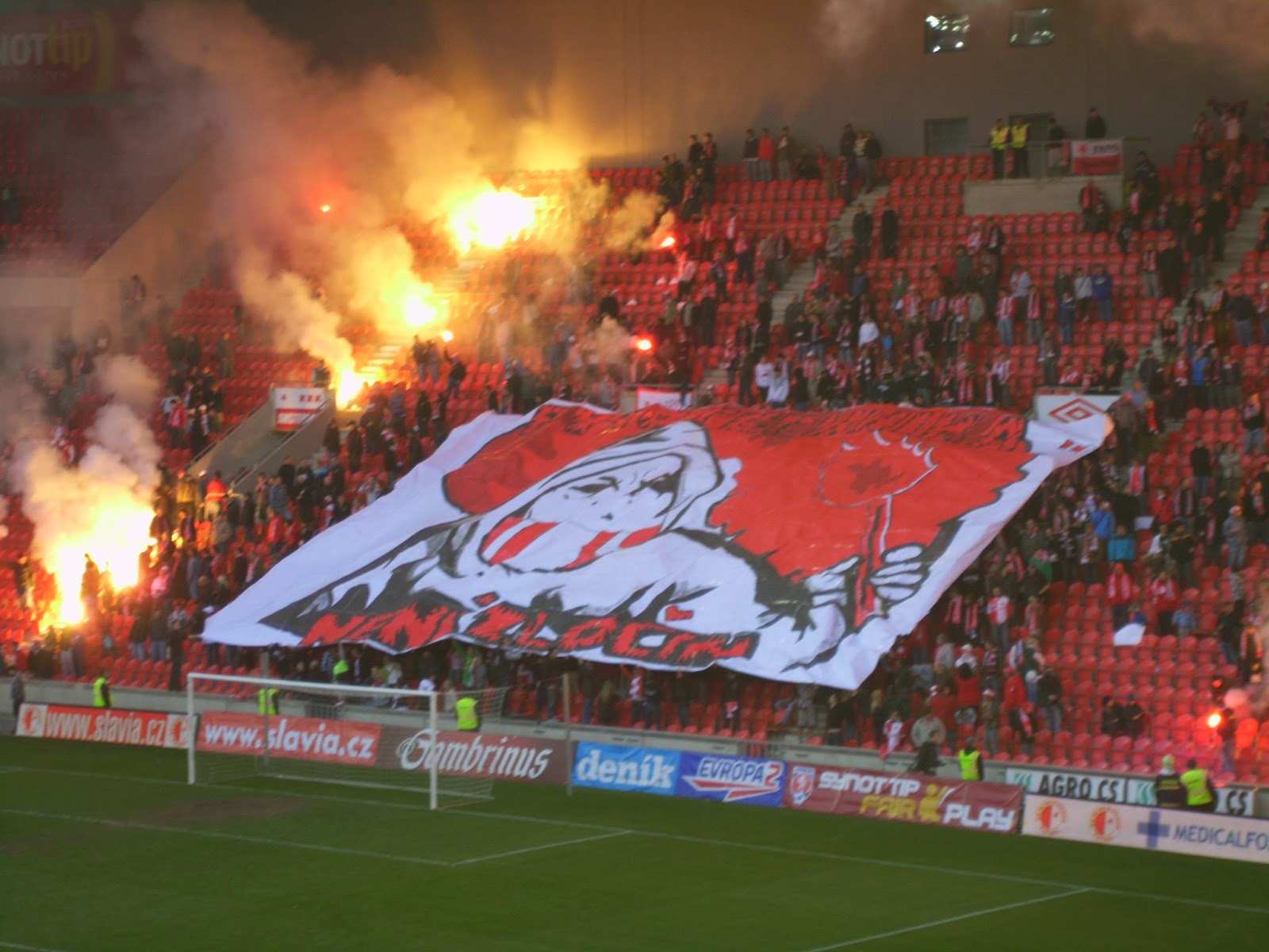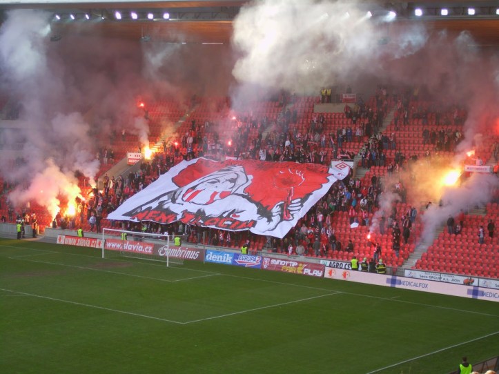 Die Slavia-Fans wissen jedenfalls Mitte der ersten Halbzeit mit einer Choreographie zum 120. Geburtstag des Vereins zu überzeugen, für die sich die Anhänger aufwendig über die gesamte Kurve verteilen. Die römischen Ziffern CXX präsentieren sie dann in drei verschiedenen Farbkombinationen. Gegen Ende des Spiels machen sie dann noch eine Pro-Pyro-Aktion, die ebenfalls zu gefallen weiß. Auch der Slovacko-Anhang, der beinahe mit mehr Transparenten als Mitgliedern angereist ist, zeigt eine nette Fan-Aktion und verfügt ebenso wie der Heim-Anhang über ein variantenreiches Liedgut.