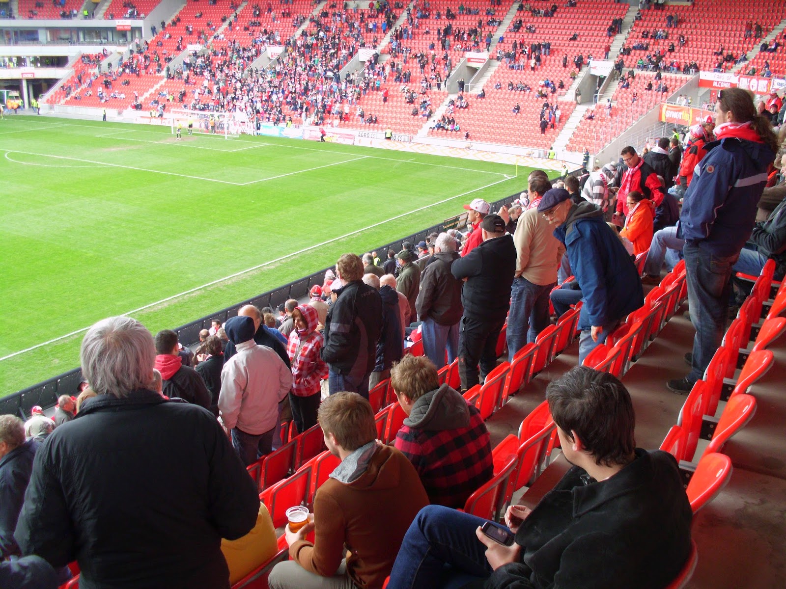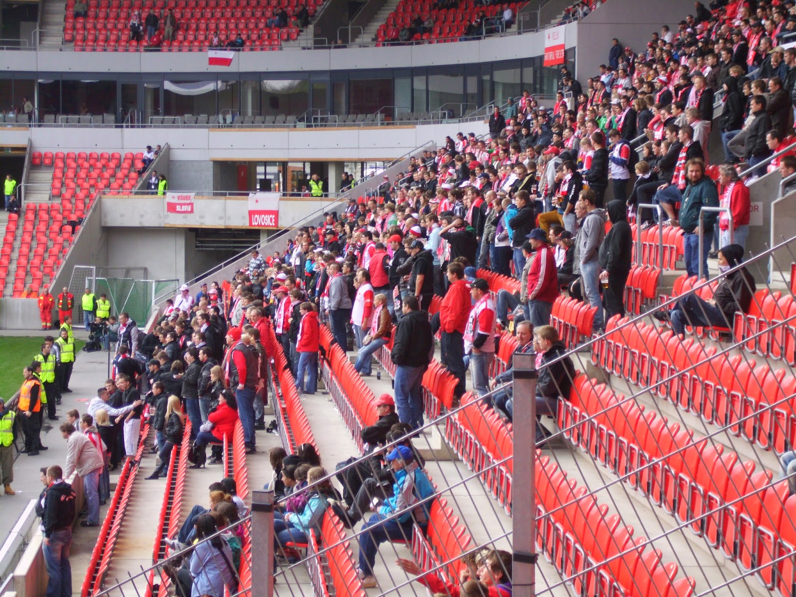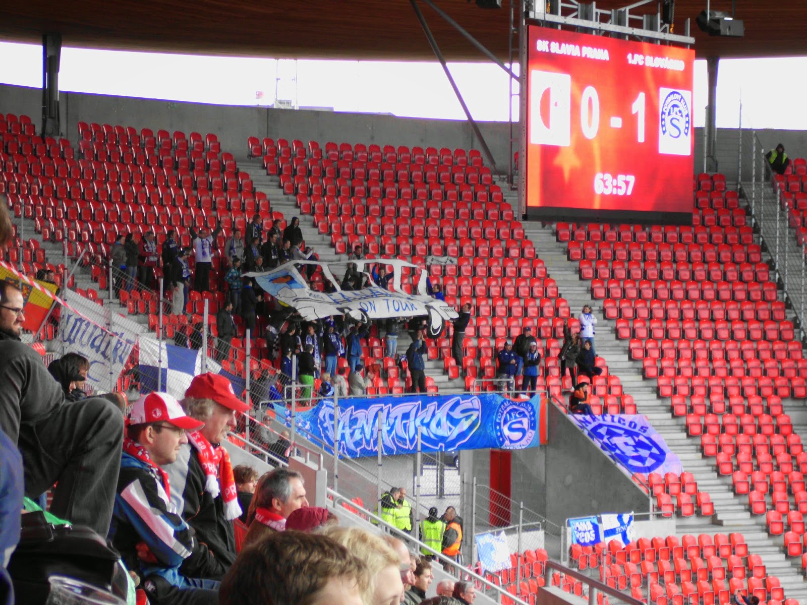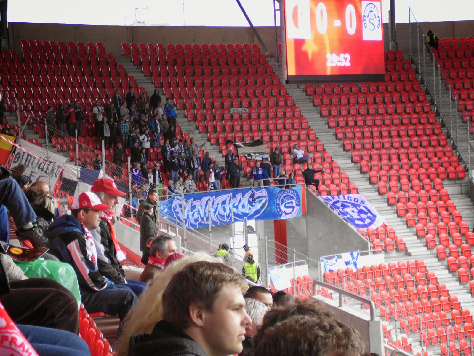 Fantechnisch ist das Spiel jedenfalls bei weitem besser als am Freitag und am Samstag, auch wenn angeblich nur 4.266 Zuschauer in der Arena für 21.000 sind. Ebenso wie bei Dukla habe ich da aber meine Bedenken, ob die Vereine wirklich immer die korrekten Zahlen veröffentlichen.