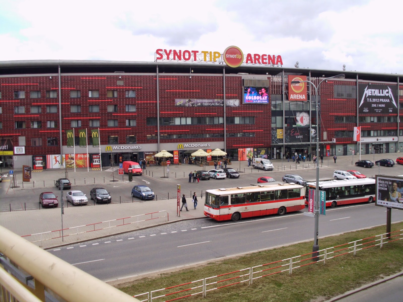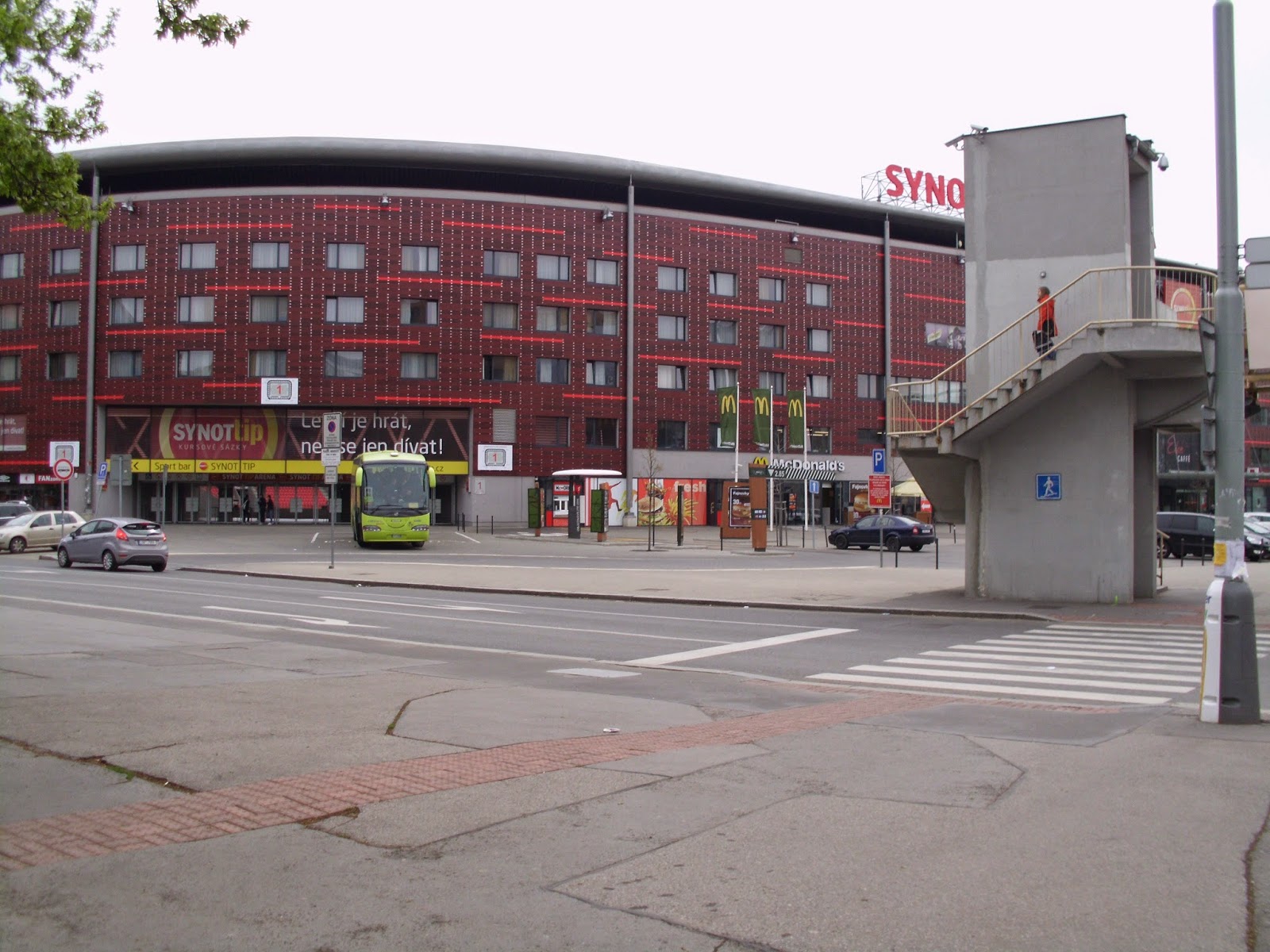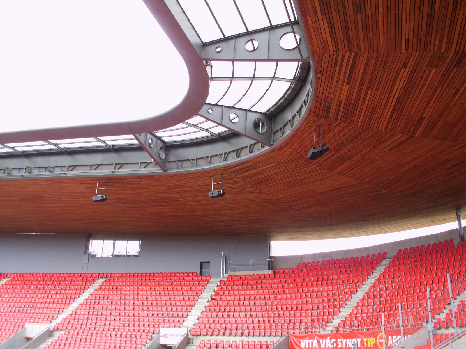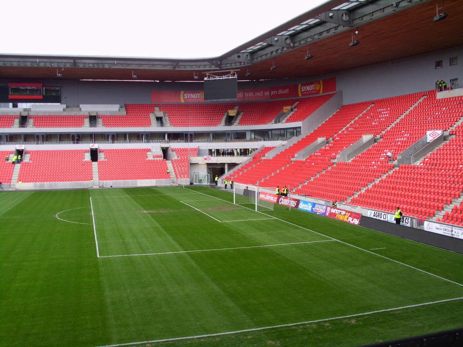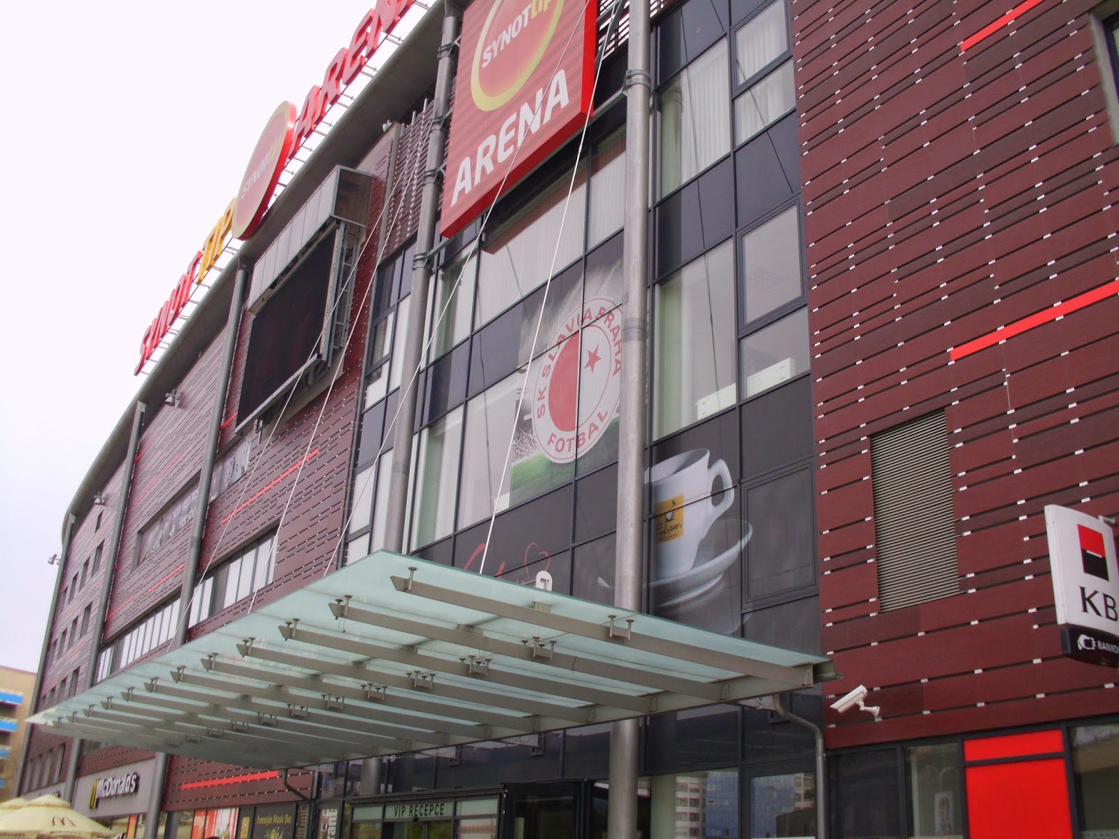 Das „Eden“ des „ewigen Zweiten“ der tschechischen Liga, Slavia Prag, ist anders als viele moderne Fußballtempel, die nur ein Einkaufszentrum mit angebauten Tribünen sind, ein eigenständiger Bau, der jedoch ein Mega-EKZ direkt angeschlossen hat. Der Außeneindruck der „Synot Tip Arena“ ist jedenfalls sehr gut, auch wenn die fast komplett verbaute Fassade etwas das Stadionfeeling nimmt. Der Eintrittspreis zeigt gleich einmal, dass es sich hier um einen Traditionsverein handelt, lege ich doch für das Spiel die Summe aus den beiden vorangegangenen Matches hin. Mit umgerechnet 10 Euro ist das Ticket aber freilich noch immer sehr günstig, vor allem wenn man beachtet, dass ich, um nicht direkt in der Fankurve zu sitzen, einen Platz auf der Haupttribüne nehme.