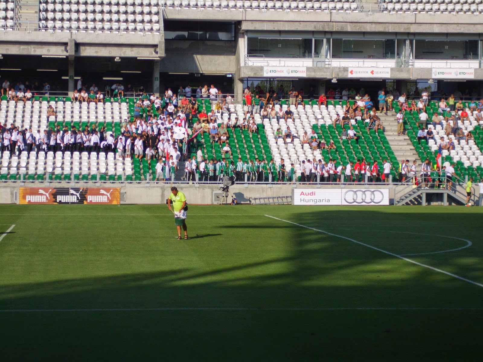 Györ ist eine echt coole Kleinstadt, mit barockem Stadtzentrum samt belebter Fußgängerzone und – für Österreich wohl eher unvorstellbar – ziemlich großer Olympia-Fanzone, die am Abend beim Handballspiel Schweden gegen Ungarn bis auf den letzten Platz gefüllt ist. Das Stadion des Vereins, der ETO Park, befindet sich etwas außerhalb und ist von außerhalb so etwas wie die Miniaturausgabe der Esprit-Arena in Düsseldorf. Die durchaus beeindruckenden, beinahe spiegelgleich errichteten beiden Haupttribünen sind nämlich vom Stadtzentrum kommend nicht zu sehen, weil der namensgebende Einkaufspark direkt davor steht. Ankommenserlebnis ist damit also gestrichen.