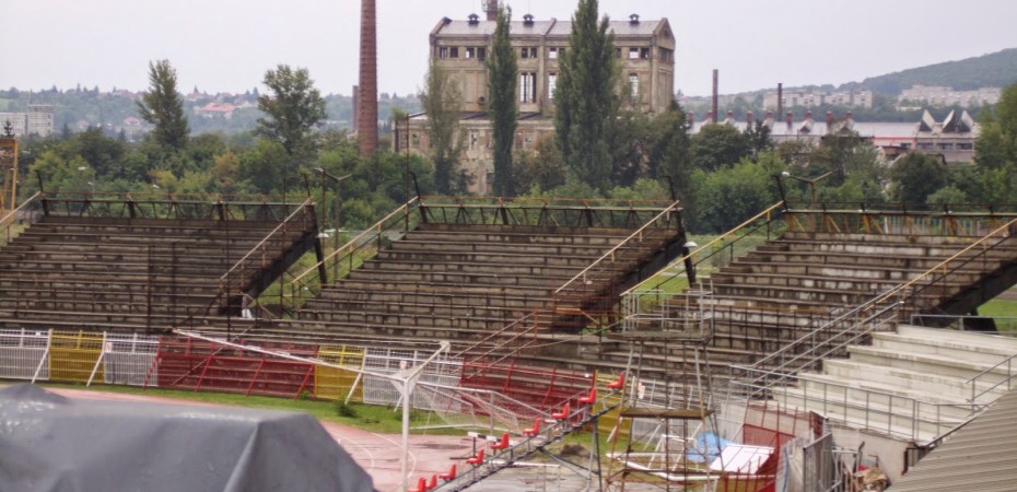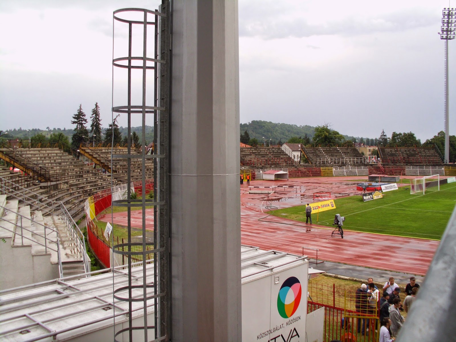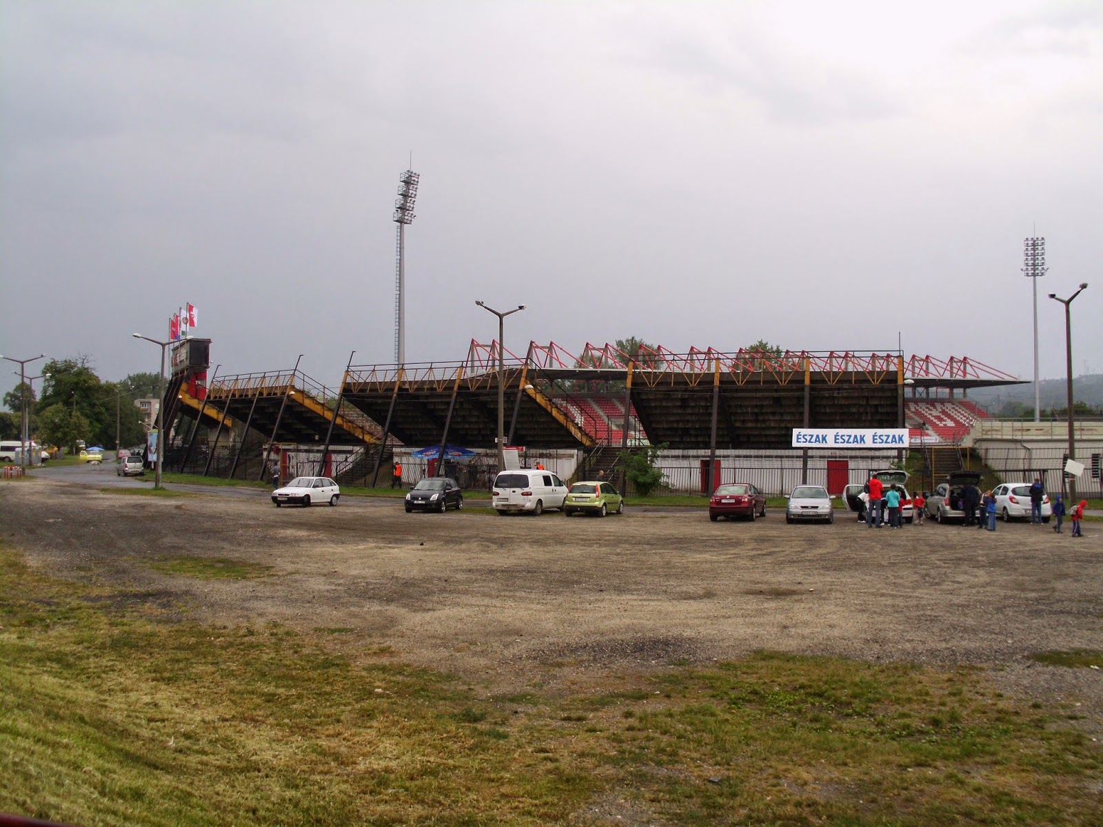 Diosgyör ist ein Vorort des sich über eine weite Fläche ausstreckenden Miskolc im Nordosten Ungarns, in der Nähe von Debrecen und fast schon an der ukrainischen und rumänischen Grenze. Großen Charme versprüht die Stadt nicht gerade, schon gar nicht Diosgyör, das sehr industriell geprägt ist. Das Stadion besteht aus einer mächtigen Haupttribüne, der eine etwas kleinere Sitzplatztribüne gegenübergestellt ist. Wie sooft in Ungarn sind nur diese beiden überdacht, die Kurven – reine Stehplätze – haben kein Dach, was an einem solchen Regentag nicht gerade angenehm ist.