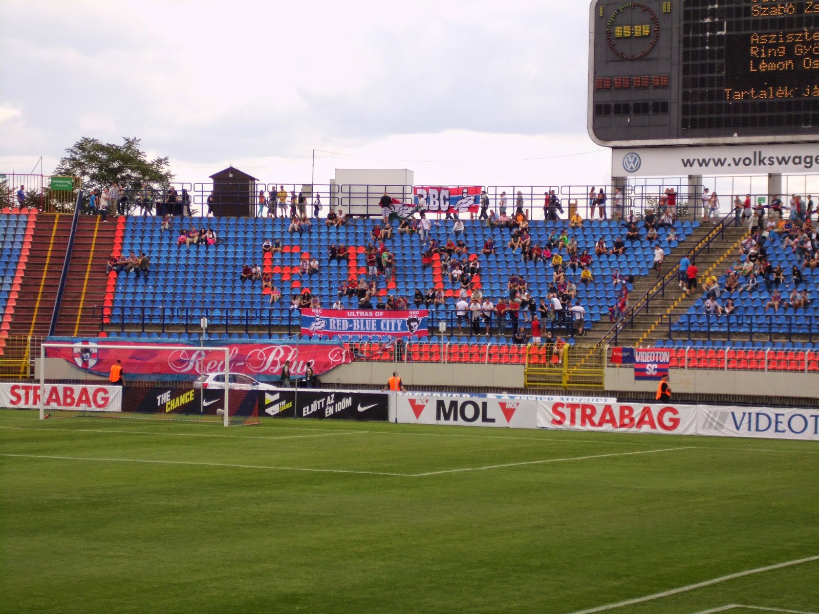 Für Stimmung sorgen die „Red Blue Devils“, die – wie schon vor einem Jahr bei selbiger Partie mit getauschtem Heimrecht in Budapest bemerkt – vollständig auf rechte Insignien in der Kurve verzichten. Zudem befindet sich bei den Ultras offenbar auch ein Frauen-Fanclub – beides bisher in Ungarn (von mir) nie gesehene Phänomene. Insgesamt ist die Fankurve zwar relativ klein, macht aber dennoch ziemlich gute Stimmung und matcht sich mit den rund 200 mitgereisten Honved-Anhängern. Zudem geht auch die Haupttribüne – zumindest bei strittigen Schiedsrichter-Entscheidungen und guten Torchancen immer wieder mit. Ich hab sicher schon Spiele mit schlechterer Stimmung – und mit 3.500 Zuschauern schlechter besuchte – in Ungarn gesehen.