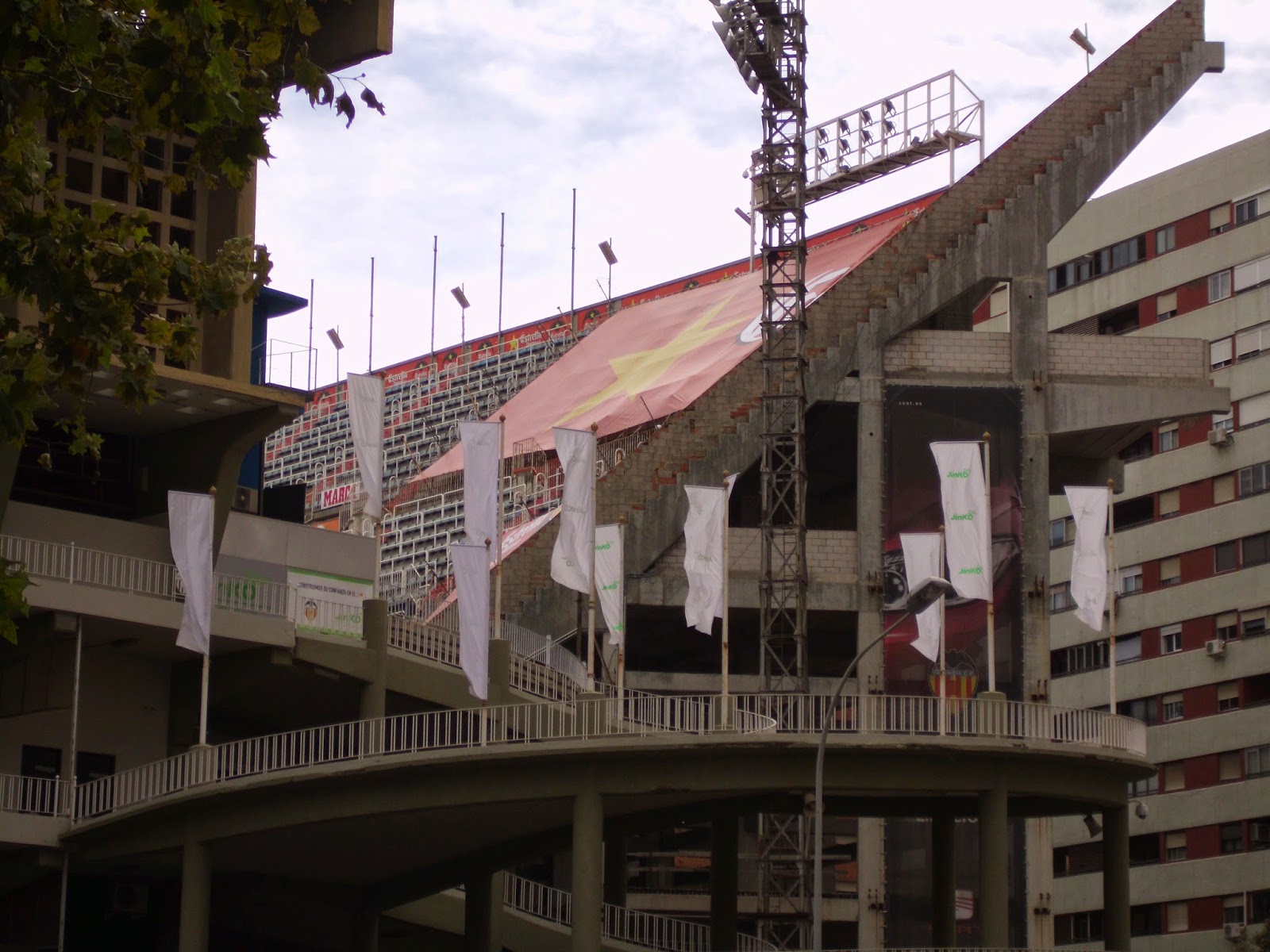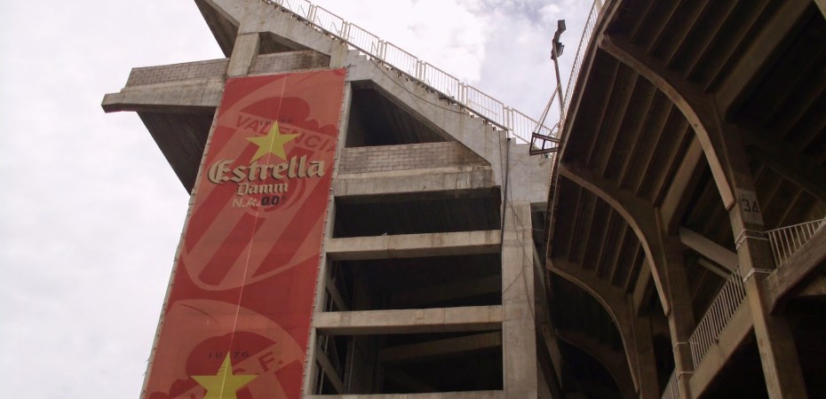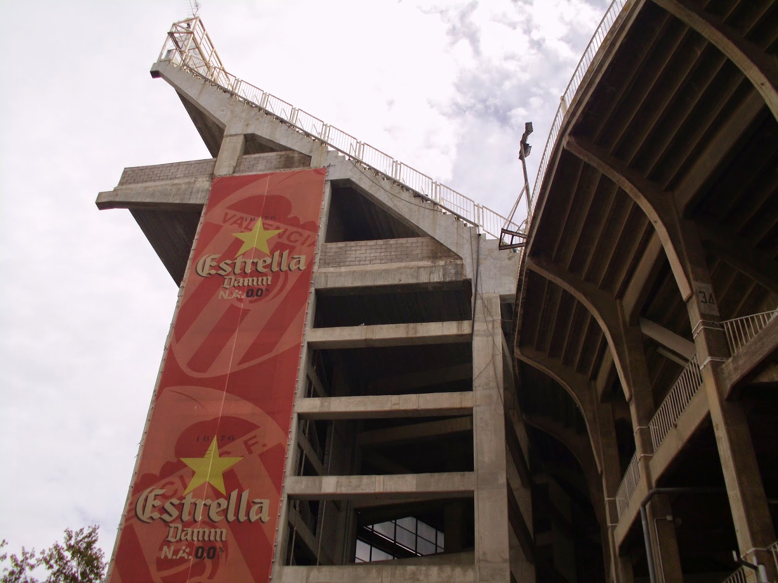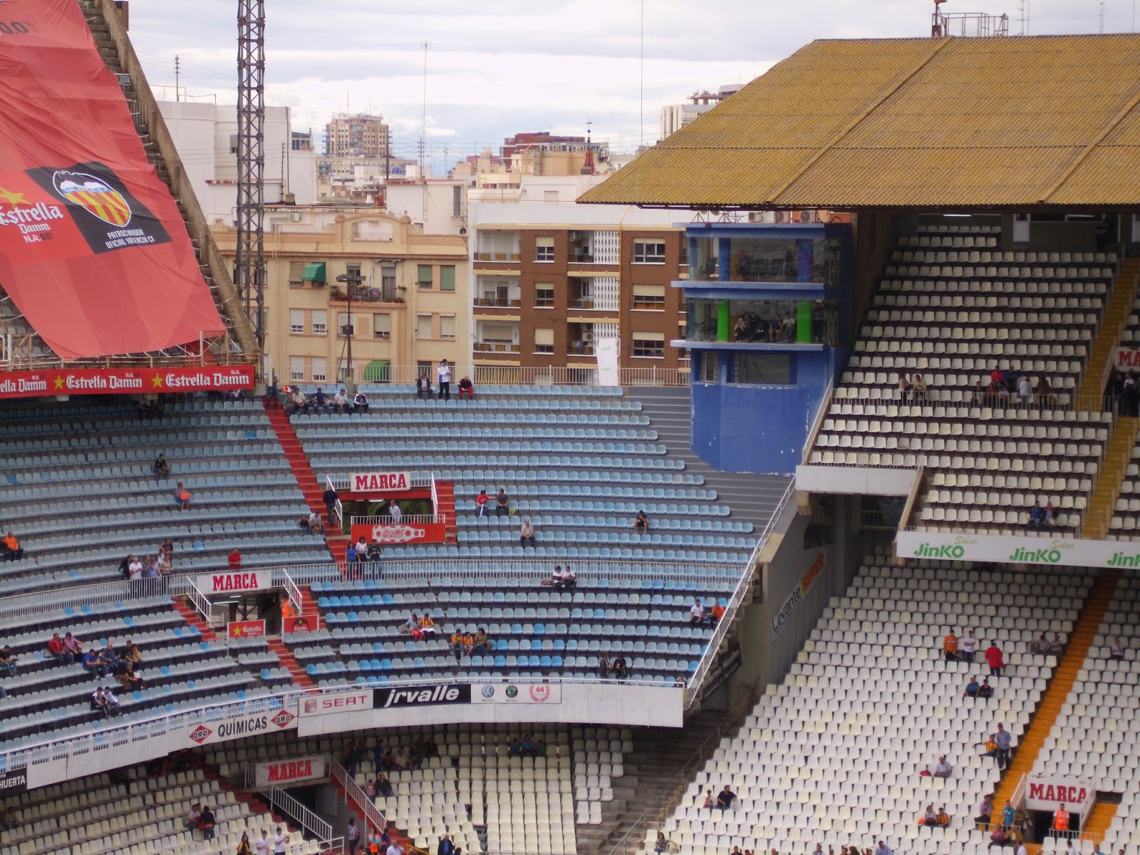 Aber der Reihe nach: Das Mestalla ist wirklich eine Wucht. Schon von außen merkt man, wie steil die Tribünen gebaut sind. Dies ist allein schon deswegen notwendig, weil es mitten in einem Wohngebiet platziert ist. Ein weiterer Ausbau ist aufgrund der Schwerkraft und diversen anderen Naturgesetzen nicht mehr möglich, weshalb auch ein neues Stadion gebaut wird, dessen Eröffnung sich aber ständig hinausschiebt. Erst vor einer Woche war wieder ein Termin bei der Bank, um die finanziellen Probleme des Klubs zu besprechen. Der Neubau ist auch der Grund, warum ich mich letztlich für dieses Spiel entschieden habe, das nur zwei Stunden später angepfiffene Match des „Submarino amarillo“ im nahegelegenen Vila-real wär auch eine Option gewesen.