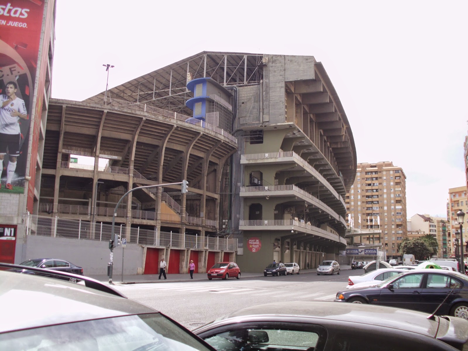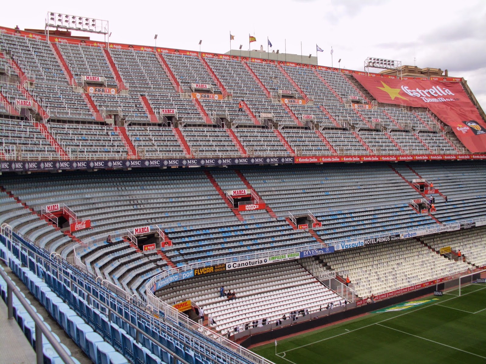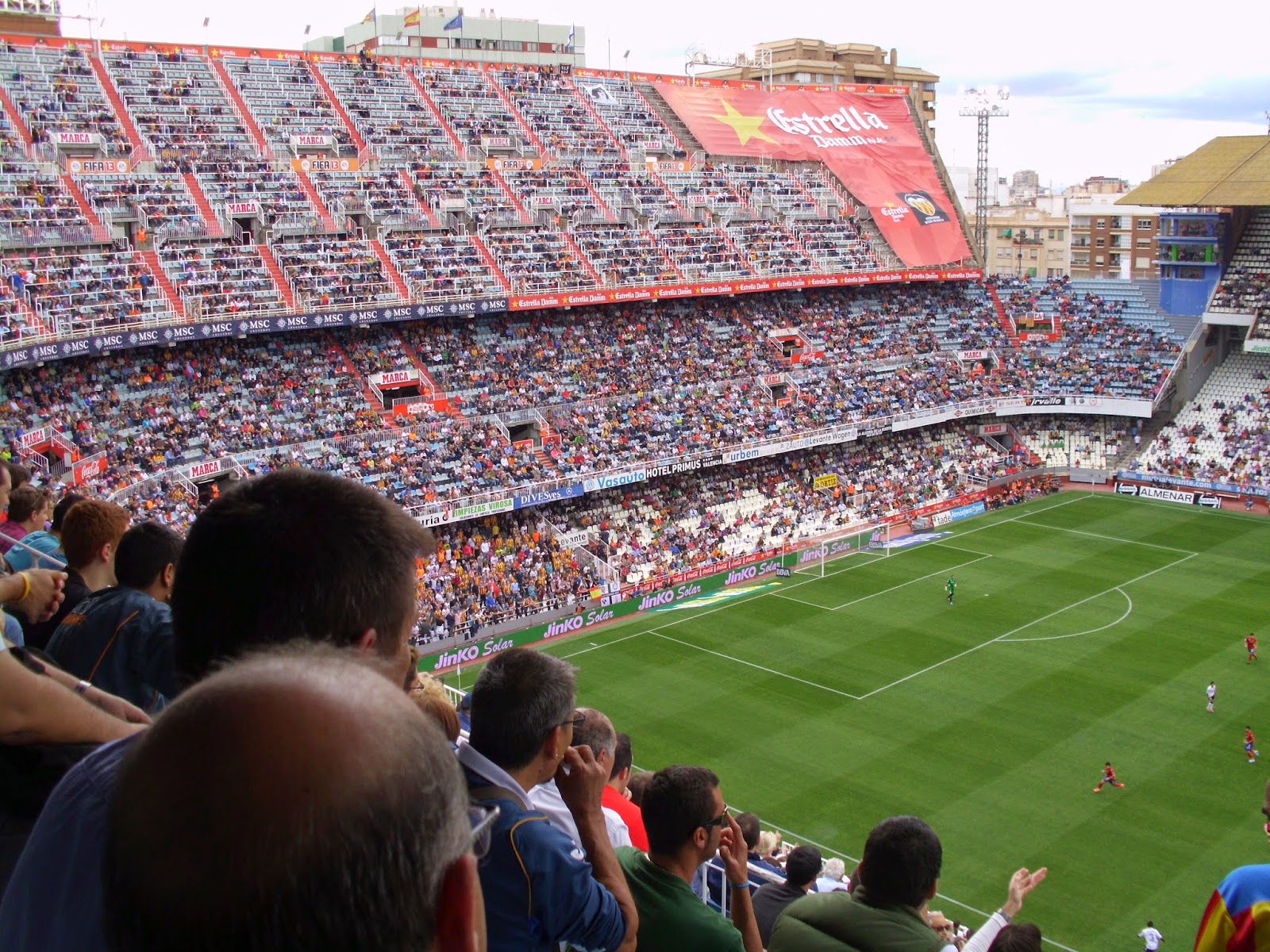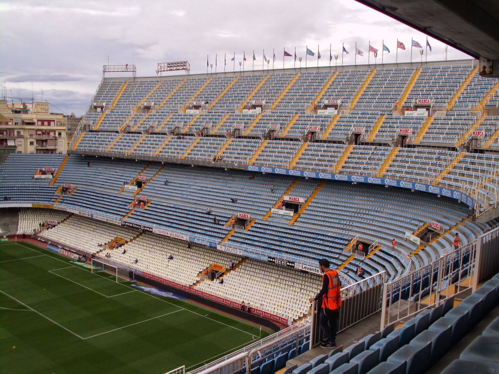 Aber der Reihe nach: Das Mestalla ist wirklich eine Wucht. Schon von außen merkt man, wie steil die Tribünen gebaut sind. Dies ist allein schon deswegen notwendig, weil es mitten in einem Wohngebiet platziert ist. Ein weiterer Ausbau ist aufgrund der Schwerkraft und diversen anderen Naturgesetzen nicht mehr möglich, weshalb auch ein neues Stadion gebaut wird, dessen Eröffnung sich aber ständig hinausschiebt. Erst vor einer Woche war wieder ein Termin bei der Bank, um die finanziellen Probleme des Klubs zu besprechen. Der Neubau ist auch der Grund, warum ich mich letztlich für dieses Spiel entschieden habe, das nur zwei Stunden später angepfiffene Match des „Submarino amarillo“ im nahegelegenen Vila-real wär auch eine Option gewesen.