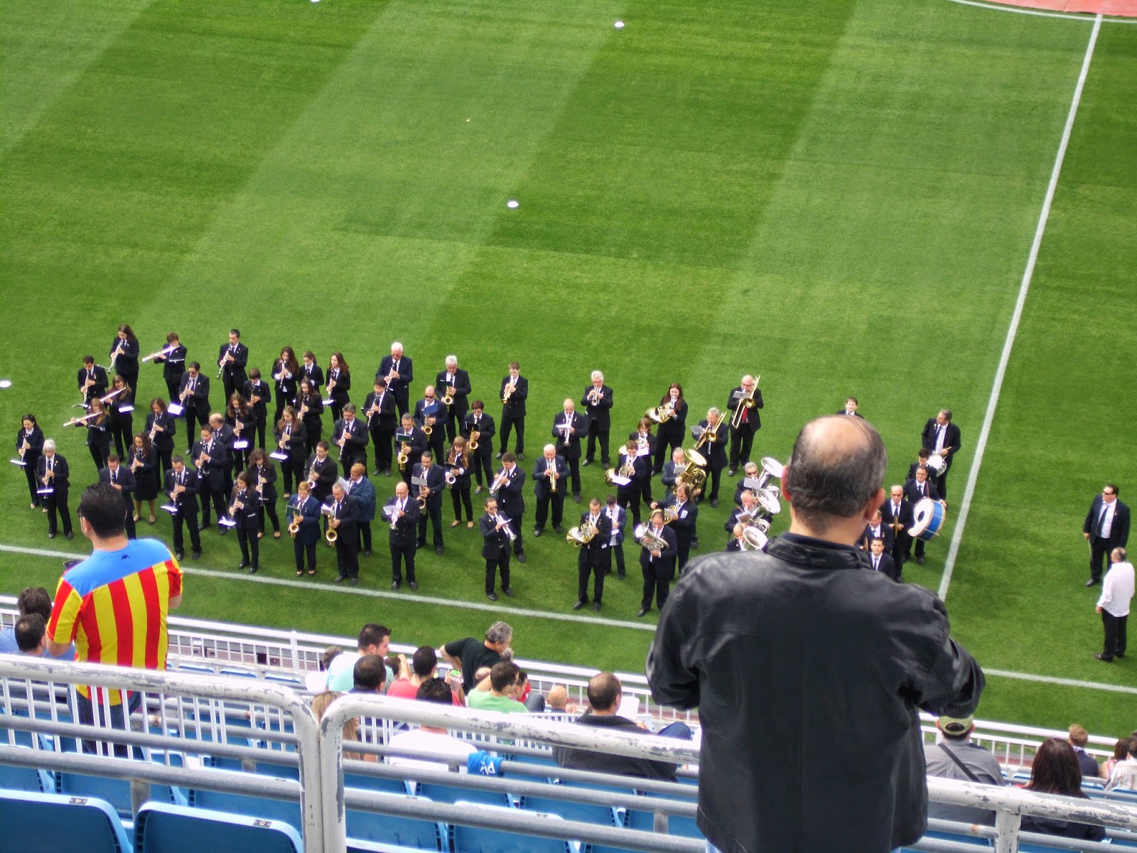 Der schwindelerregende Eindruck hält jedenfalls auch im Stadion dem Außenerscheinen Stand. Durch die unglaublich steil gebaute Tribüne hat man selbst von oberen Plätzen das Gefühl, ganz nah am Rasen zu sein. Für Menschen mit Höhenangst ist das Mestalla aber wohl eher nicht geeignet. Fankulturmäßig ist das Spiel leider eine einzige Enttäuschung. Weder eine mitgesungene Klubhymne noch sonstige Stimmung wird hier geboten. Außer vielleicht bei Red Bull hab ich selten so ein faules Publikum erlebt. „Stimmung“ macht noch am ehesten die Curva Nord, die ganz unten im Winkel meiner Tribüne angesiedelt ist. Interessant ist dabei, dass sämtliche Stadiondurchsagen rein in valencianisch gemacht werden (bei Levante waren sie gemischt), die Fangesänge aber – soweit ich das beurteilen kann – nur auf spanisch sind! Dabei ist zu meinem Erstaunen auch eine Version des „Jungs aus Favoriten“-Wechselgesangs der Austria im Repertoir. Ob Valencia den schon vorher hatte, weiß ich freilich nicht, außer der Curva Nord macht da jedenfalls niemand mit. Zu allem Überfluß sind zumindest bei den Hardcores auch einige Faschos, oder zumindest (spanische!) Ultra-Nationalisten dabei, was meine Gegenliebe nicht gerade erhöht.
