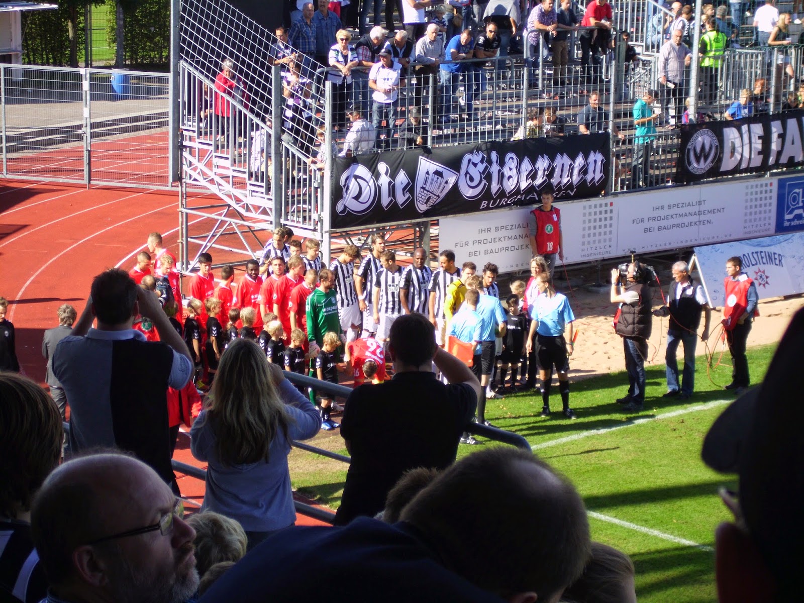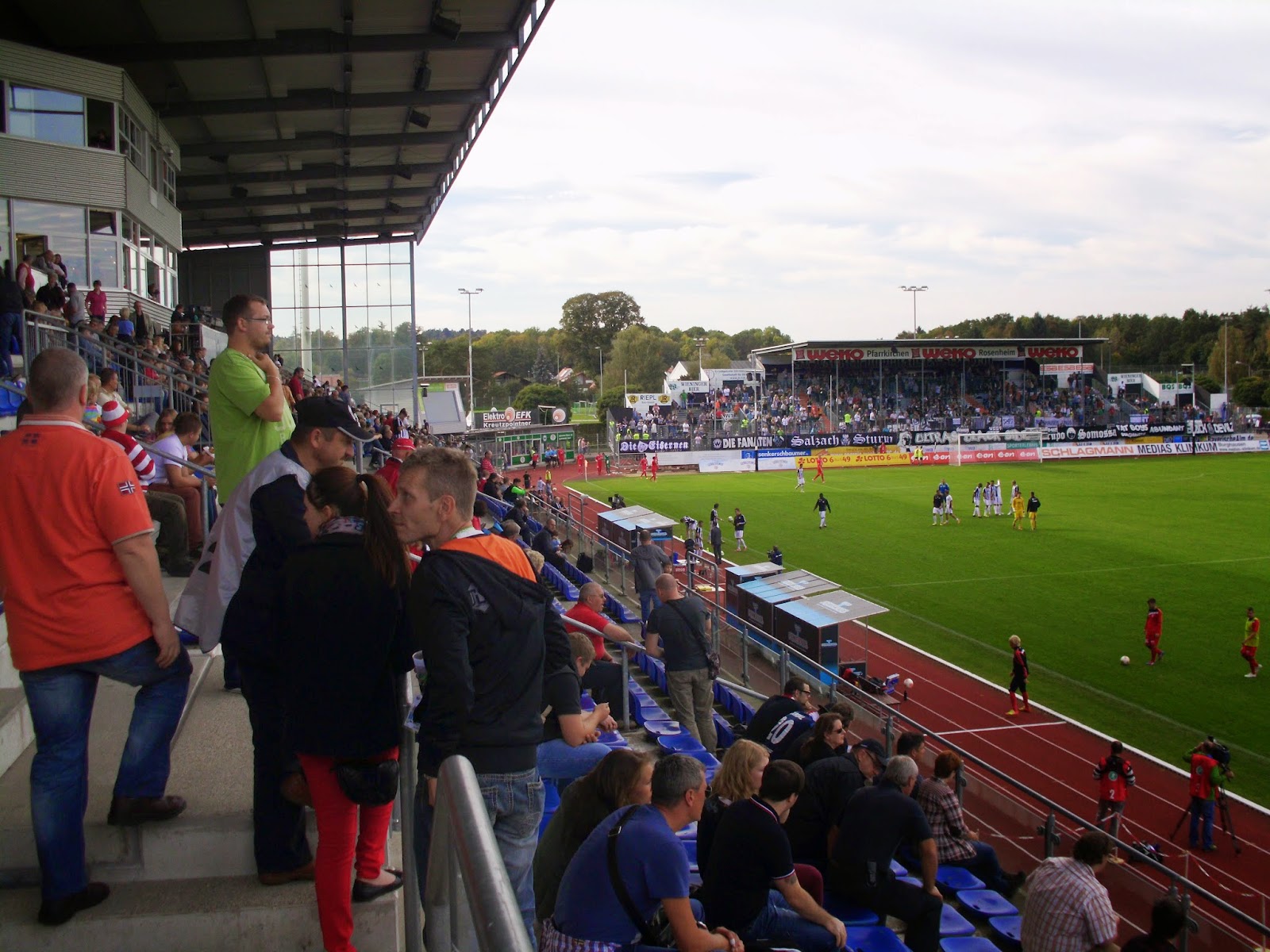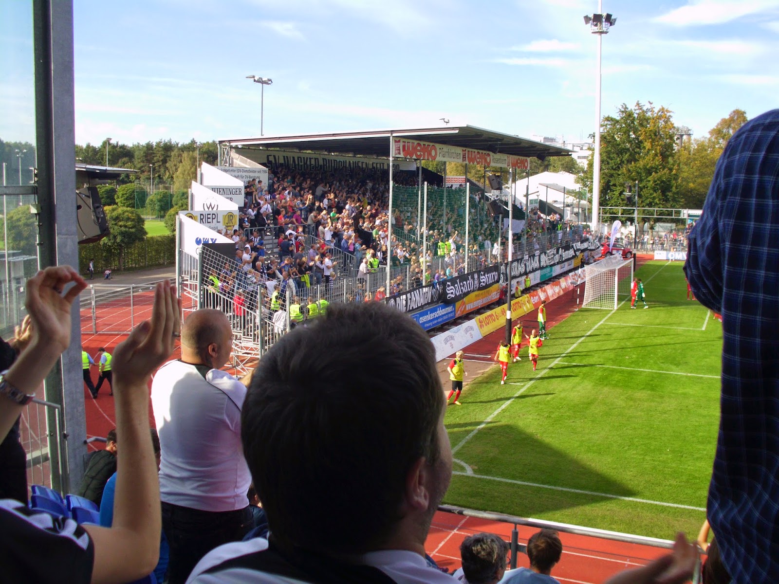 Nur 2.750, dafür echt viele Fans des ostdeutschen Aufsteigers (geschätzt 300-400) wollen sich das Drittligaspiel anschauen. Stimmung ist großteils Mangelware, auch wenn sich der harte Kern beider Mannschaften ganz ordentlich ins Zeug legt. In der ersten Halbzeit ist das Spiel extrem lau, erst in der zweiten können sich die Gastgeber einige Chancen erarbeiten. Das viel umjubelte 1:0 fällt nach einem Freistoß, das 2:0 dann nach einem Gewusele im Strafraum.
