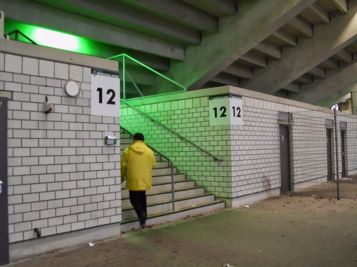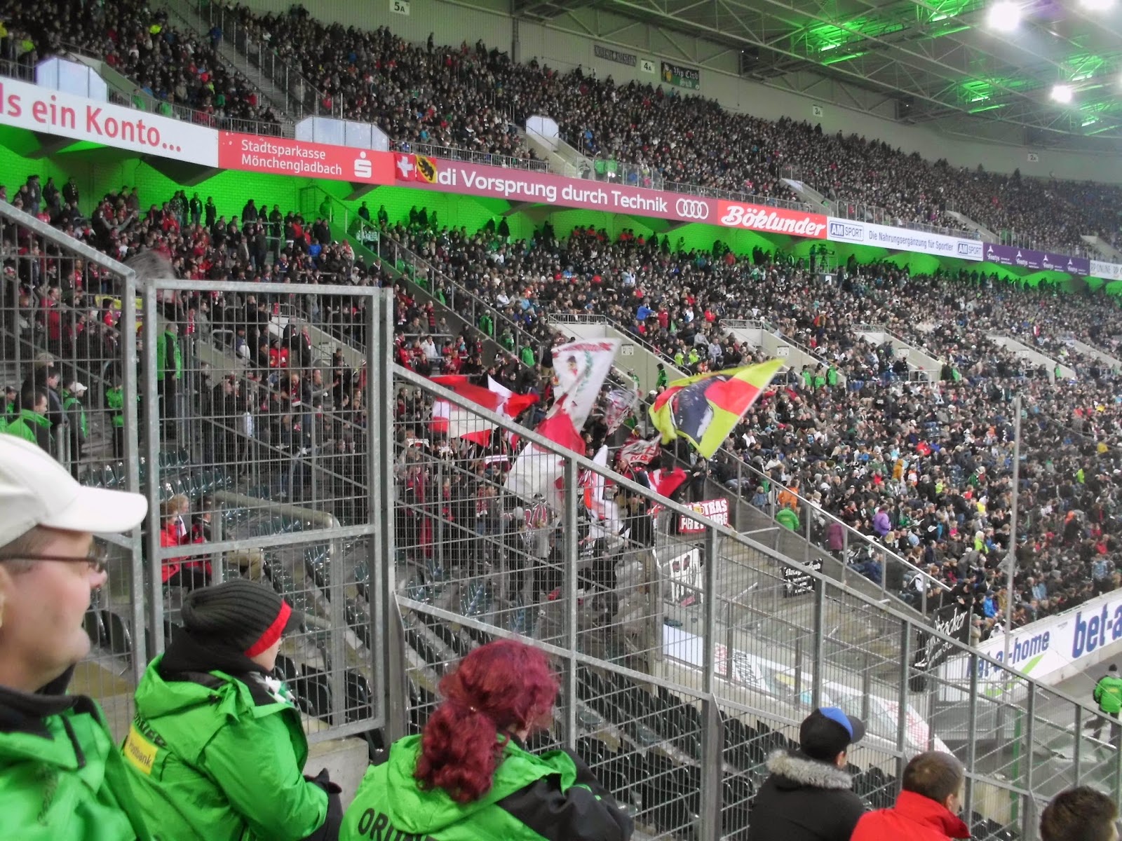 Zu Beginn der zweiten Halbzeit hör ich das Stadion dafür umso besser – blöd nur, dass ich beim 1:0 in Minute 49 gerade am Kaffeholen bin. Danach bessert sich mit dem Spiel der Gastgeber auch die Stimmung – ersteres bleibt aber nicht lang erhalten. MGB lässt sich rasch wieder hinten reindrängen und kassiert durch einen Elfer den Ausgleich. Von gut und laut kippt die Allgemeinlage nun auf ungeduldig und unruhig. Bereits zehn Minuten vor Abpfiff beginnt die große Abwanderung, erst im Bus zum Bahnhof bessert sich die Stimmung wieder, als klar wird, dass Gladbach durch die Niederlage von Schalke „einen Punkt auf die Blau-Weißen gut gemacht“ hat.