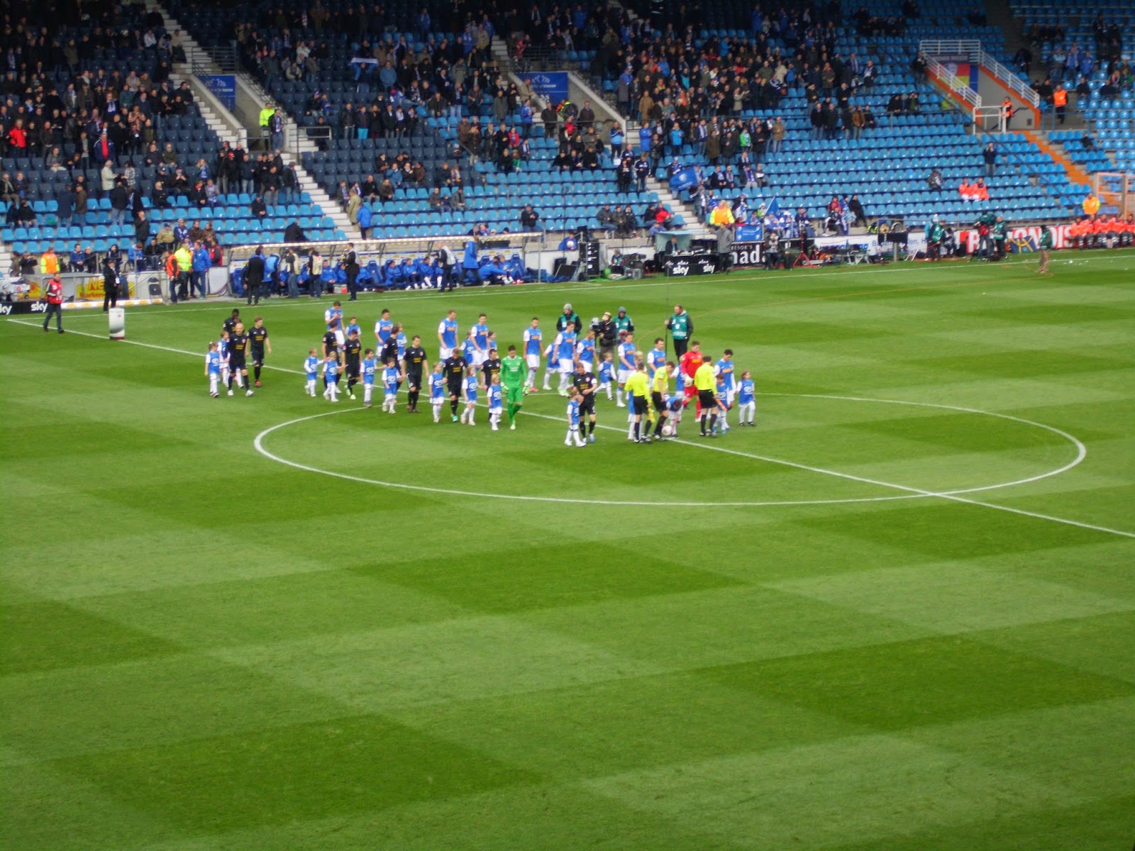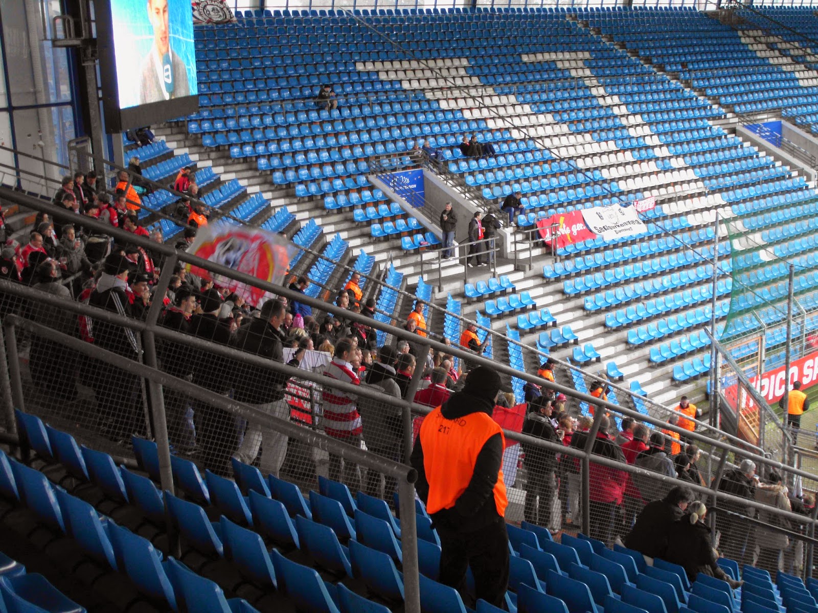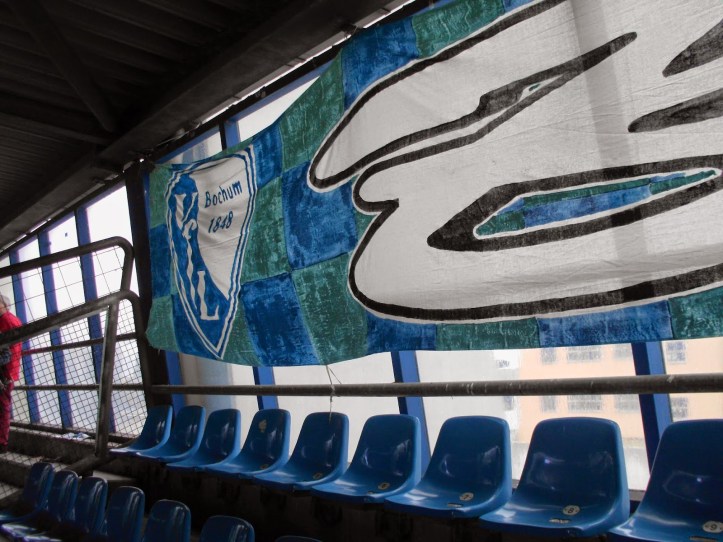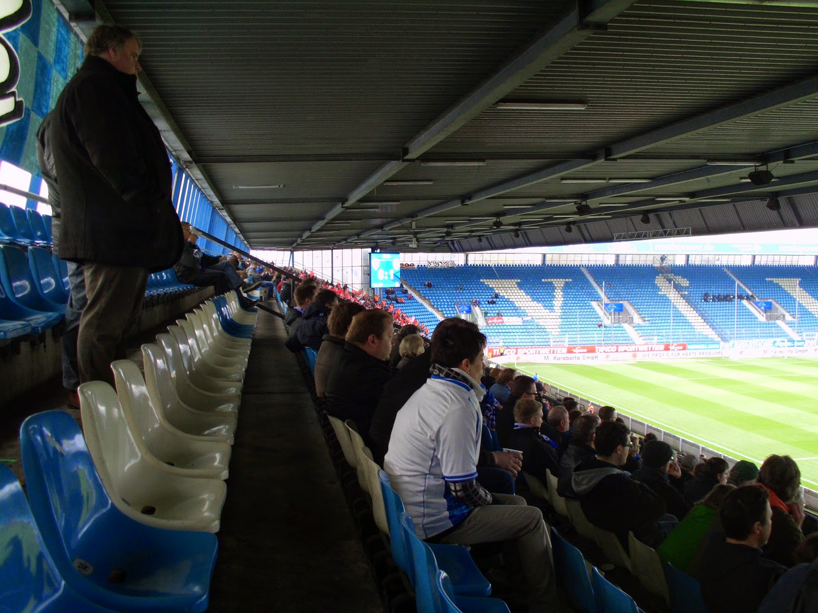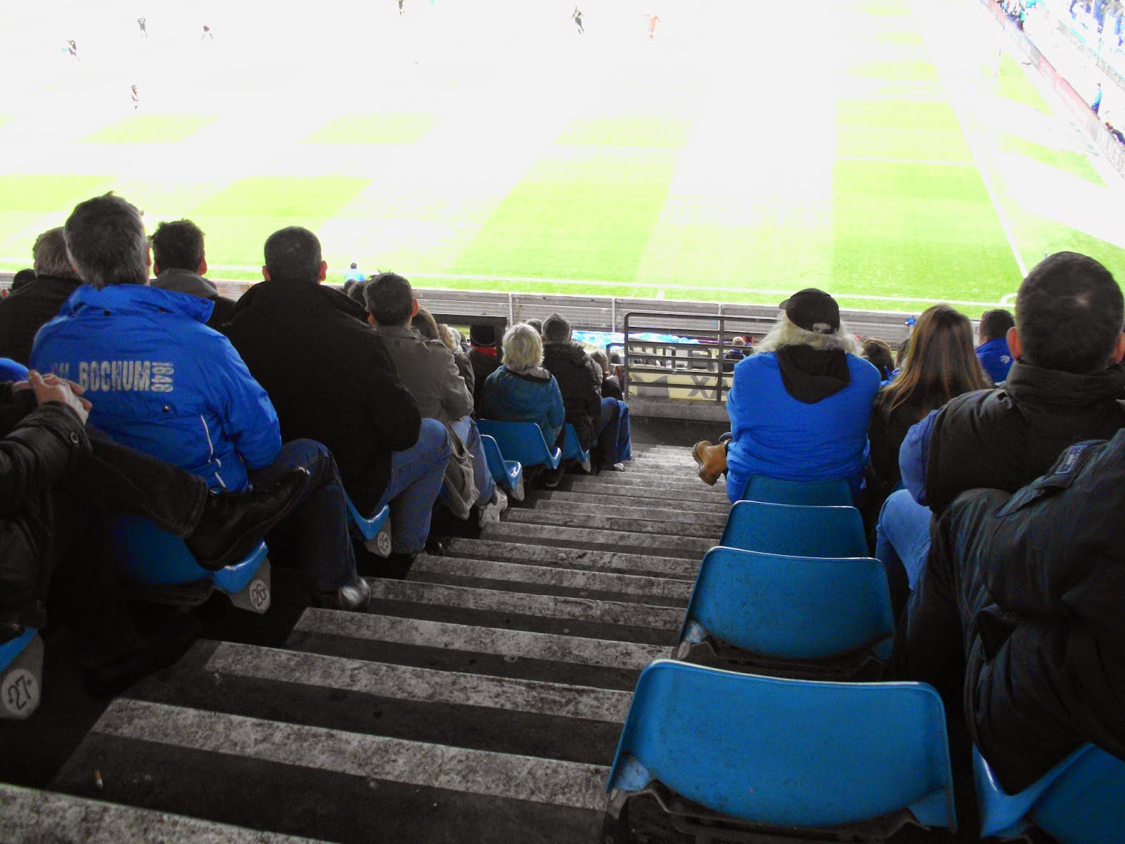 Das 2:0 fällt dann in der sechsten Minute der zweiten Halbzeit. Da sitze ich allerdings schon längst auf der anderen Seite der Tribüne, nahe dem Bochum-Fanblock. Die Stimmung hier ist nett, wenn auch aufgrund des Spielstands nicht gerade ausgelassen. Immer wieder stimmen auch die Sitzplätze ein lautstarkes „VfL“ an, um die Mannschaft doch noch nach vor zu treiben. In der 73. Spielminute gelingt Bochum der Anschlusstreffer, das Stadion steht Kopf und hofft auf mehr. Als das Urgetüm zwei Reihen vor mir bereits mit DFL, Schiedsrichter und sonstigem abrechnet („Man will uns von der Fußballkarte streichen, ich sag et dir!“), gelingt quasi mit dem letzten Angriff noch der Ausgleich. Zu „Ihr habt gekämpft, wir ham’s gesehen“ werden die Spieler verabschiedet, die blau-weiße Welt ist zumindest bis zum nächsten Samstag wieder in Ordnung – auch wenn die Abstiegsgefahr damit sicher nicht gebannt ist.
