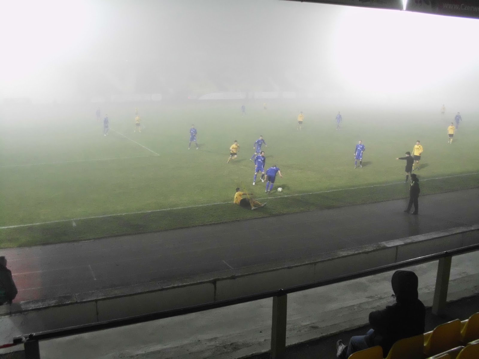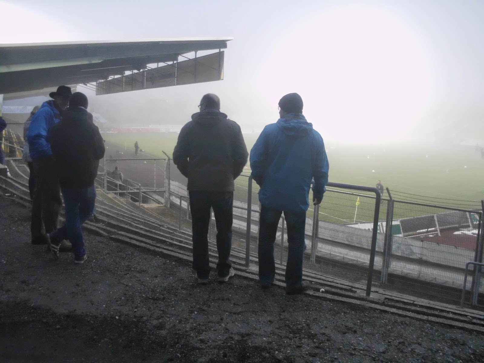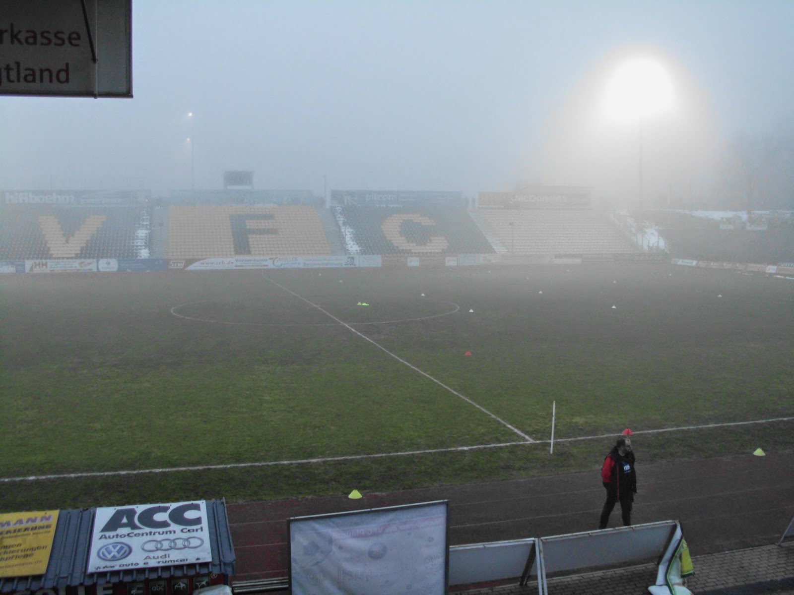 Und sonst? Kalt ist es, arschkalt, und umso näher das Spiel rückt kommt auch noch Nebel dazu. Perfektes Fußballwetter also. Bevor sich die Tore des Stadions für mich öffnen, darf ich auf dem Kiesacker alias Parkplatz noch eine Gruppe von „Verkehrskadetten“ bei ihren meist vergeblichen, aber wirklich sehr engagierten Versuchen beobachten, die ankommenden Autos dorthin zu dirigieren, wo sie laut Regeln parken sollten. 1.249 Zuschauer finden sich zu diesem Spiel der Regionalliga, dessen Tabelle die Mannschaft eines mir völlig unbekannten Zuckerwasserherstellers aus Salzburg anführt, ein. Aus Magdeburg allein kommen einige Hundert, ich würd 400-500 schätzen. Und die Fans des einzigen Europacupsiegers der DDR (Cup der Cupsieger 1974 2:0 gegen AC Milan) sind auch die einzigen, die da Stimmung machen. Bei den Plauenern gibt es zwar in der „Badkurve“ (dahinter ist das städtische Freibad) einen Teenie-Fanclub, aber nach etwa einer halben Stunde stellt dieser den Support ein und ward nie mehr gesehen… In der zweiten Hälfte schwingt sich dann ein wandelnder Fanladen zum Einheizer auf der Haupttribüne auf und schafft es tatsächlich, die beiden gegenüberliegenden Sitzplatzbereiche zu einem Wechselgesang zu bewegen („Plauen“, wenig überraschend, „VFC“ – was übrigens für Vogtländischer Fußballclub steht – kurz zuvor war einfach zu kompliziert).
