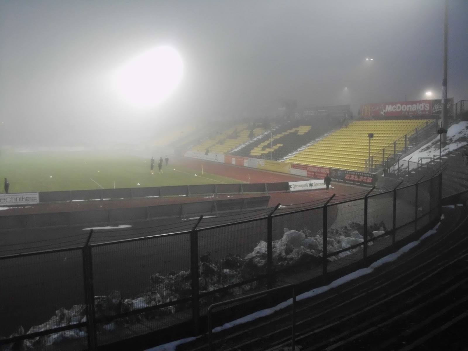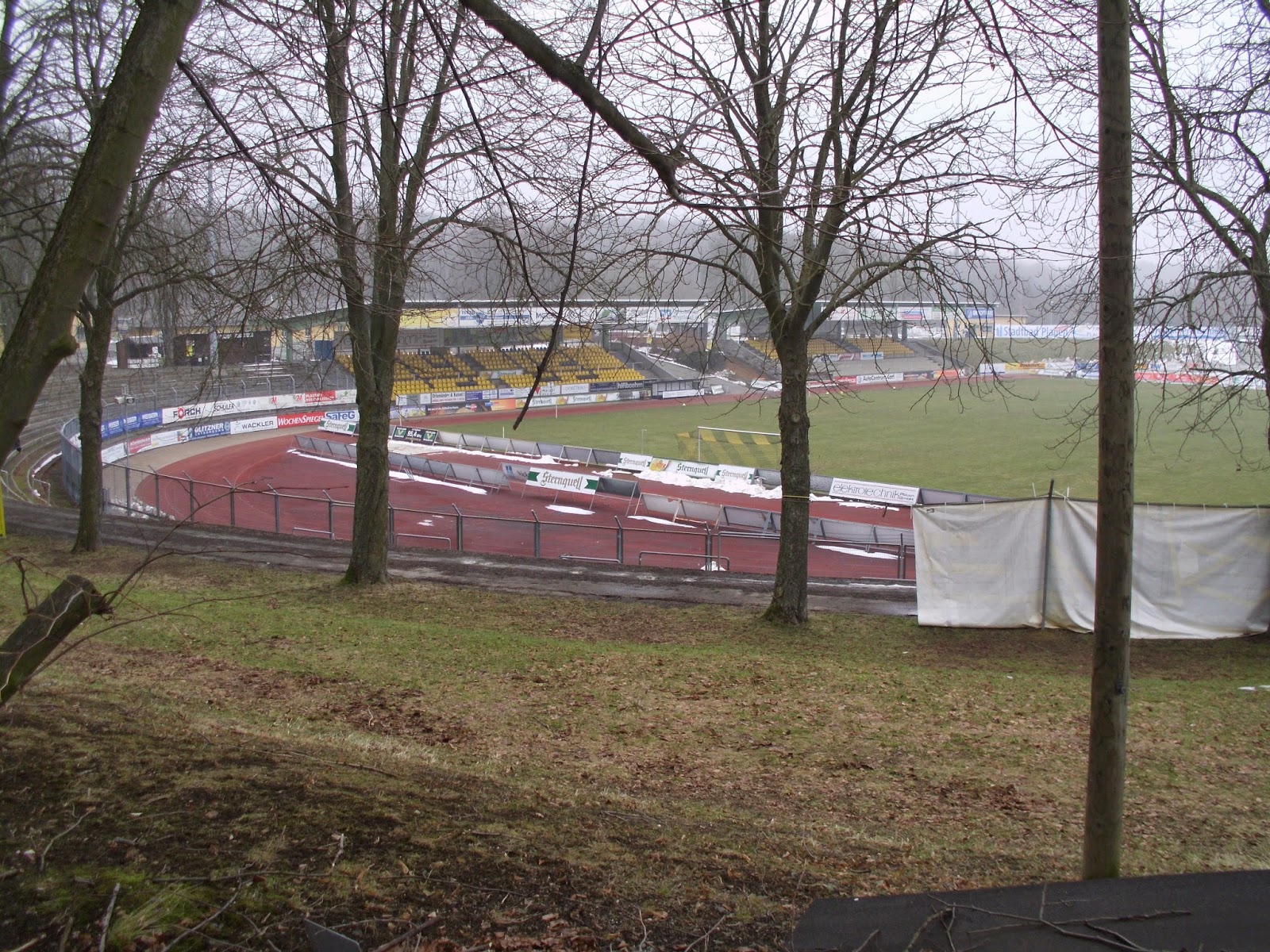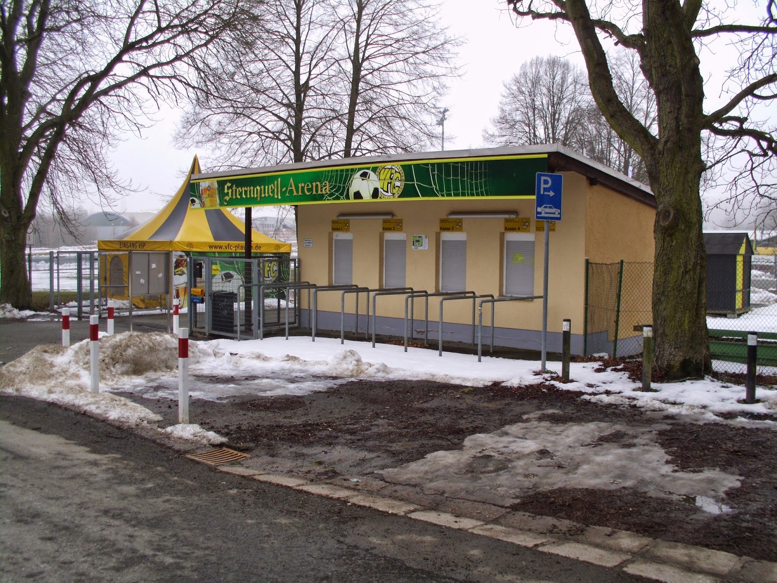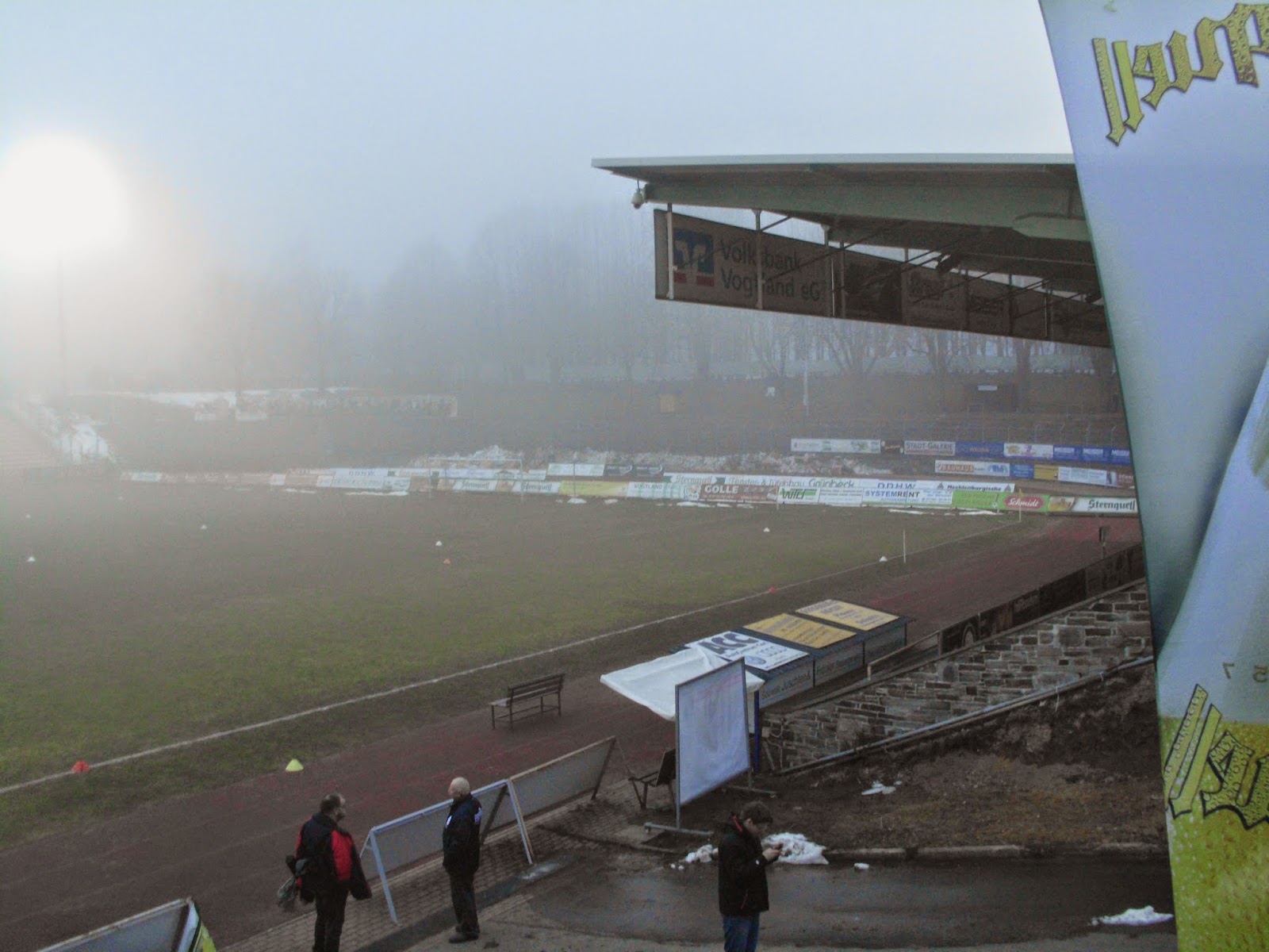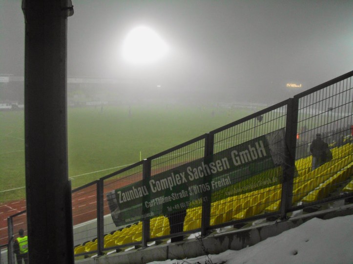 Das Vogtlandstadion, aka Sternquell-Arena, befindet sich natürlich im trostlosen Teil von Plauen, wo der Pöbel halt hingehört. Die ersten Anknüpfungsversuche an die lokale Bevölkerung verlaufen eher negativ. Ein Oldie („Ich bin Kurt“), der sich über den von Schnee gesäumten, abschüssigen Weg zum Stadion quält, gibt mir nach kurzem Smalltalk zu verstehen, dass er gern was mit einer 18-jährigen Österreicherin hätte (so kommt das bei mir zumindest an). Bei seinem Zustand jedenfalls keine gute Idee.