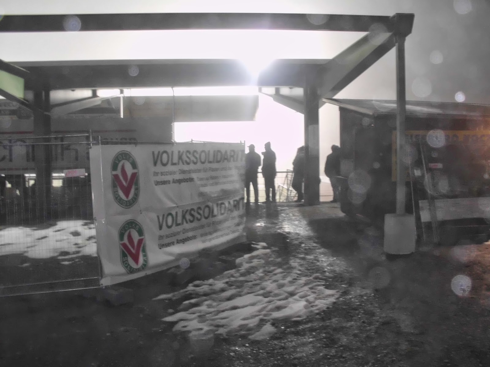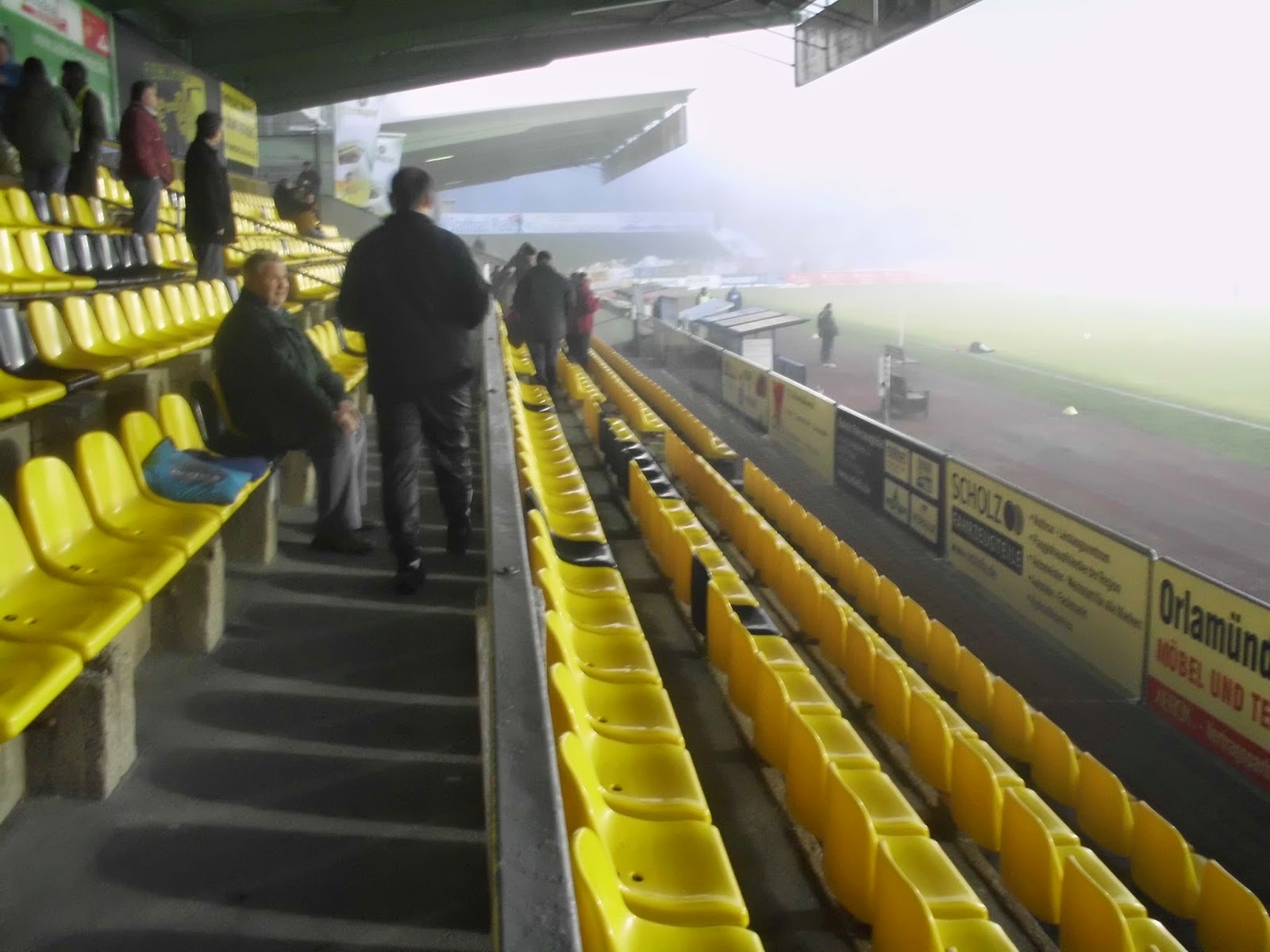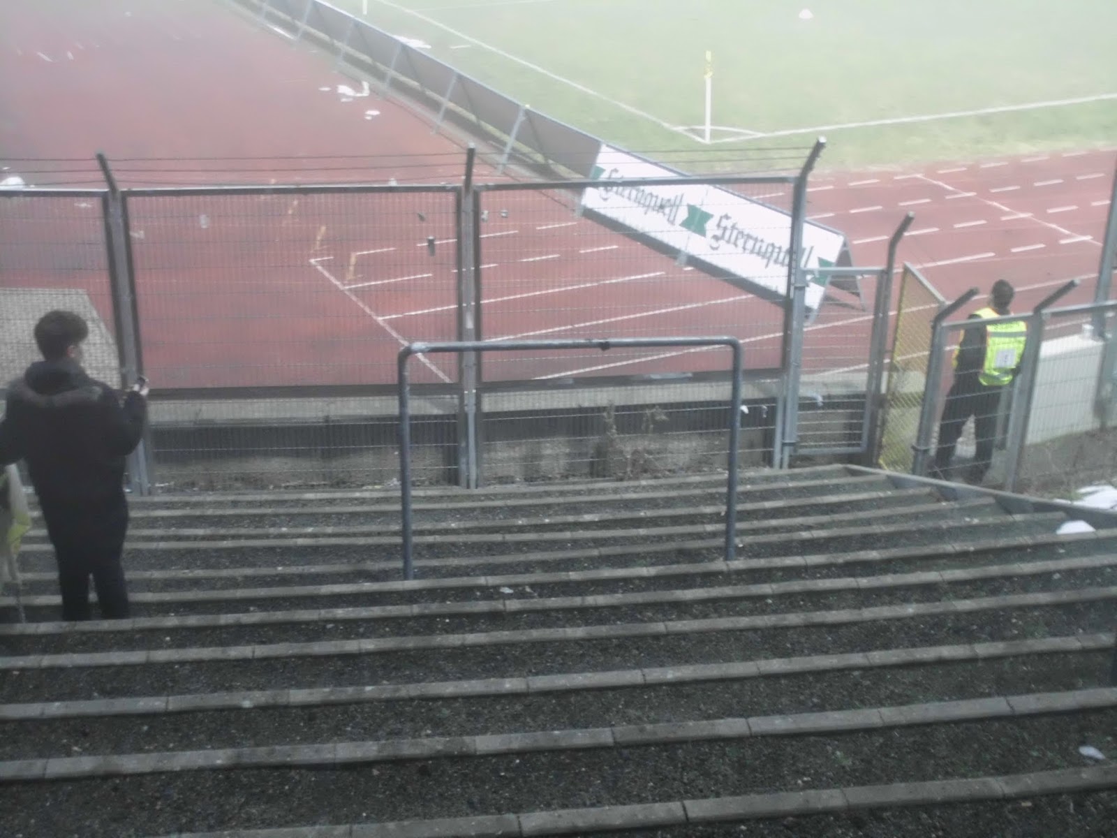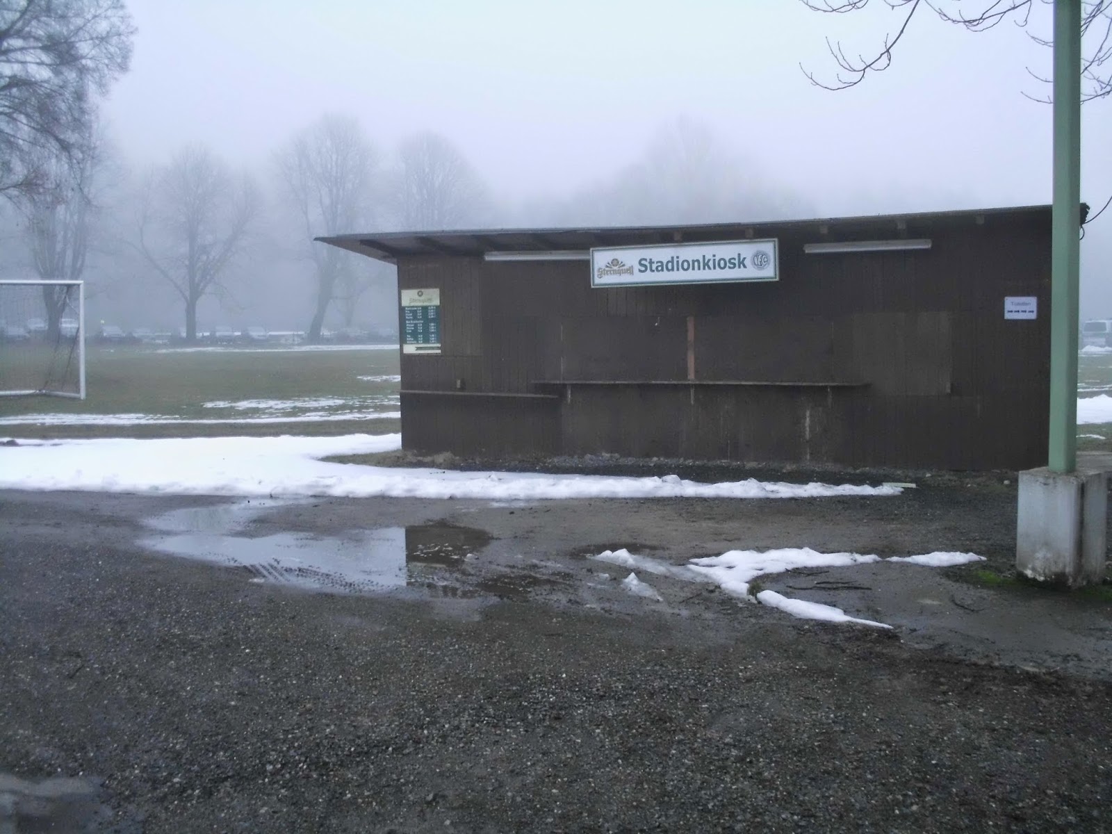 Das Vogtlandstadion, aka Sternquell-Arena, befindet sich natürlich im trostlosen Teil von Plauen, wo der Pöbel halt hingehört. Die ersten Anknüpfungsversuche an die lokale Bevölkerung verlaufen eher negativ. Ein Oldie („Ich bin Kurt“), der sich über den von Schnee gesäumten, abschüssigen Weg zum Stadion quält, gibt mir nach kurzem Smalltalk zu verstehen, dass er gern was mit einer 18-jährigen Österreicherin hätte (so kommt das bei mir zumindest an). Bei seinem Zustand jedenfalls keine gute Idee.