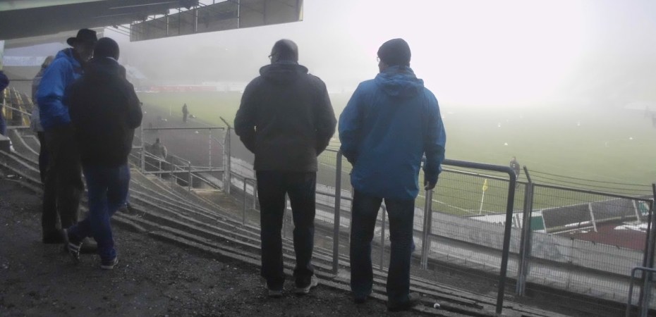 Und sonst? Kalt ist es, arschkalt, und umso näher das Spiel rückt kommt auch noch Nebel dazu. Perfektes Fußballwetter also. Bevor sich die Tore des Stadions für mich öffnen, darf ich auf dem Kiesacker alias Parkplatz noch eine Gruppe von „Verkehrskadetten“ bei ihren meist vergeblichen, aber wirklich sehr engagierten Versuchen beobachten, die ankommenden Autos dorthin zu dirigieren, wo sie laut Regeln parken sollten. 1.249 Zuschauer finden sich zu diesem Spiel der Regionalliga, dessen Tabelle die Mannschaft eines mir völlig unbekannten Zuckerwasserherstellers aus Salzburg anführt, ein. Aus Magdeburg allein kommen einige Hundert, ich würd 400-500 schätzen. Und die Fans des einzigen Europacupsiegers der DDR (Cup der Cupsieger 1974 2:0 gegen AC Milan) sind auch die einzigen, die da Stimmung machen. Bei den Plauenern gibt es zwar in der „Badkurve“ (dahinter ist das städtische Freibad) einen Teenie-Fanclub, aber nach etwa einer halben Stunde stellt dieser den Support ein und ward nie mehr gesehen… In der zweiten Hälfte schwingt sich dann ein wandelnder Fanladen zum Einheizer auf der Haupttribüne auf und schafft es tatsächlich, die beiden gegenüberliegenden Sitzplatzbereiche zu einem Wechselgesang zu bewegen („Plauen“, wenig überraschend, „VFC“ – was übrigens für Vogtländischer Fußballclub steht – kurz zuvor war einfach zu kompliziert).