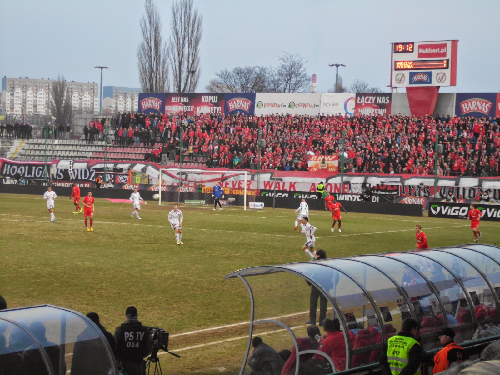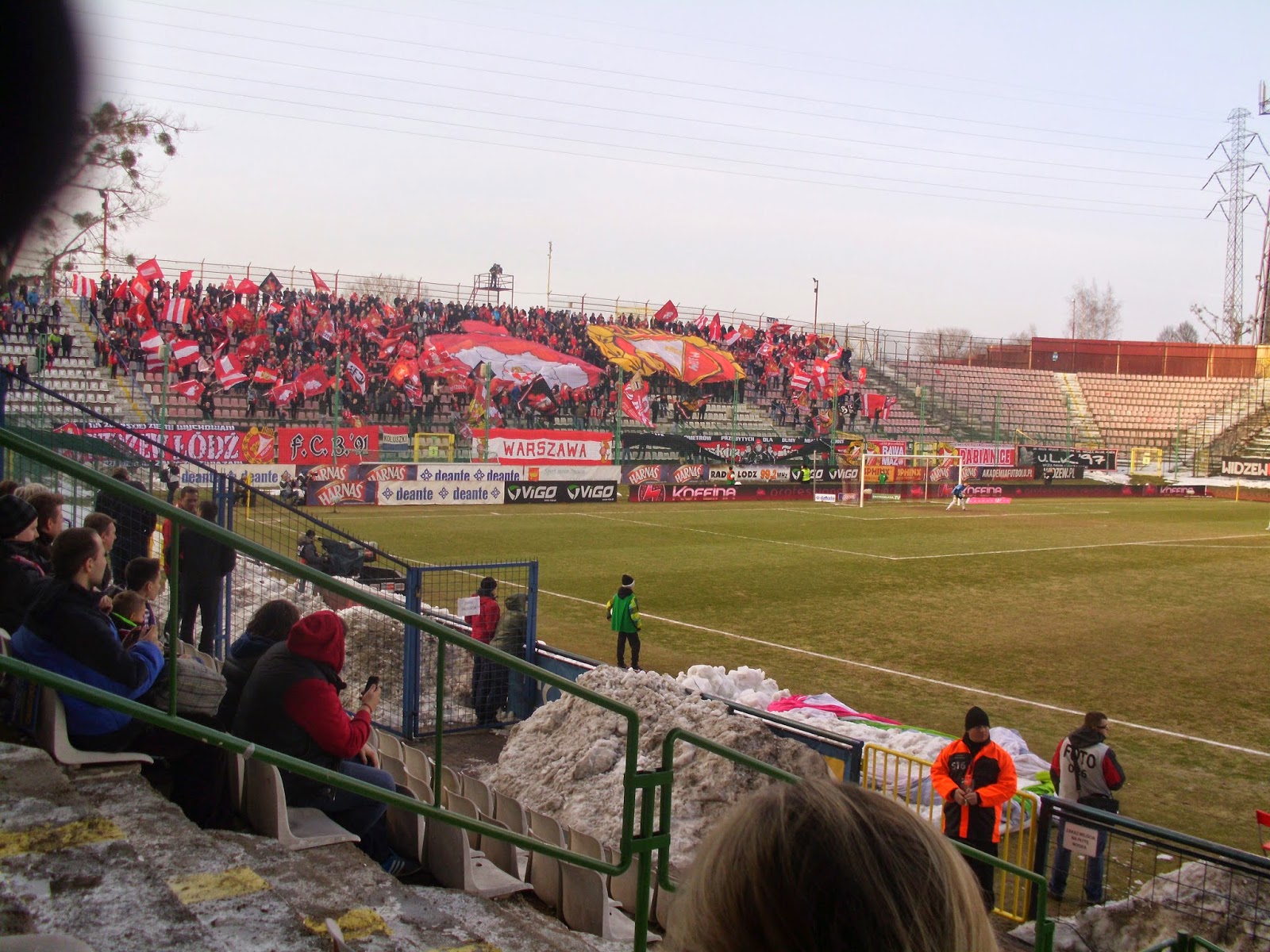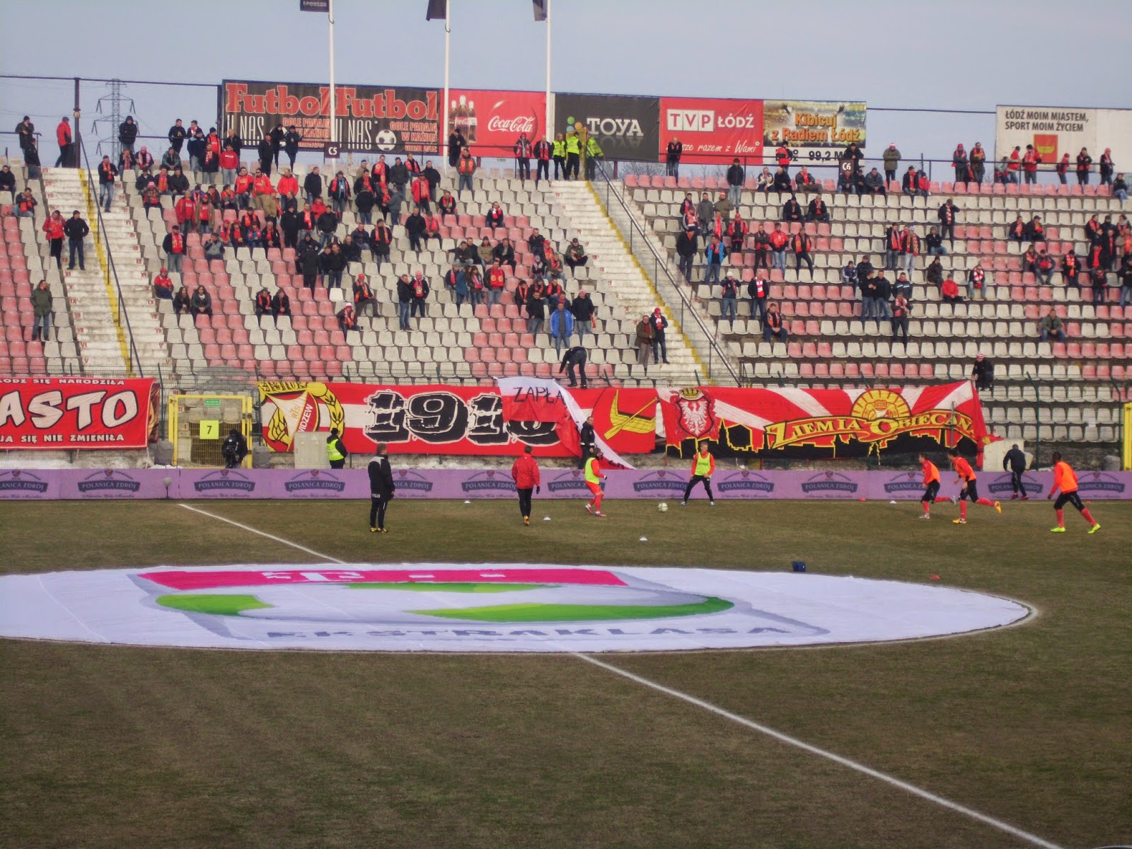 Auch die Fahrt per abenteuerlicher Tram zum Stadion Widzewa verheißt wenig hoffnungsträchtigeres: Überall ungemein runtergekommene Häuser, nur aufgelockert von einigen moderneren Einkaufszentren. Die „Arena“ selbst ist noch älteren Baujahres und typische Marke Ostblock, soll allerdings schon bald durch ein moderneres Stadion ersetzt werden. Auffällig vor allem die riesigen Flutlichmasten, die das Stadion umgeben.