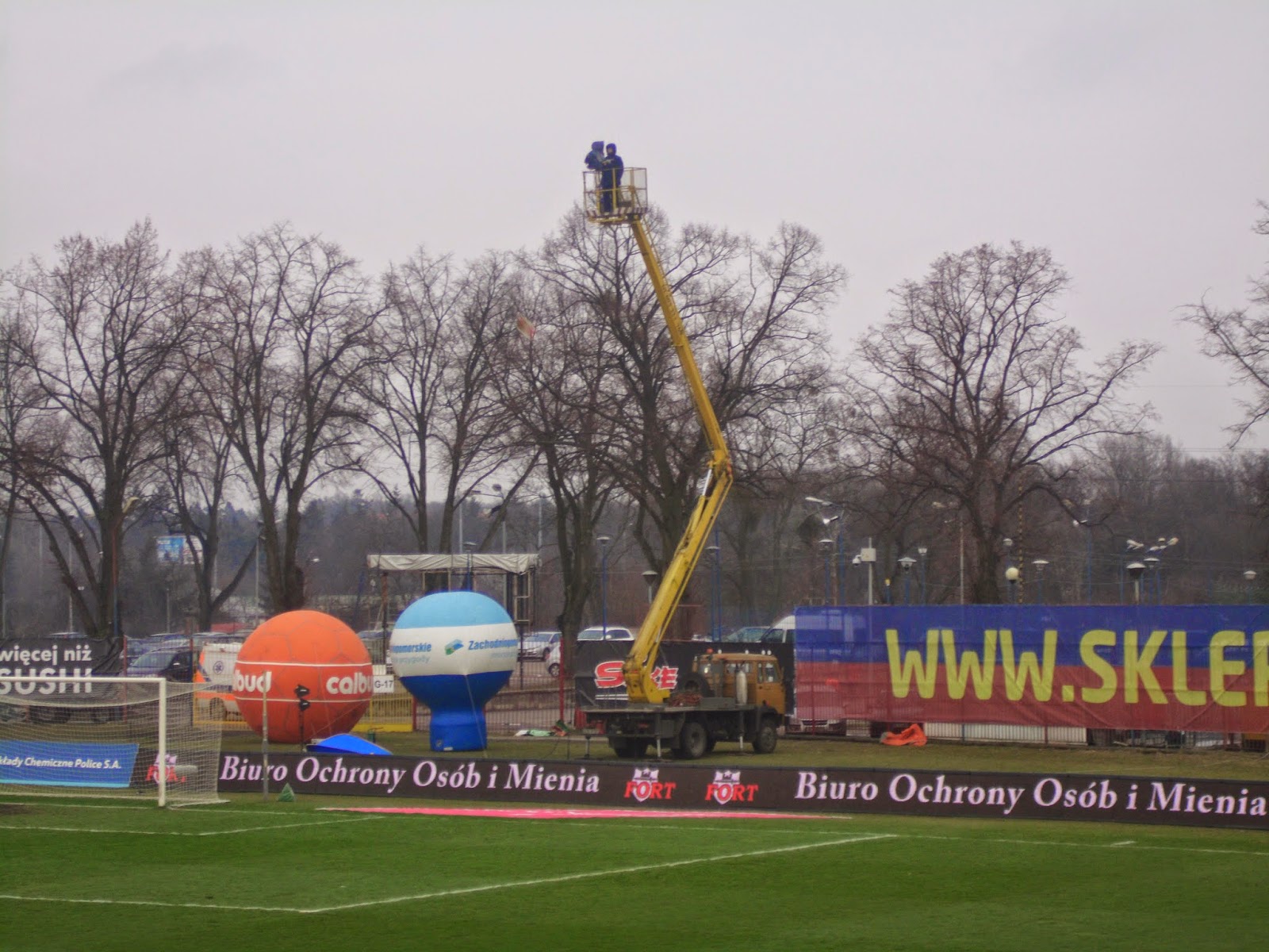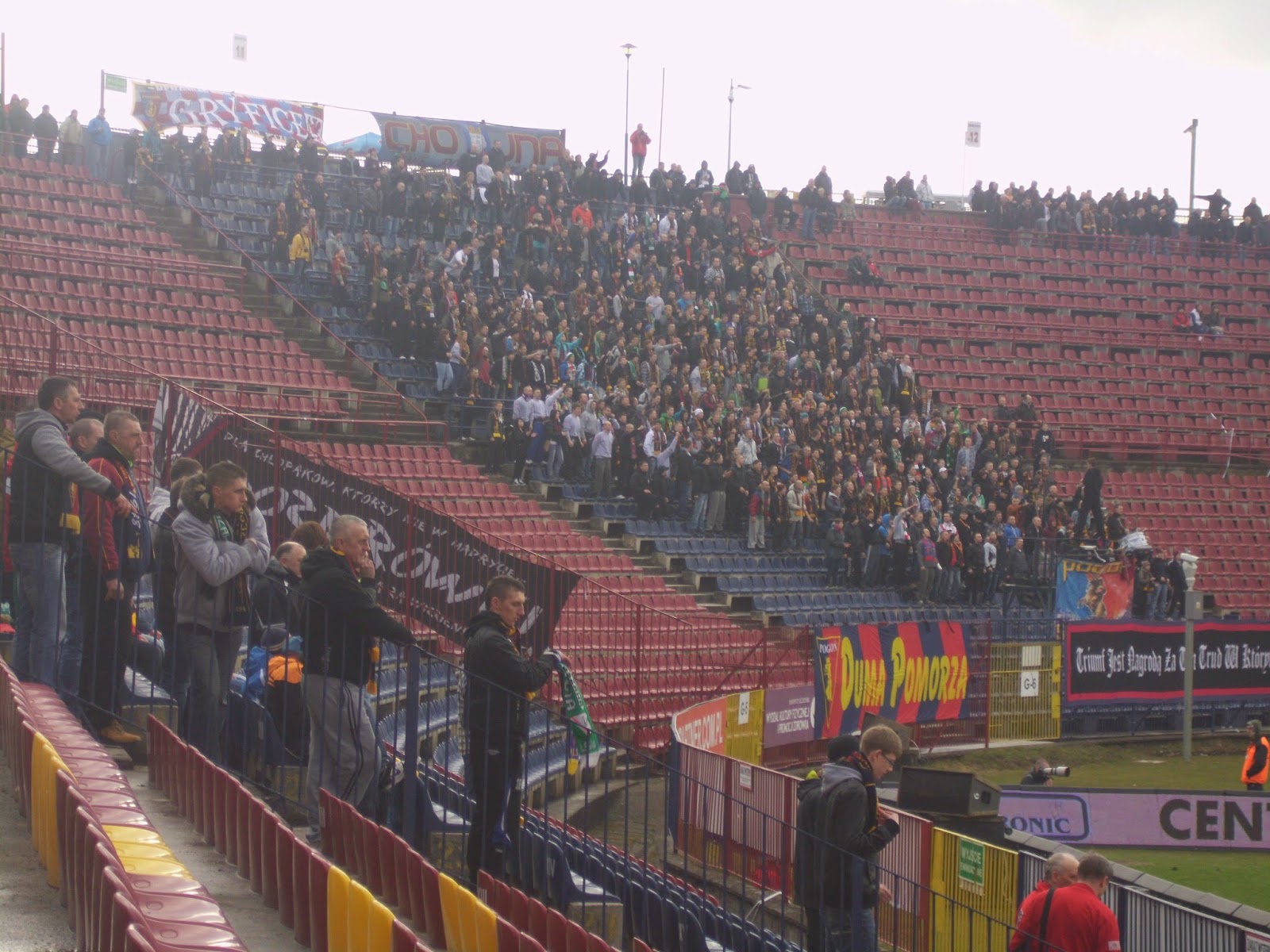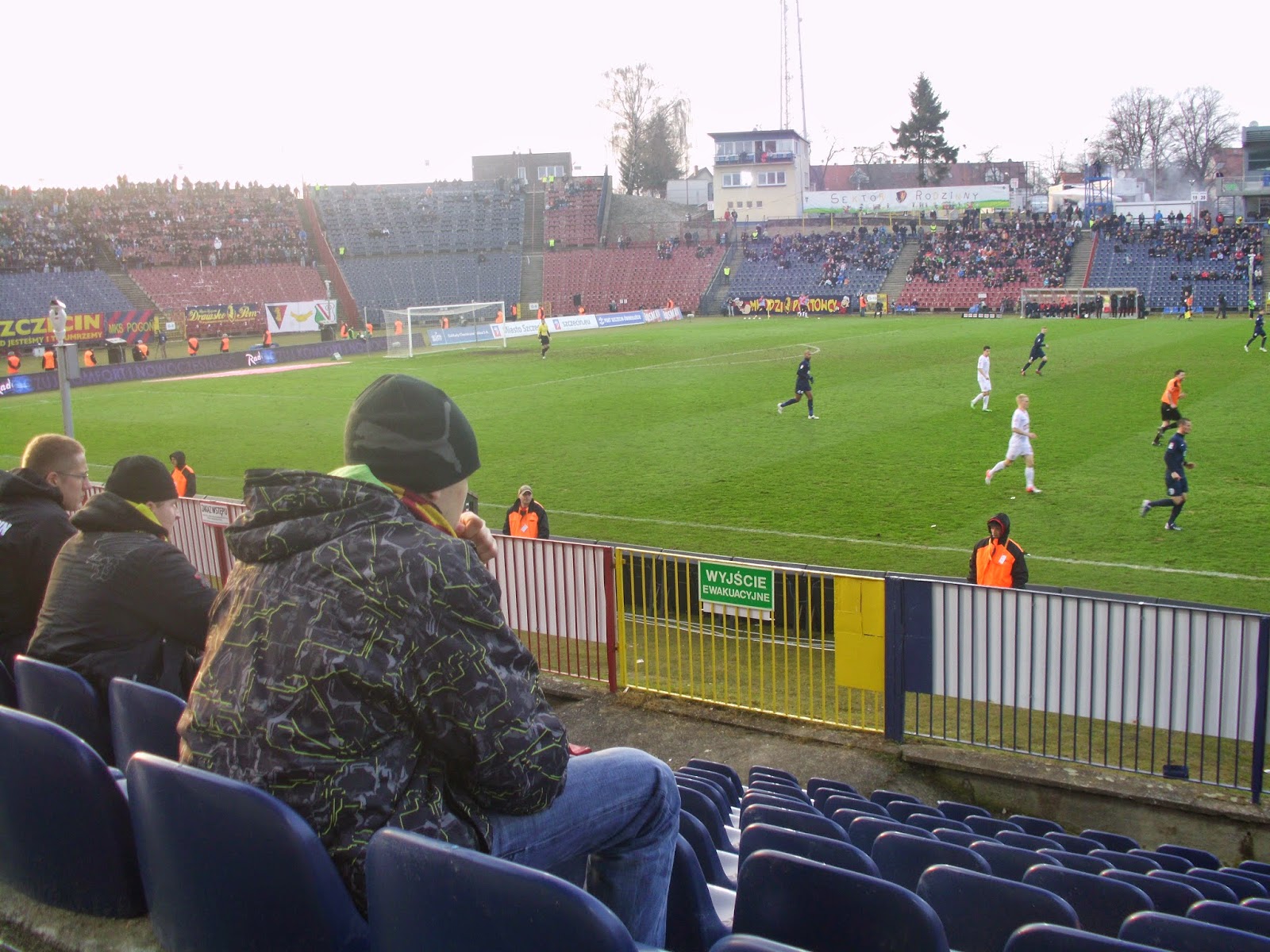 Nur rund 3.000 Zuschauer sind zu diesem Spiel gekommen, davon aber ein gar nicht so kleiner Teil aus dem ca. 600 km entfernten Lodz. Stimmung kommt trotzdem von beiden Blöcken ziemlich gut. Die Heimfans stimmen neben den Anfeuerungsrufen auch immer wieder Choräle für das befreundete Legia Warschau an.
