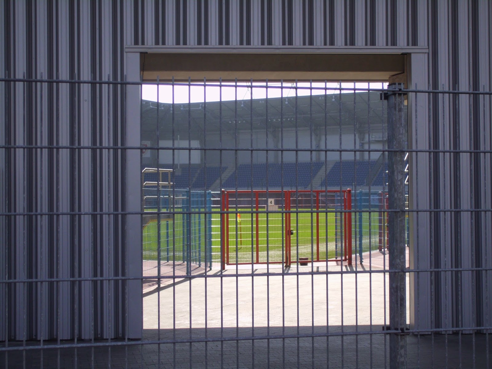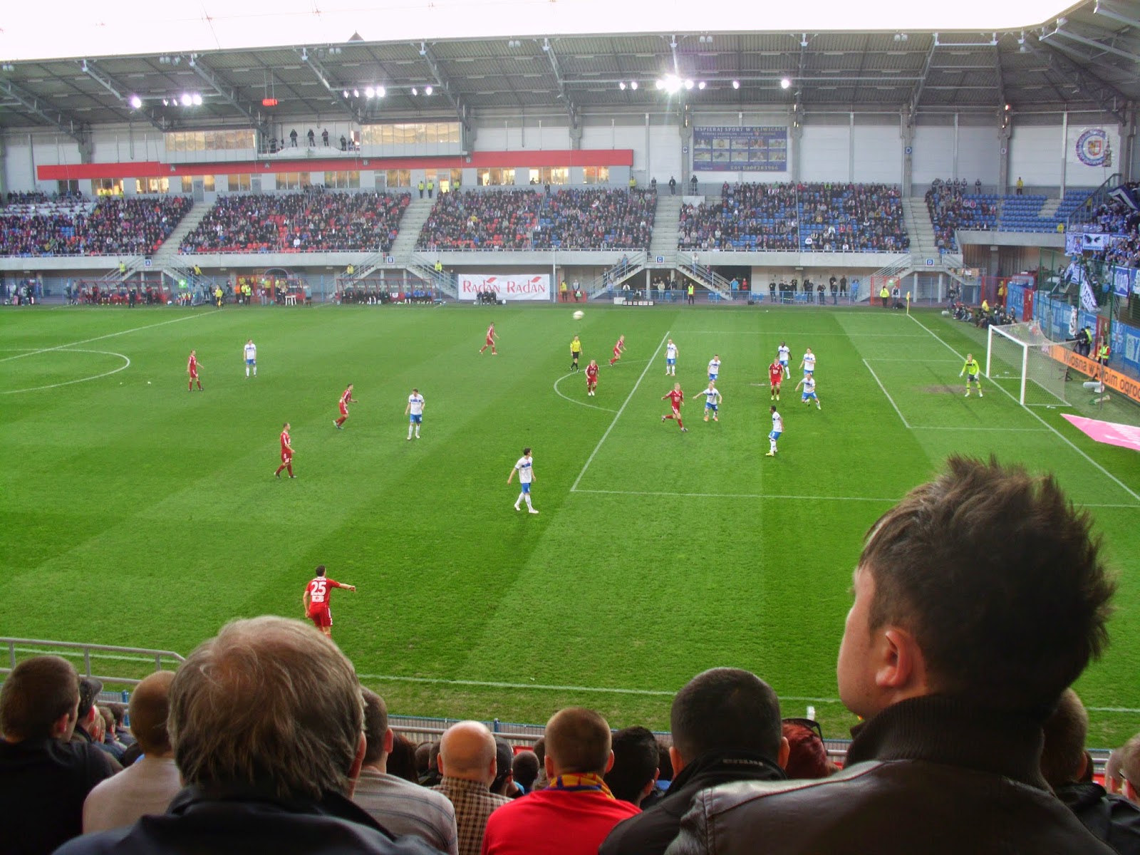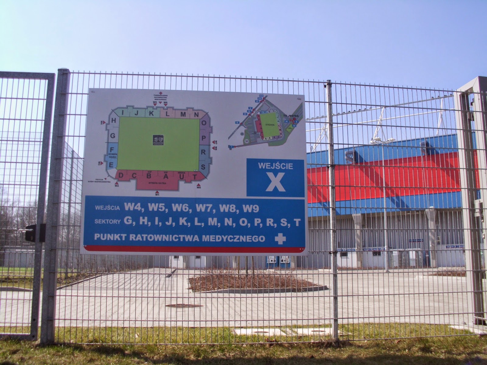 Die zweite Überraschung erleb ich dann vor dem Stadion, wo ich mir nämlich eher eine Ostblockschüssel alá Lodz erwartet hatte (Infos dazu waren vorher schwer zu bekommen): Unweit des Stadtzentrums, gleich hinter einem Friedhof, taucht plötzlich ein nigelnagel neues Kleinstsadion auf, dass echt eine sehr nette Erscheinung darstellt.