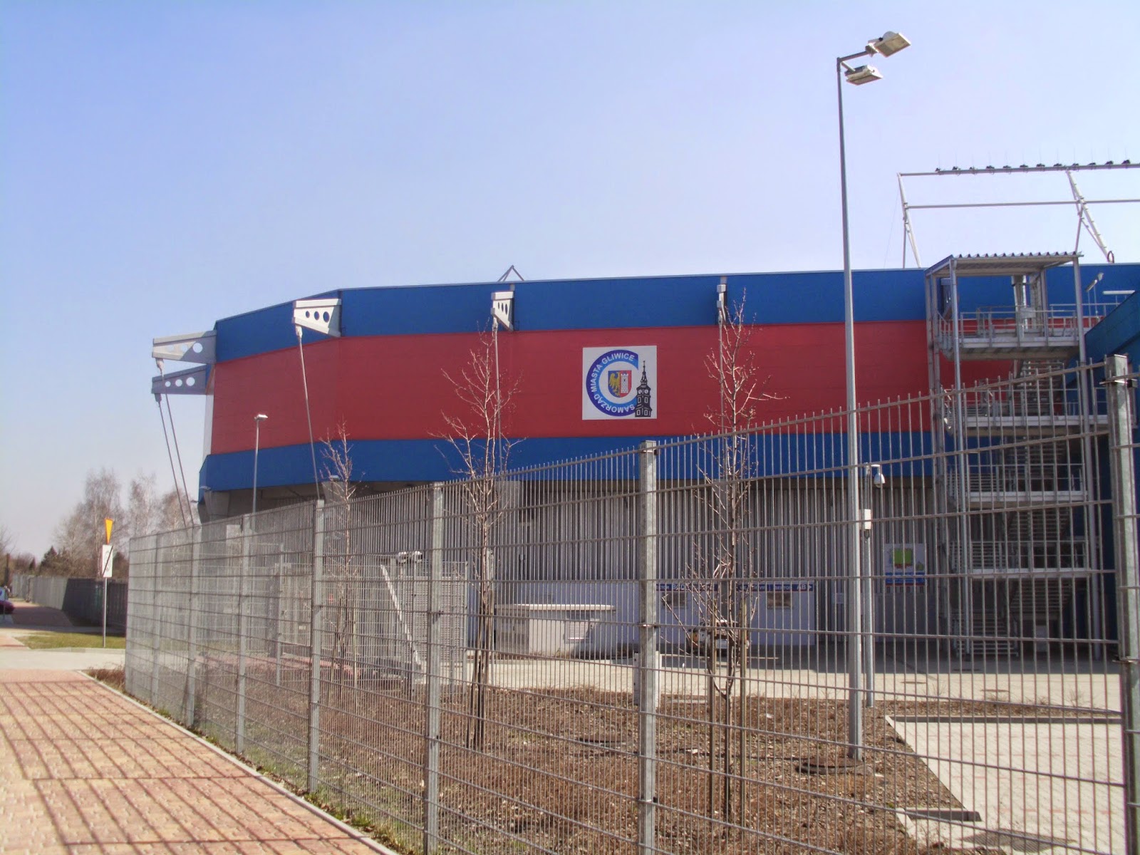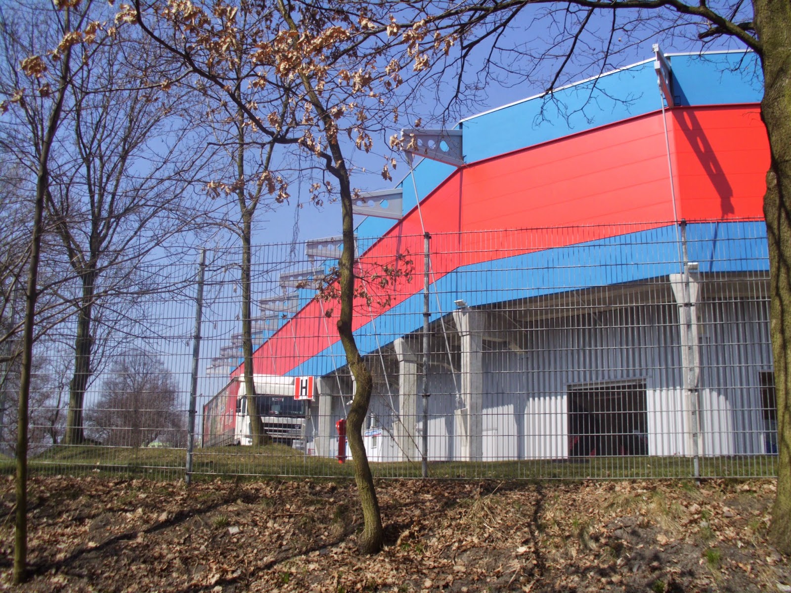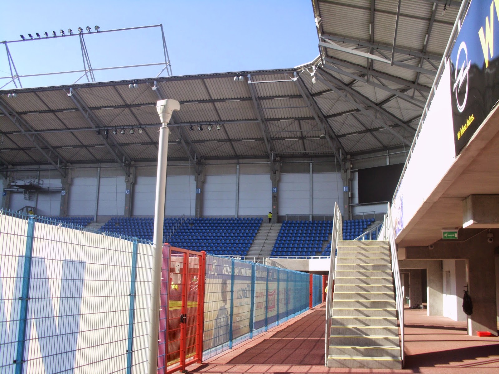 Die zweite Überraschung erleb ich dann vor dem Stadion, wo ich mir nämlich eher eine Ostblockschüssel alá Lodz erwartet hatte (Infos dazu waren vorher schwer zu bekommen): Unweit des Stadtzentrums, gleich hinter einem Friedhof, taucht plötzlich ein nigelnagel neues Kleinstsadion auf, dass echt eine sehr nette Erscheinung darstellt.