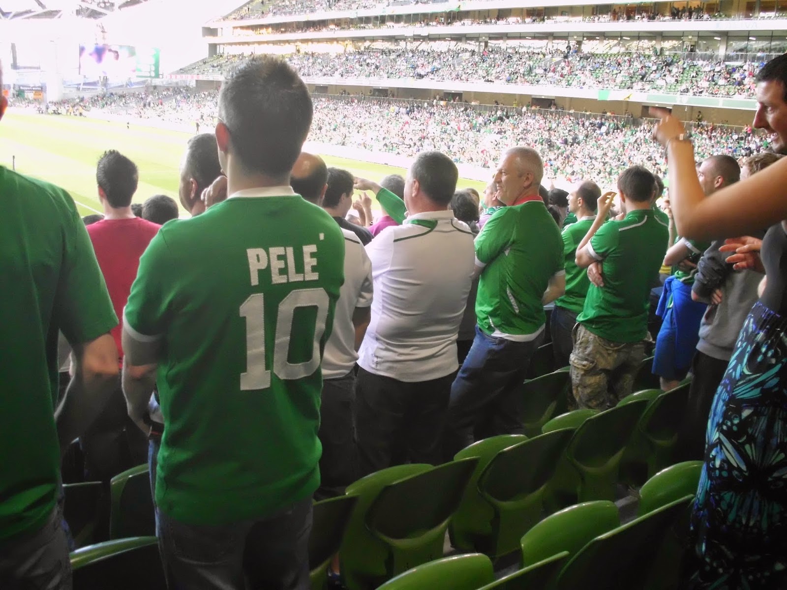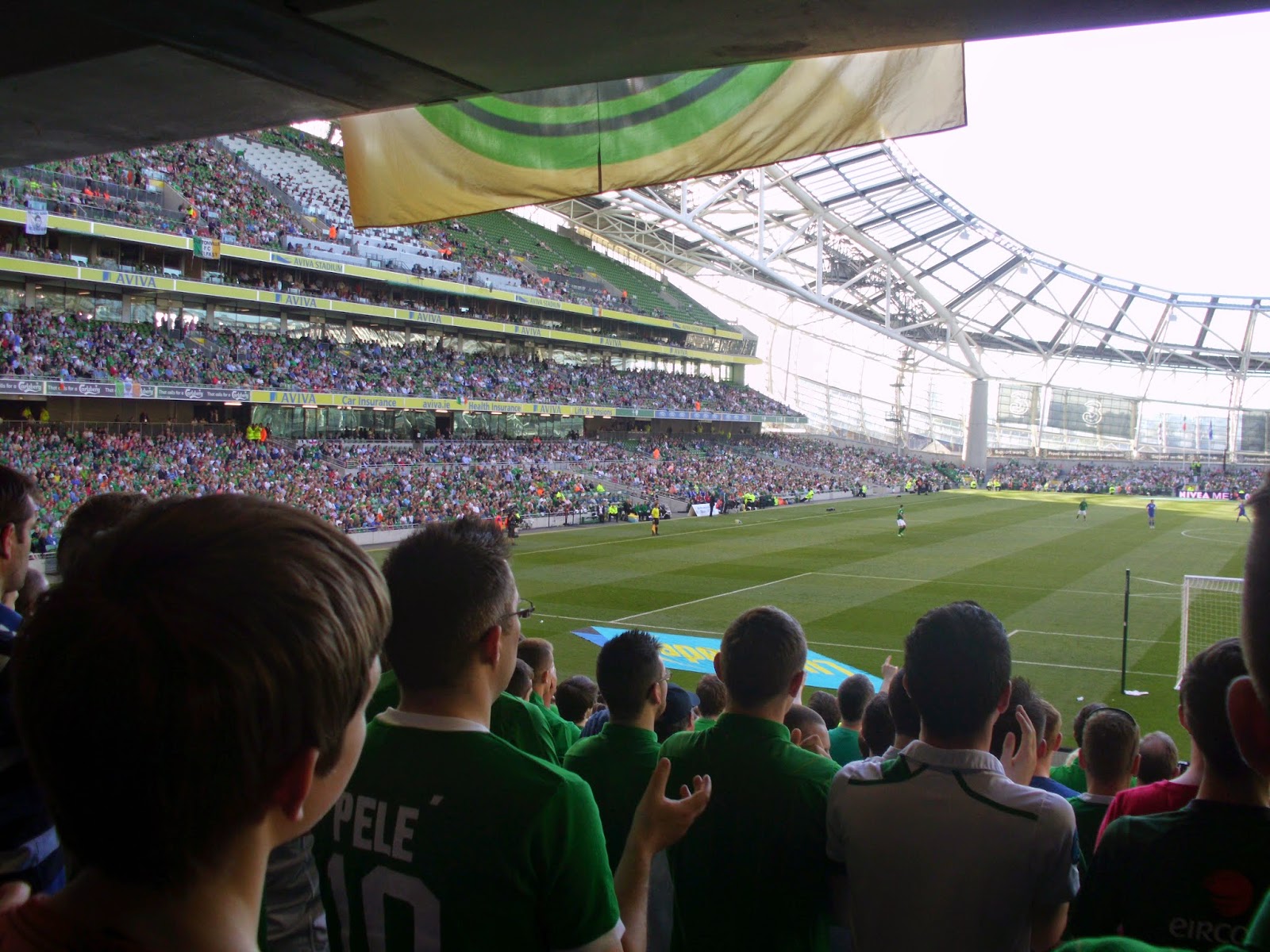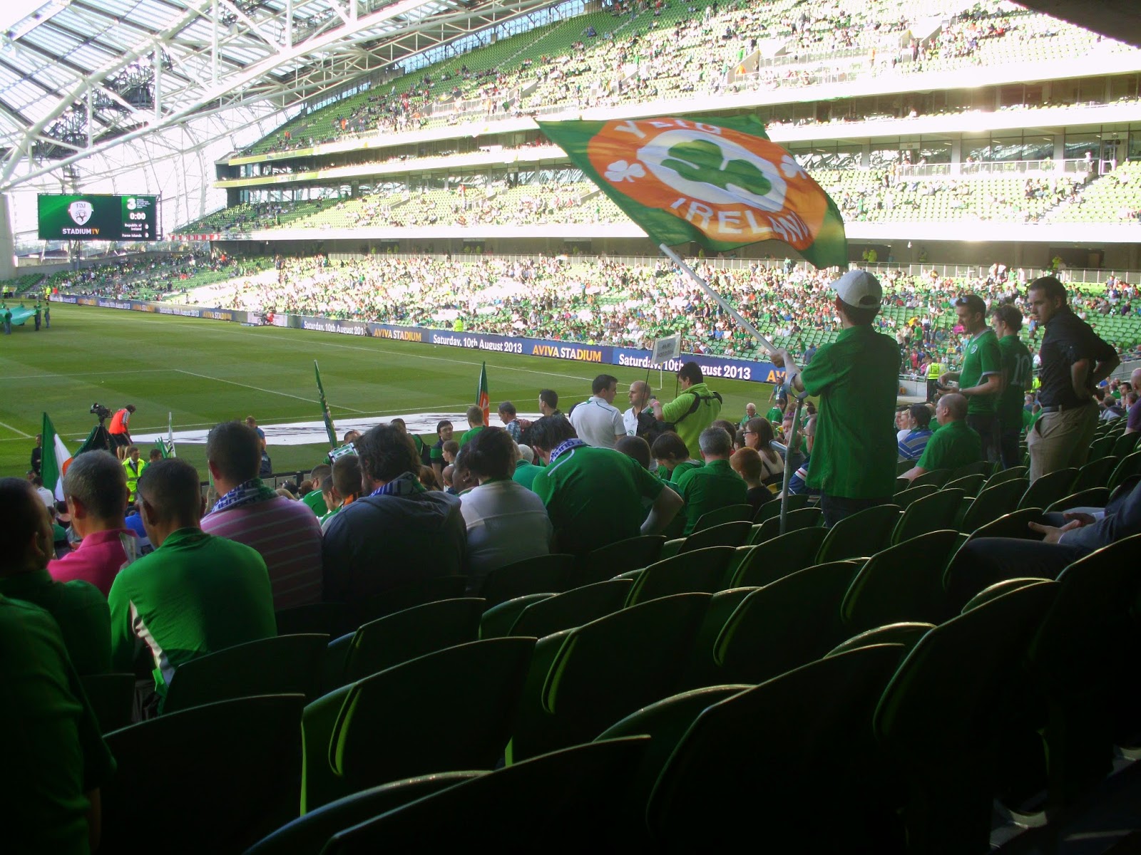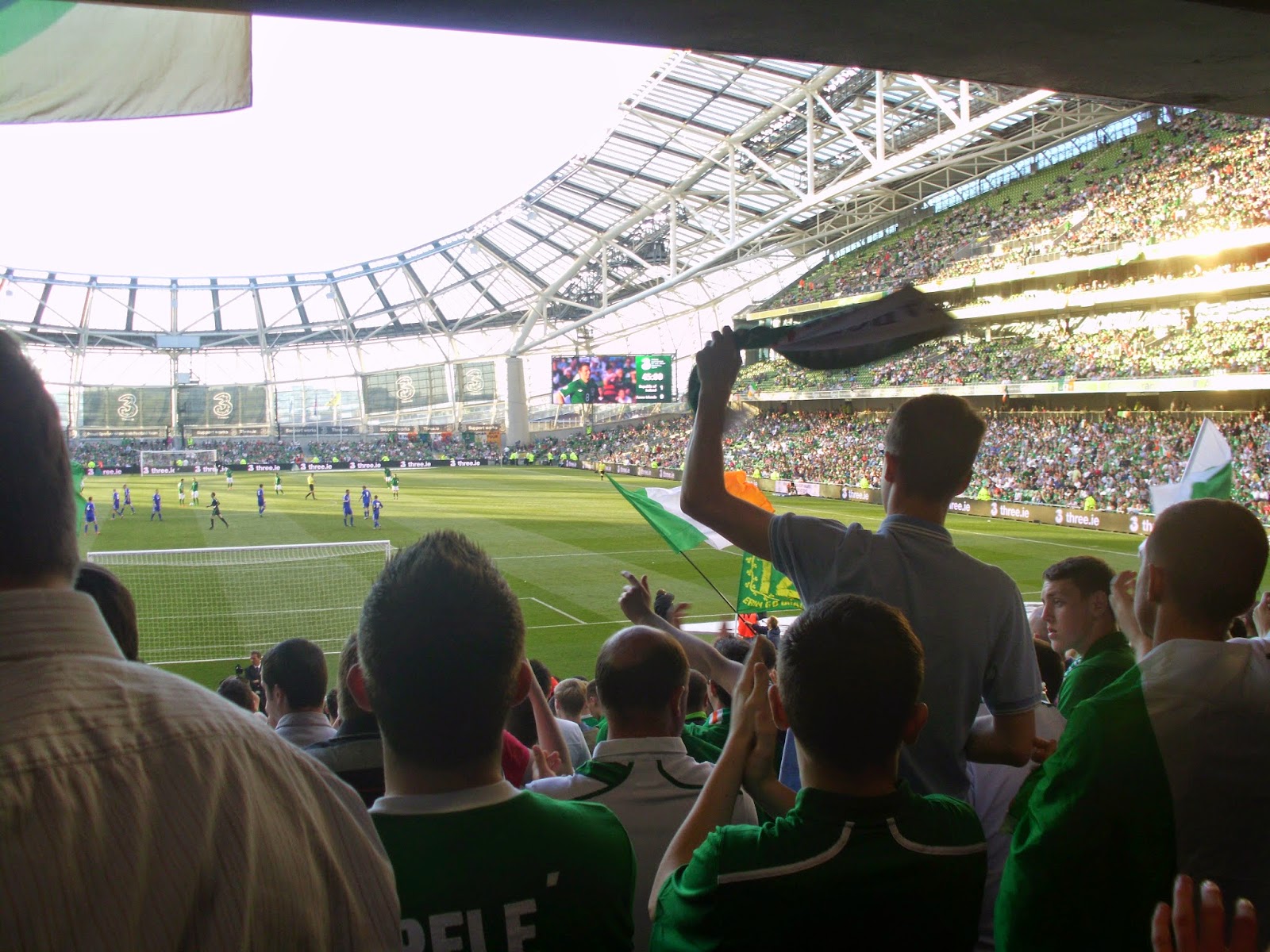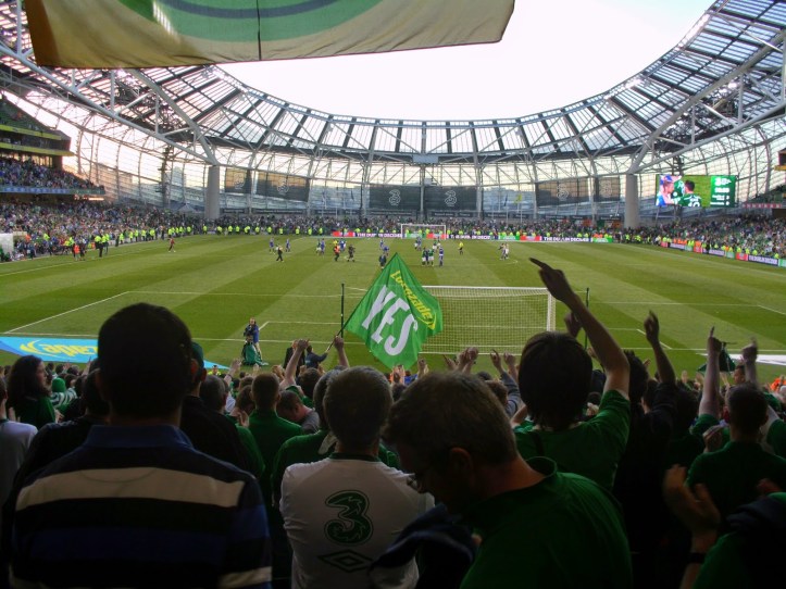 Als direkte Folge des etwas undurchsichtigem Vorverkaufs lande ich beim Match im Sektor direkt hinter dem Tor und damit mitten in der irischen Singing Area – soll freilich schon schlimmeres passiert sein. Bis kurz vor dem Spiel füllt sich das Stadion nur sehr zäh, um dann ziemlich rasch sehr voll zu werden – knapp über 35.000 werden heut wohl hier sein (32.000 sind dann die offiziellen Zahlen). Mein Abschnitt wird dabei kurzerhand – sehr zum Missfallen einiger älterer Anhänger in den hinteren Reihen – vom All-Seater zum reinen Stehsektor, wobei von den umliegenden Gates zahlreiche steh- und singfreudige Fans zuströmen.