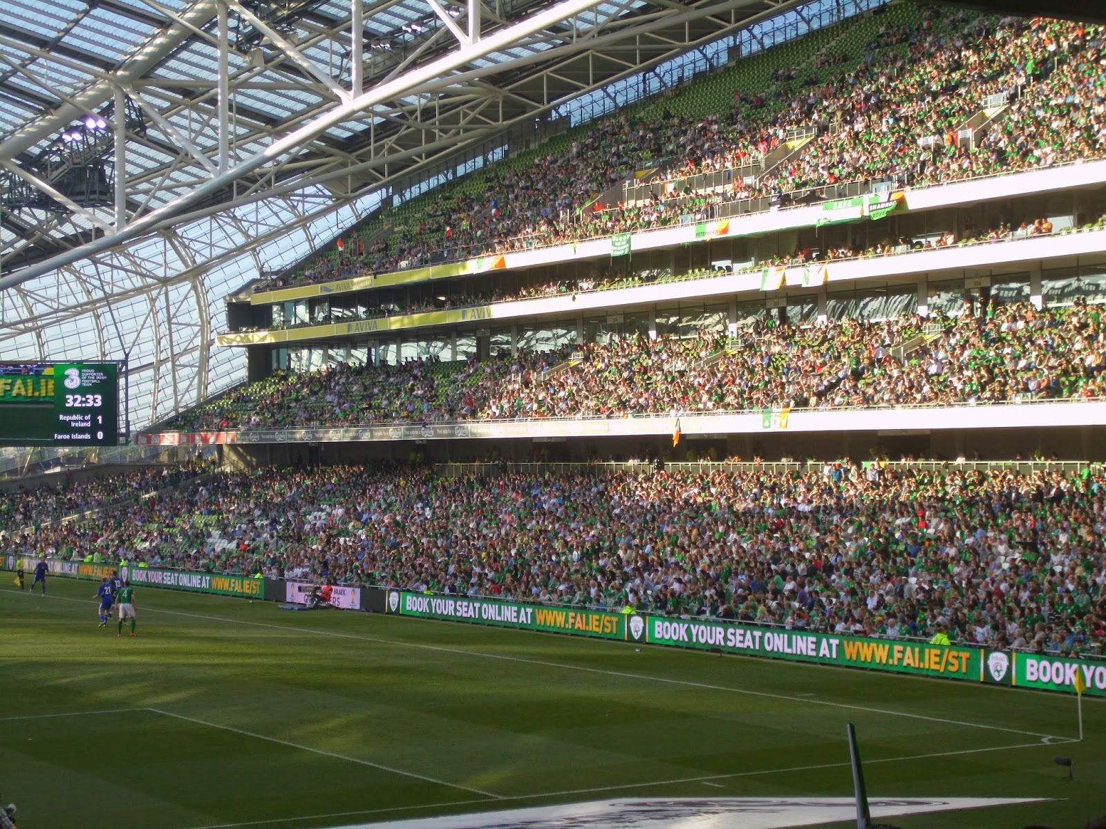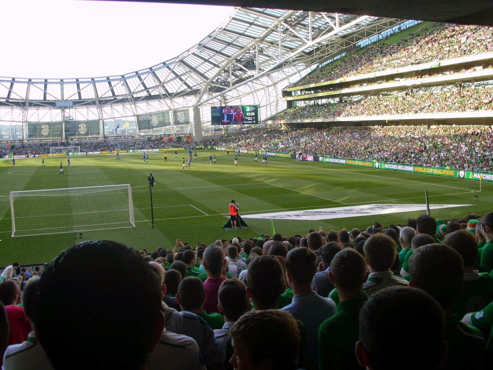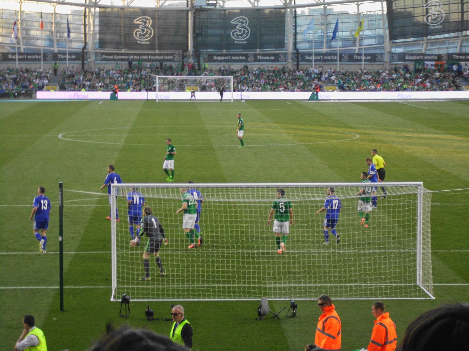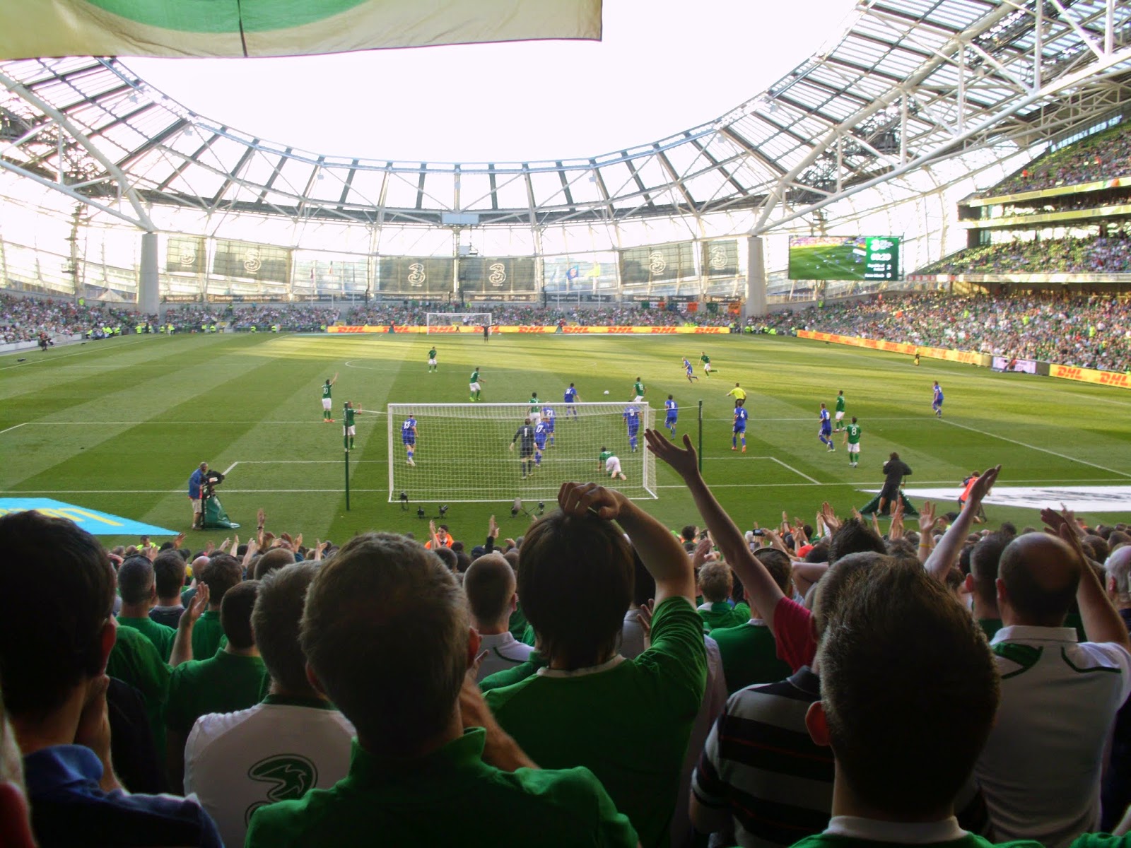 Als direkte Folge des etwas undurchsichtigem Vorverkaufs lande ich beim Match im Sektor direkt hinter dem Tor und damit mitten in der irischen Singing Area – soll freilich schon schlimmeres passiert sein. Bis kurz vor dem Spiel füllt sich das Stadion nur sehr zäh, um dann ziemlich rasch sehr voll zu werden – knapp über 35.000 werden heut wohl hier sein (32.000 sind dann die offiziellen Zahlen). Mein Abschnitt wird dabei kurzerhand – sehr zum Missfallen einiger älterer Anhänger in den hinteren Reihen – vom All-Seater zum reinen Stehsektor, wobei von den umliegenden Gates zahlreiche steh- und singfreudige Fans zuströmen.