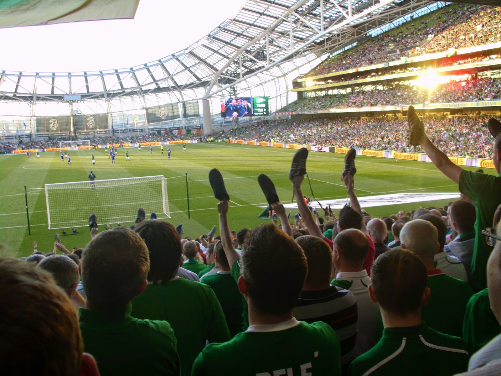 Die Chants beweisen dann auch, warum es sich durchaus auszahlt, mal ein Irland-Match gesehen zu haben. In ihren Variationen können die „Boys in green“ es durchaus mit Vereinsmannschaften aufnehmen – in der Lautstärke sowieso. Einen netten Gag zeigen die Fans in der zweiten Halbzeit, als sie dem Stadion ihre Schuhe entgegenstrecken, nachdem der Aufforderung „Stand up for the boys in green“ zuvor nicht mehr alle Sektoren gefolgt waren.