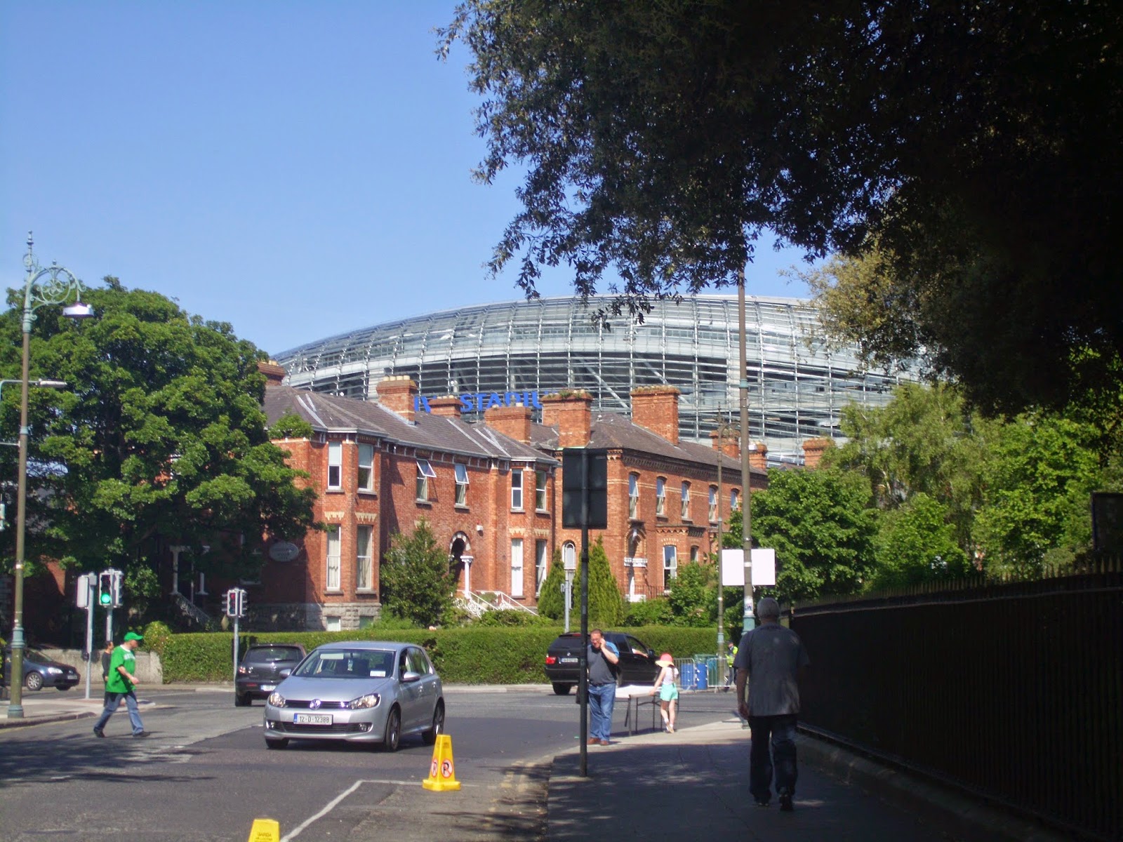 Da ich weit vor Anpfiff die Karte für das Match am Boxoffice abhole, bleibt noch genügend Zeit, die Gegend zu erkunden. Auch hier zeigt sich die Stadt als eine schier riesige Ansammlung von zwei- bis dreigeschossigen Gebäuden, die nur ganz selten von „Hochhäusern“ (selten mehr als zehn Stöcke) überragt werden. Nach längerem Suchen finde ich ein Pub mit Biergarten, das für mein Pregame-Guiness geradezu ideal ist (Bild5). Gemeinsam mit zwei Färöer-Fans und immer mehr werdenen irischen Anhängern genieße ich so die lockere Atmosphäre – und die Spätnachmittagsonne (!) – in dem Viertel.