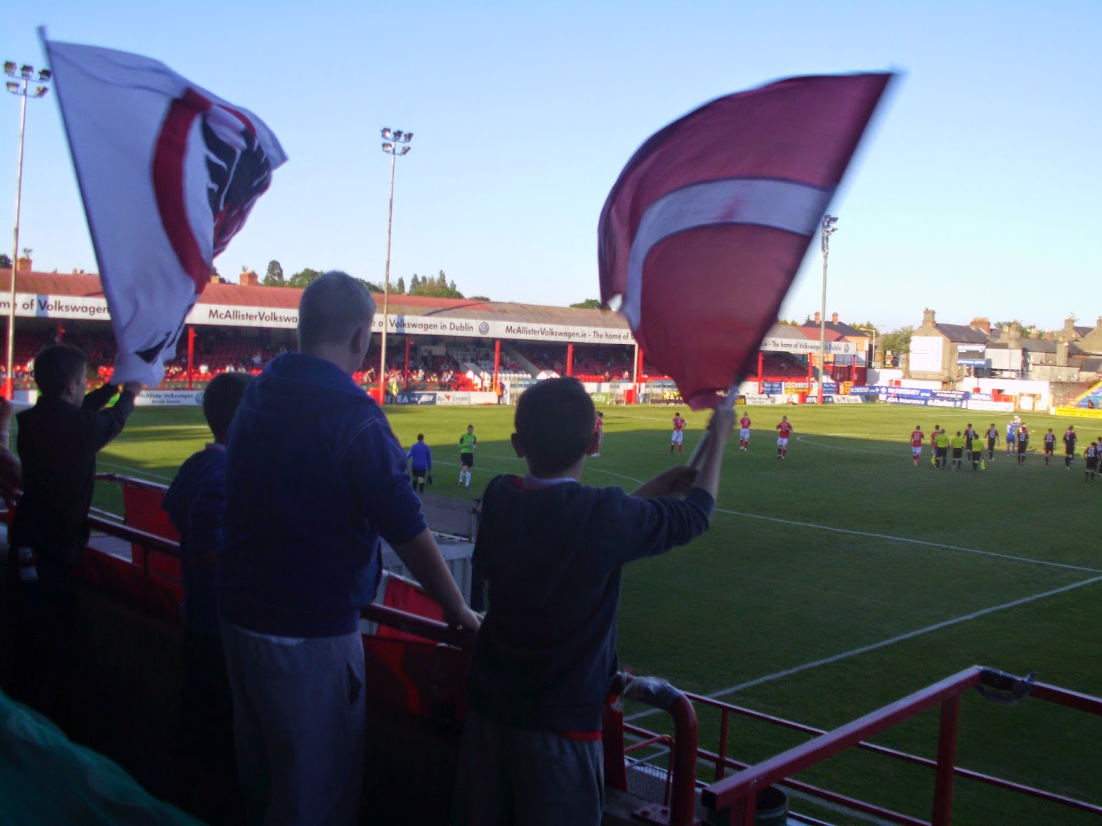 Unter der Haupttribüne befindet sich ein Pub, auf dem Weg zum Fansektor eine echt gut ausgestattete Fressmeile, man kann durchaus schlechter ausgestattet Fußball schauen. Das Spiel beginnt mit dem Gedenken an einen zwölfjährigen Shelbourne-Fan, der bei einem Autounfall getötet wurde. Hier ist das allerdings keine Schweigeminute, sondern „A minute of applause“ – kommt sehr gut.