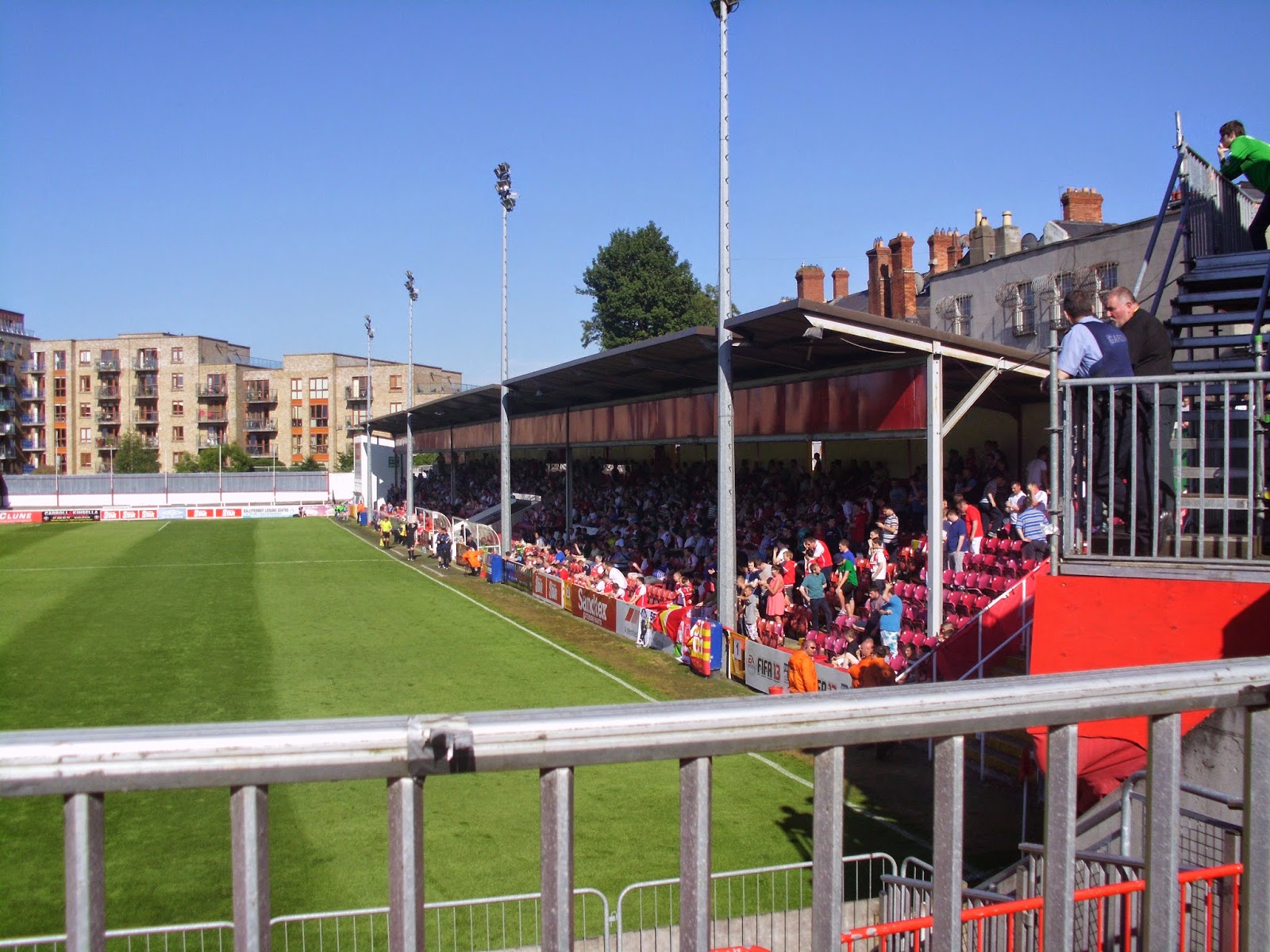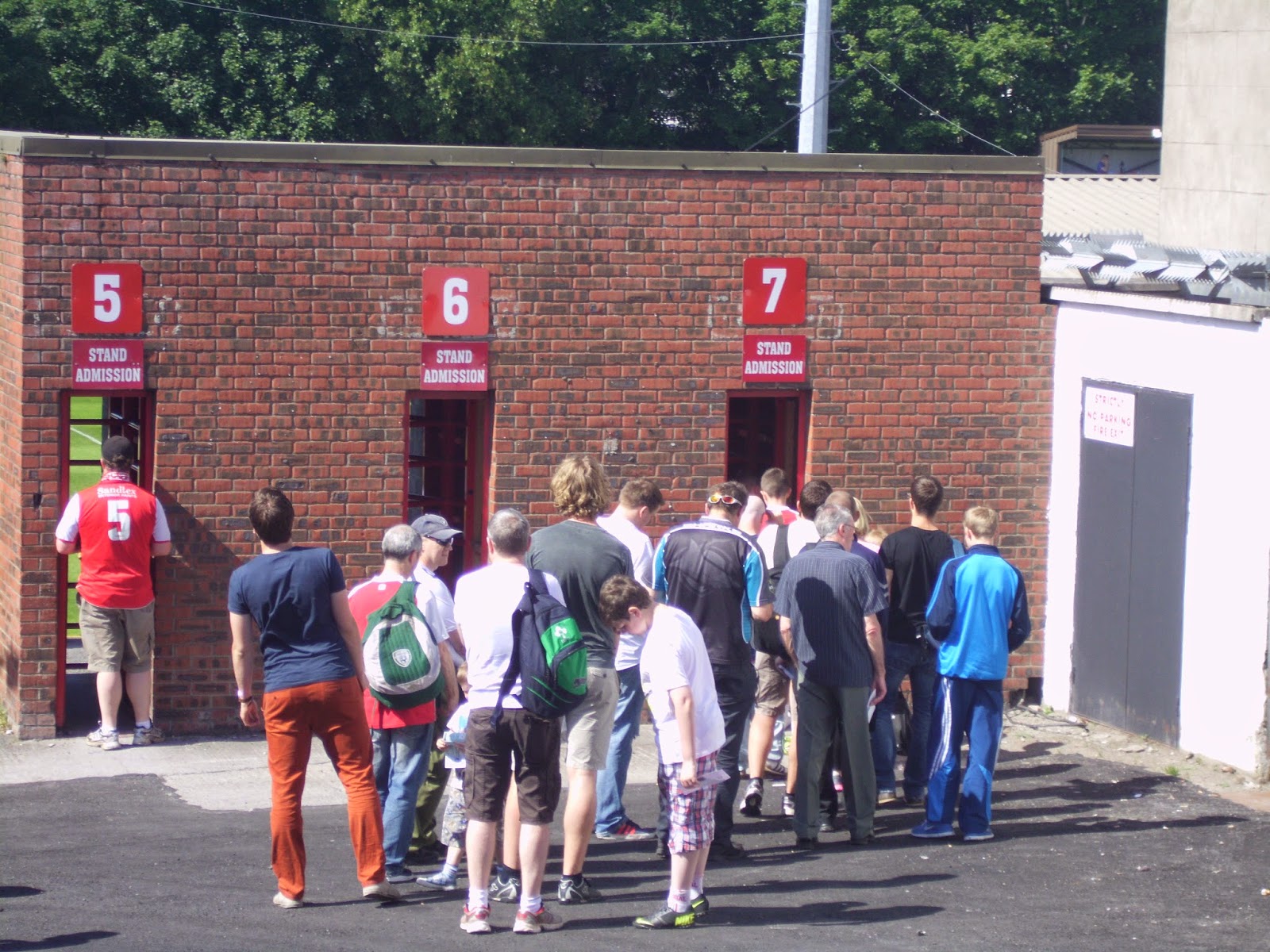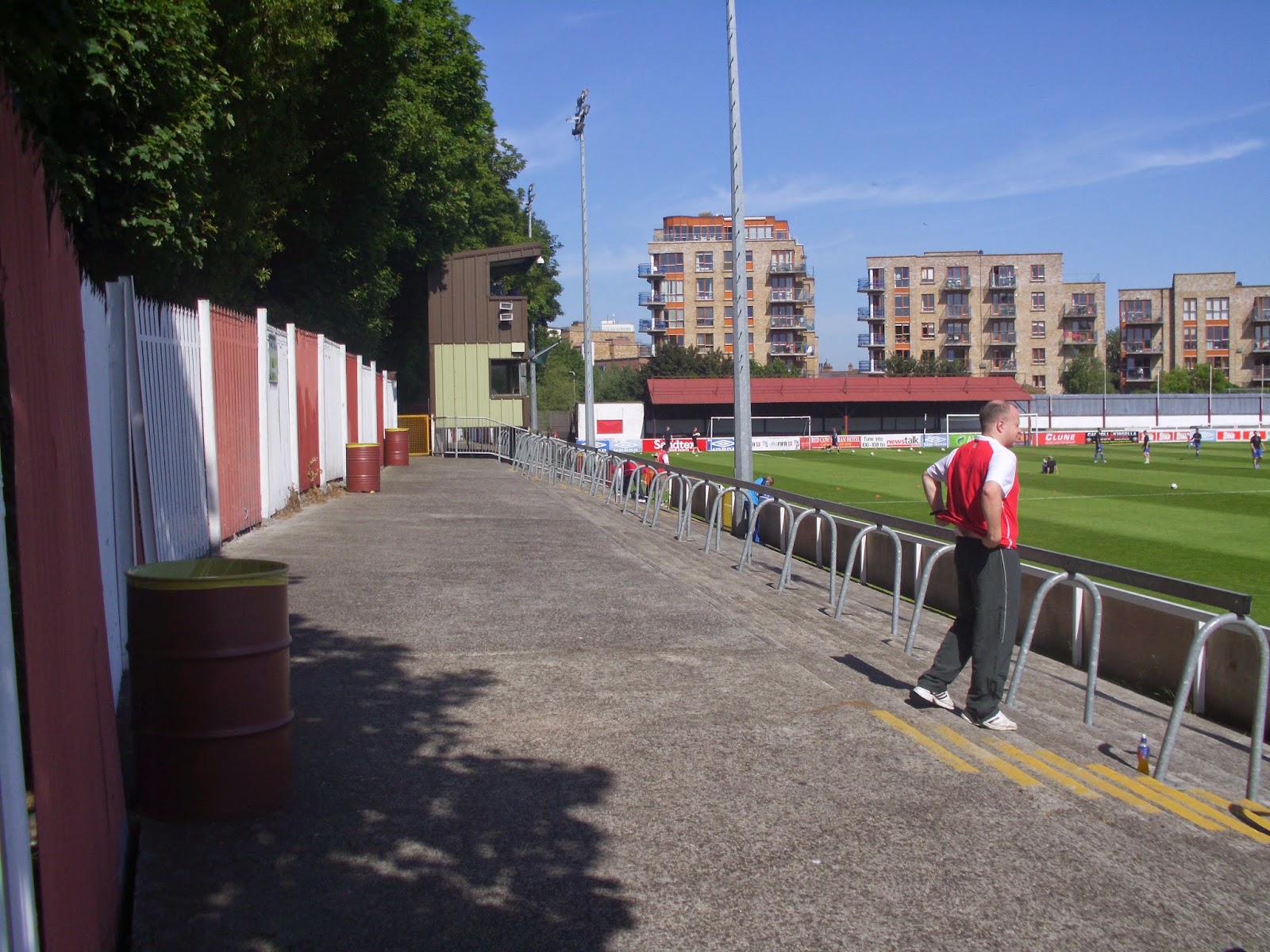 An der Emmet Road angekommen weist vorerst nichts darauf hin, dass sich hier wo ein Stadion befinden soll. Der Richmond Park versteckt sich abgesenkt hinter einer Häuserfront. In einem dieser Gebäude erstehe ich mein Ticket für 15 Euro und warte dann auf den Einlass eine Stunde vor Spielbeginn. Vor den Gates versammelt sich bereits eine frohe Hopper-Schar, neben einem Engländer etwa auch zwei Schotten, die meinen Eindruck vom gestrigen Ländermatch teilen. Beim Spiel erspähe ich dann noch einige Briten sowie jede Menge Deutsche – teils „stilecht“ in den Trikots ihrer Vereine.