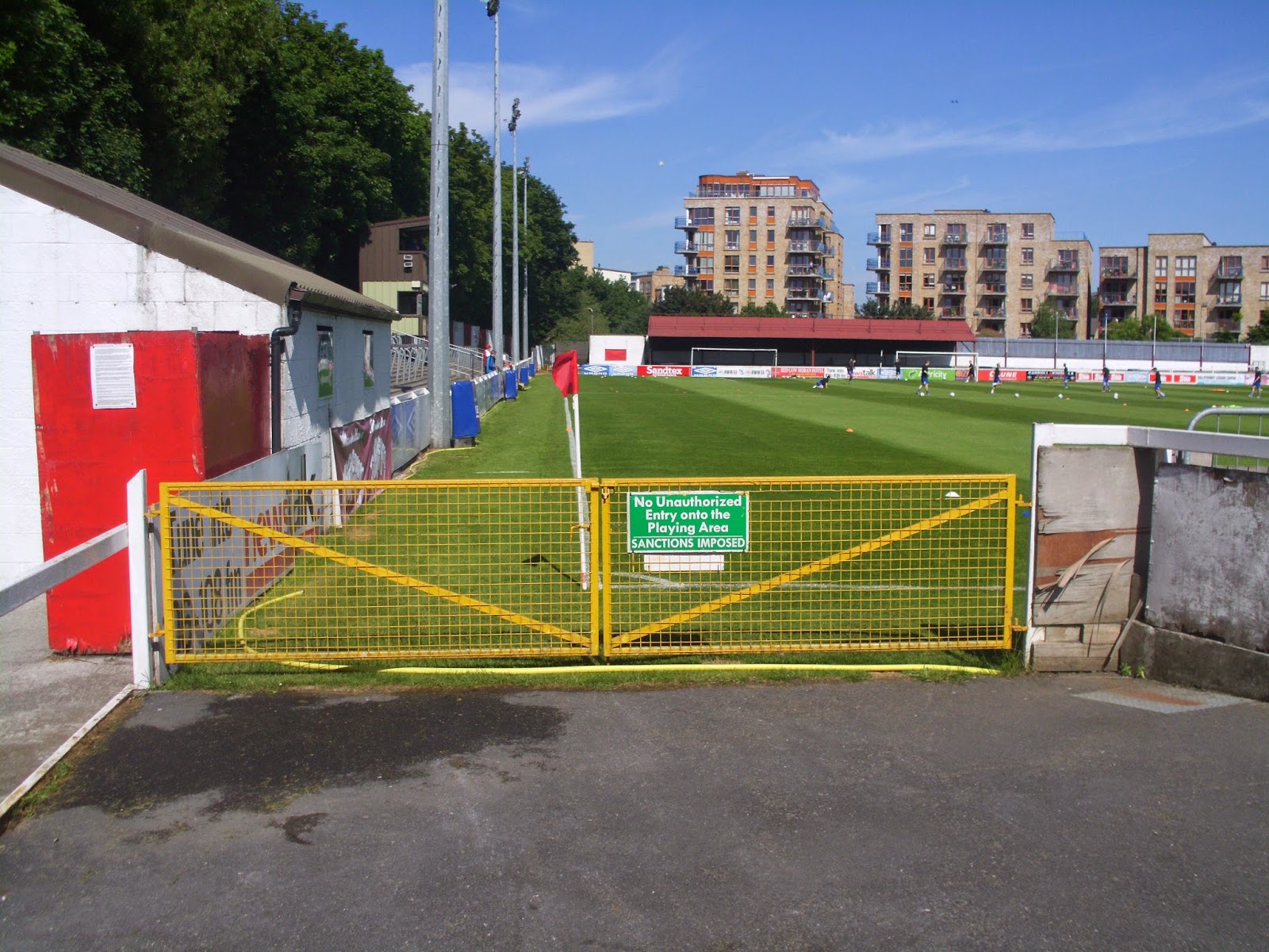 Der Richmond Park selbst ist ein nettes Kleinstadion mit alter Haupttribüne, die einen eigenen Family Stand („Mind your language“!) aufweist. Dem gegenüber befindet sich eine Stehplatztribüne, die ganz gut gefüllt wird. Hinter dem offenbar gesperrten Stehplatzbereich beim Tor ragen zudem noch die – ganz auf Sportclub-Style – „VIP-Wohnbauten“ in die Höhe. Für Gelächter und meine Aufmerksamkeit sorgt bei der Aufstellung der Name Robbie Williams (auch genau so geschrieben), der bei Limerick in der Abwehr kickt.