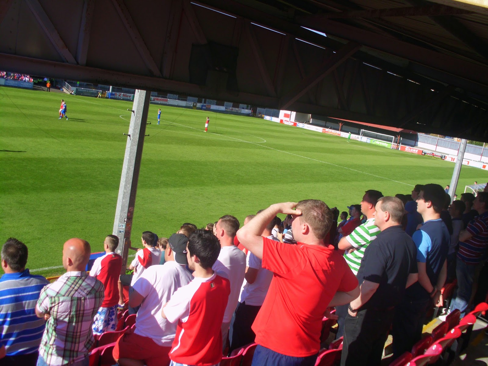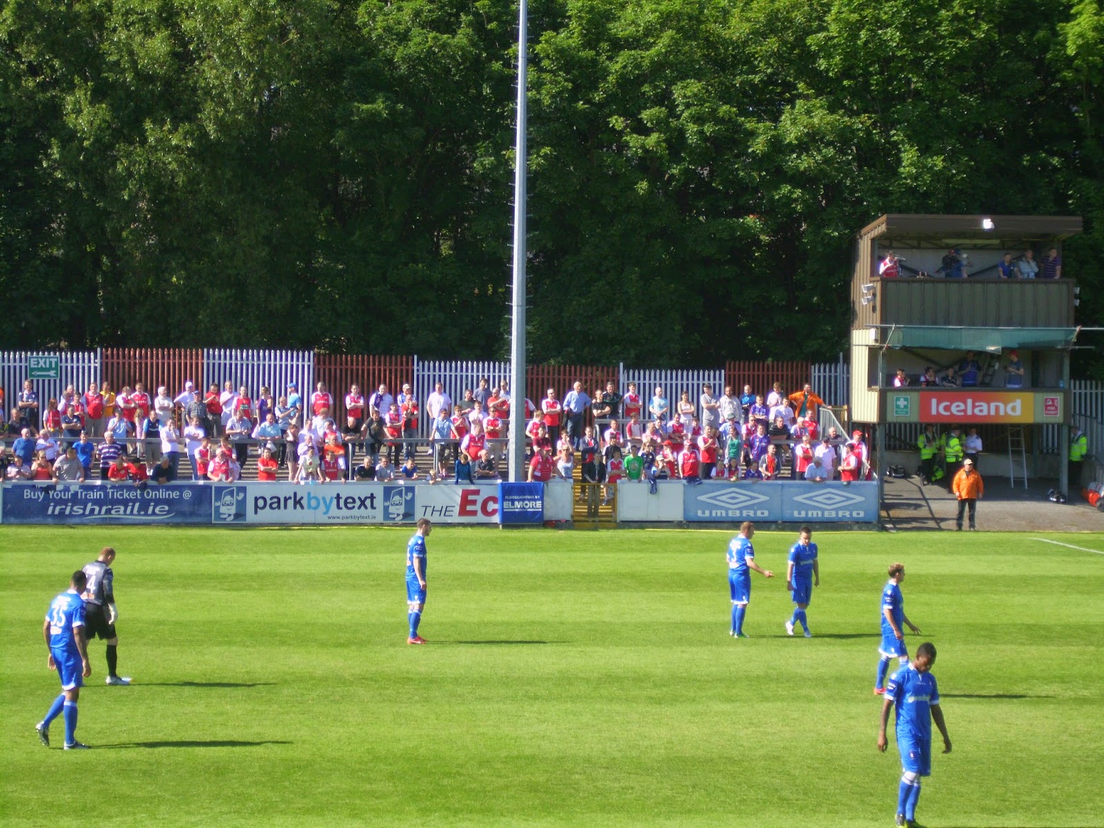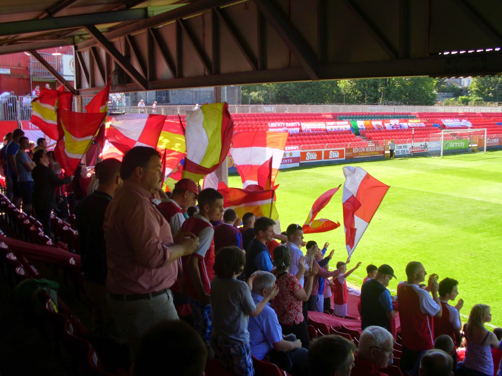Stimmung machen, auch in Irland mittlerweile, die Ultras („Shed End Invincables“). Der kleine, aber feine Hardcore-Sektor besteht vor allem aus Jugendlichen, die älteren Semester stehen eher gegenüber. Die Atmosphäre unter den geschätzten 3.000 Zuschauern ist ganz nett – viele Chants kommen ganz gut. Vor allem rund um die Tore geht aber auch der Rest des Stadions sehr gut mit.