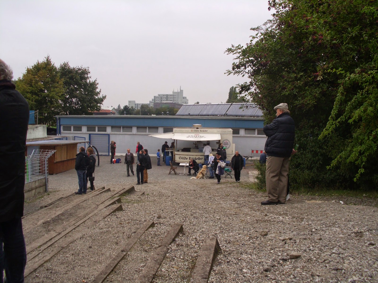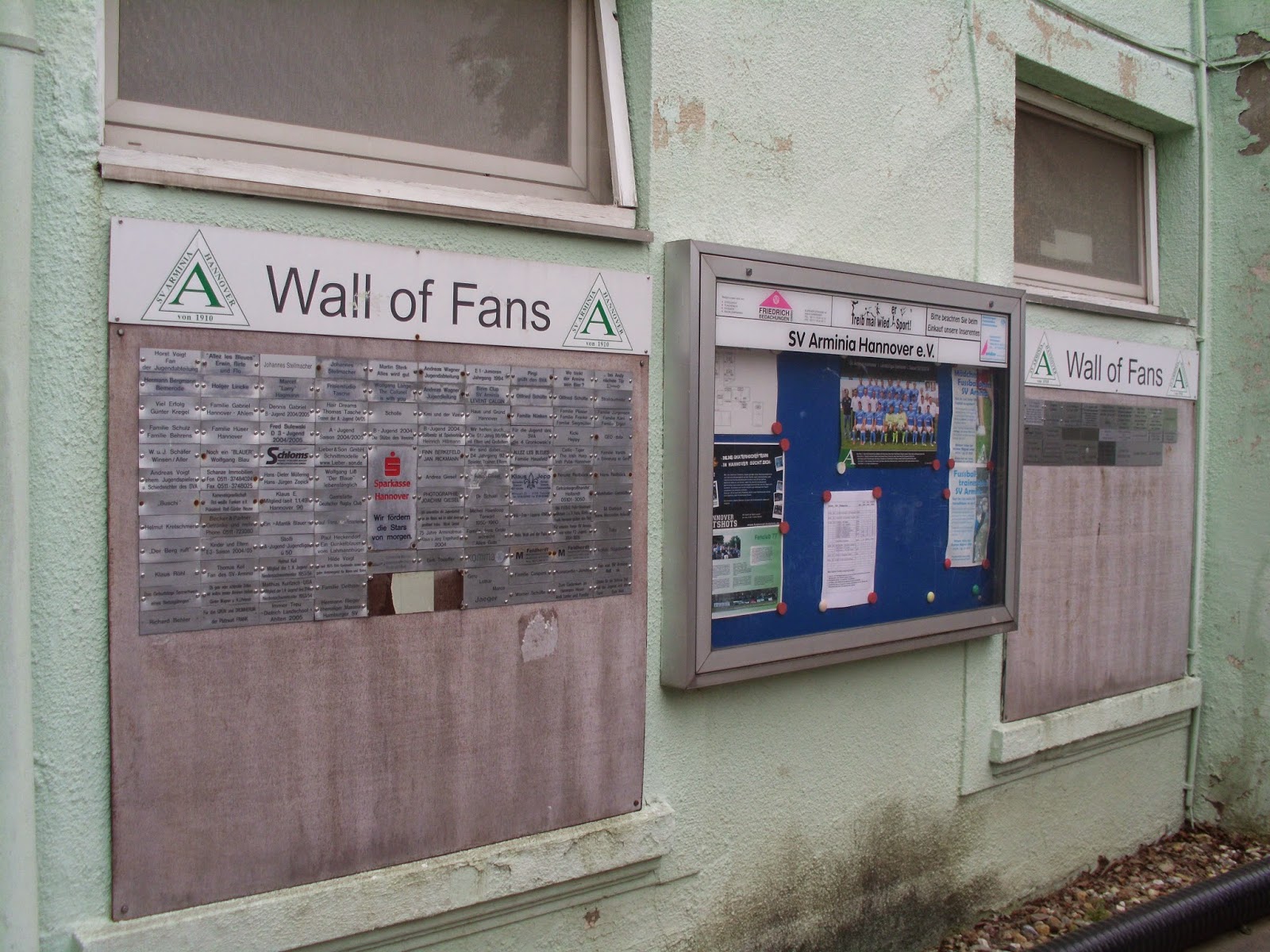 Während der ersten Halbzeit in der Fankurve erfahre ich so einiges: Erst wird einem Jugendspieler der Spenden sammelt mitgeteilt, dass er „Ja nicht zu den Roten (also 96)“ gehen soll, dann erkennt einer der Fans meinen Austria-Salzburg-Pulli und nimmt mich zum „Schnacken“ mit zu seinen Freunden hinterm Tor. Dort erfahre ich, dass er 10 Jahre in Valencia gelebt hat und seitdem glühender Levante-Anhänger ist – macht ihn gleich sympathisch. Der „künstliche Hype“ um die Roten stört ihn ziemlich und er erzählt von Zeiten, wo die Arminia noch mehr Fans hatte als 96. Zudem erfahre ich auch, dass vor dem Straßenausbau auch noch hinter dem zweiten Tor eine Tribüne stand und die Überdachung der Haupttribüne vom legendären Stadion Borussia Dortmunds, der Roten Erde, stammt. 1974 wurde es über die Autobahn nach Hannover zur Arminia transportiert.