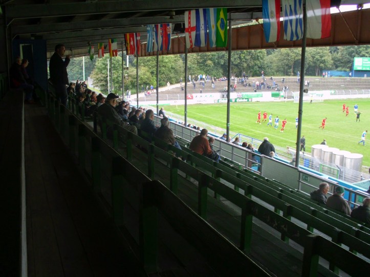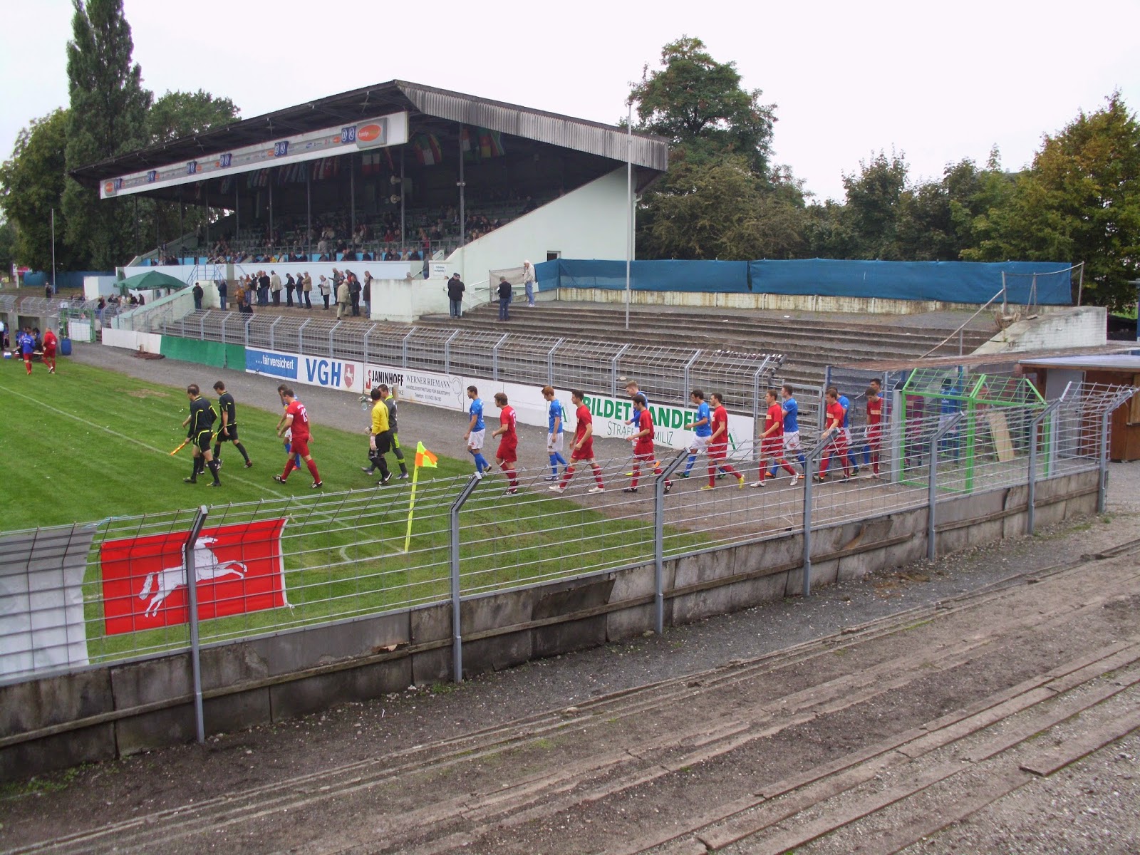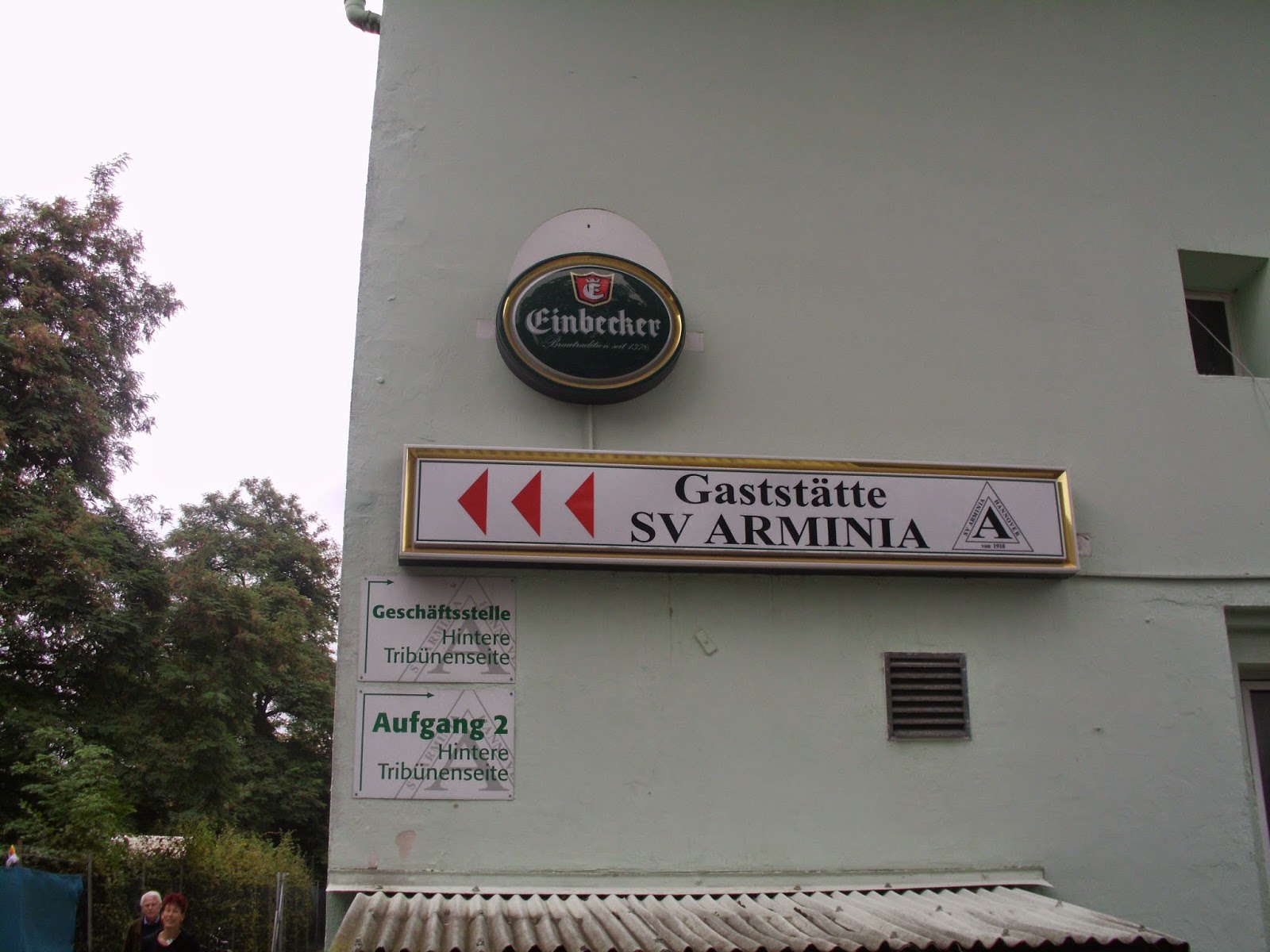 Die zweite Liga ist das höchste der Gefühle, das die Arminia jemals erleben dürfte, derzeit kickt sie in der Landesliga. Das Rudolf-Kalweit-Stadion befindet sich im Osten der Stadt und ist für einen Landesligisten doch ganz ordentlich. Die überdachte Haupttribüne, größtenteils mit Holz verkleidet (!), ist umgeben von dahindämmernden Stehplatzrängen, die von der grösseren Vergangenheit zeugen. Seit der Nachkriegszeit spielen die 1910 gegründeten „Blauen“, deren Fanartikel und eigentlichen Vereinsfarben aber schrägerweise grün sind, hier.